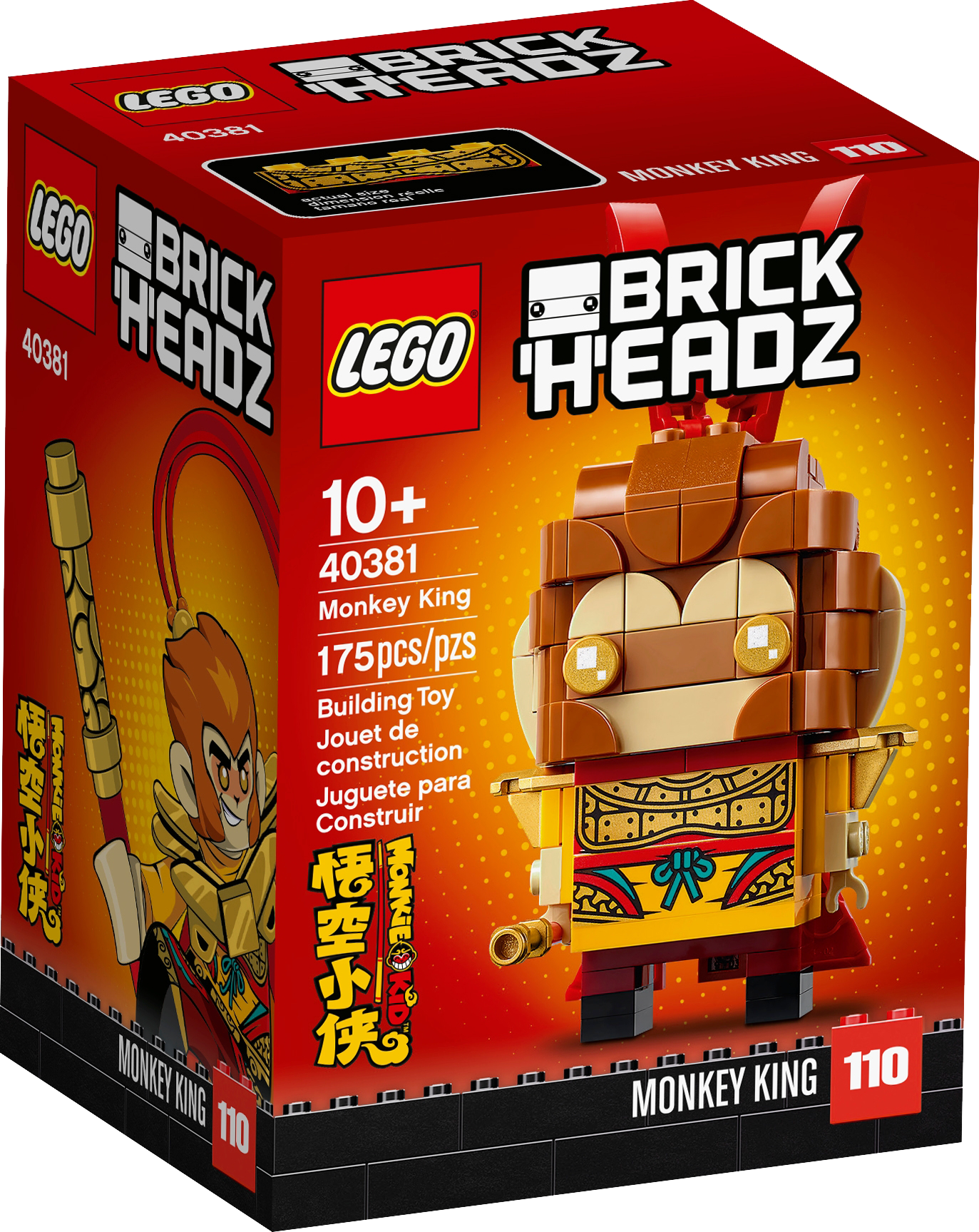 LEGO Monkie Kid" fans will love building their own brilliant LEGO BrickHeadz" version of the Monkey King (40381). This awesome little model of a legendary character from the classic Chinese novel Journey to the West is fun to build solo or with friends and family. It comes with step-by-step, illustrated instructions so even LEGO newcomers can build with confidence. A fun gift idea for creative kids aged 10 and up, this collectible toy includes a baseplate to create an eye-catching display.