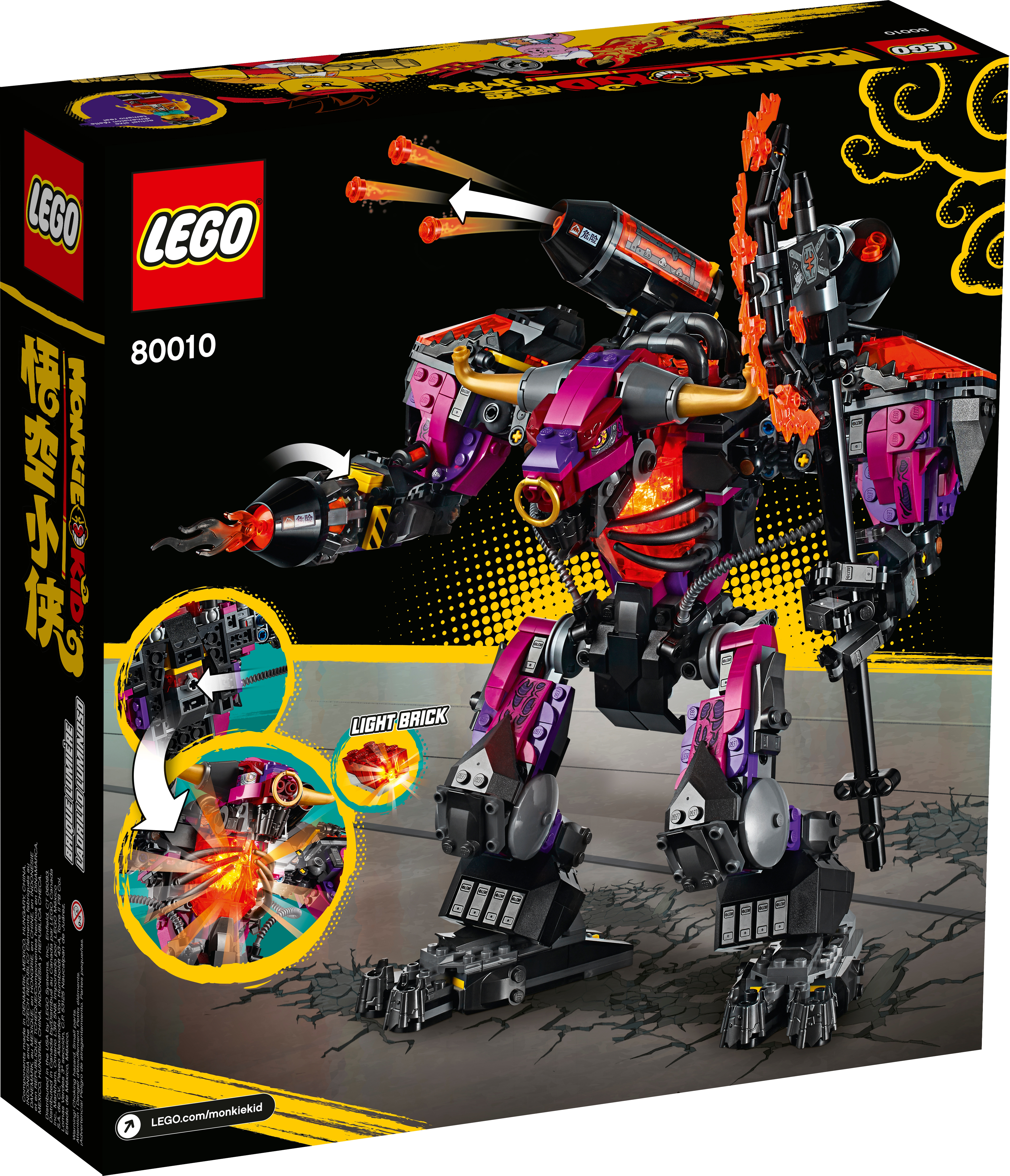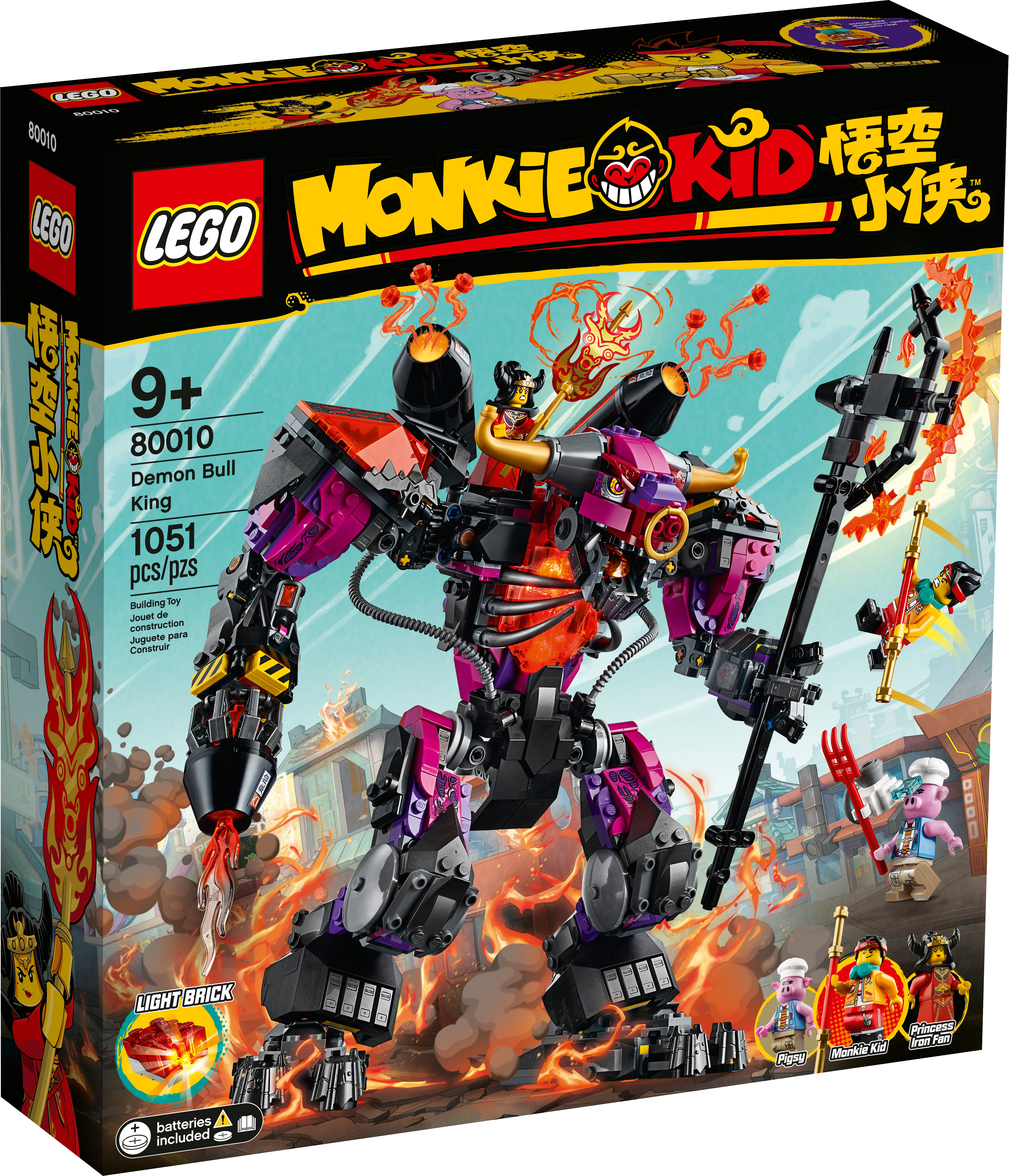 Young Monkie Kid fans will love creating epic scenes with this LEGO Demon Bull King building toy (80010). A brilliant LEGO gift idea for kids aged 9 and up, it features a huge, posable Demon Bull King model, with many cool features to build and inspire play such as a LEGO light brick that lights up the torso, stud-shooting cannons, a flame thrower and a big axe. The Monkie Kid, Pigsy and Princess Iron Fan minifigures each have weapons, including The Golden Staff, to boost the battle action. Instructions PLUS! This collectible toy playset comes with illustrated building instructions. Kids can also use Instructions PLUS, available on the free LEGO Life app, which lets them zoom into, rotate and visualise the model while building the real thing. Cool! Build, play, learnInspired by Monkey King tales from the classic Journey to the West novel and rooted in China s culture and values, LEGO Monkie Kid sets nurture children s bravery and resilience while they enjoy hours of creative fun.