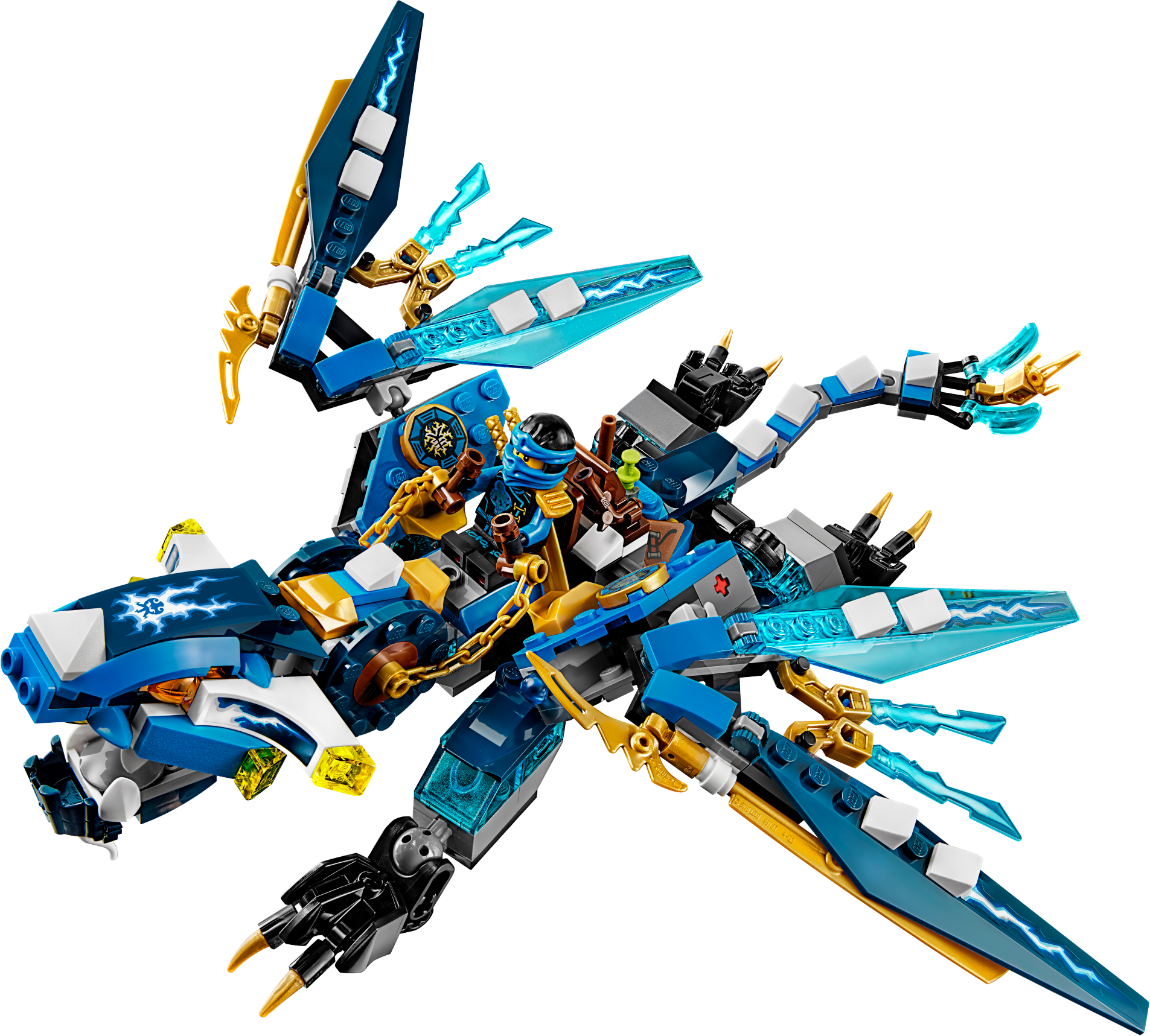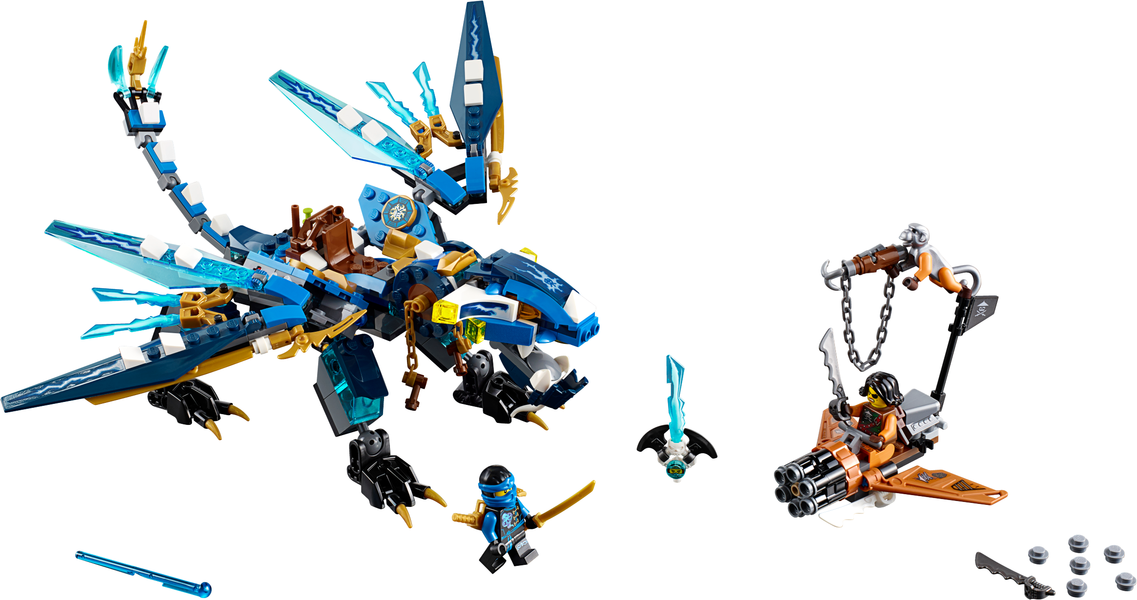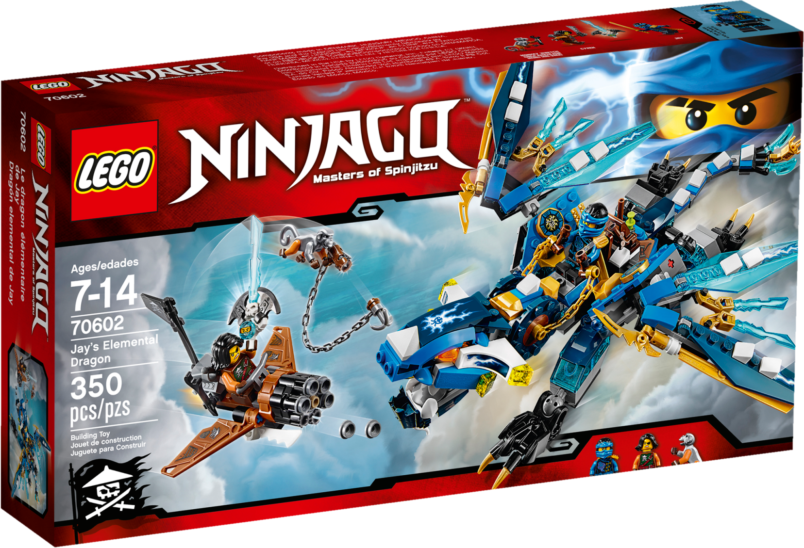 Defeat Cyren and Monkey Wretch with Jay’s Elemental Dragon! Jump into the dragon’s saddle and grab the reins. Snap the jaws and adjust the head, wings, legs and tail for awesome battle poses. Dodge Cyren’s harpoon hook shooter and the pirate flyer’s six-shooting rapid shooter. Fire the spring-loaded shooters to take down the flyer and then release Nya from the Djinn Blade! Includes 2 minifigures: Jay and Cyren, plus Monkey Wretch. Jay’s Elemental Dragon features a ball-joint system for maximum posability, including a posable head, neck, wings, legs, feet and tail, plus snapping jaws with big teeth. The Elemental Dragon also has 2 spring-loaded shooters, a saddle and chain reins for Jay, Ninja details, golden Ninja blades and translucent blue elements. The pirate flyer features a six-shooting rapid shooter, adjustable wings and an adjustable flag. Weapons include a translucent blue Djinn Blade with ‘trapped Nya’ element, Jay’s 2 golden katanas, Cyren’s harpoon hook shooter, pirate sword and dagger, and Monkey Wretch’s pirate sword. Accessory elements include a blow pipe and dart stored on the Elemental Dragon, plus Monkey Wretch’s wrench to repair the flyer. Recreate and role-play epic scenes from the NINJAGO™: Masters of Spinjitzu TV show. Jay’s Elemental Dragon measures over 4” (11cm) high, 12” (31cm) long and 11” (30cm) wide. Pirate flyer measures over 4” (11cm) high, 3” (8cm) long and 3” (9cm) wide.