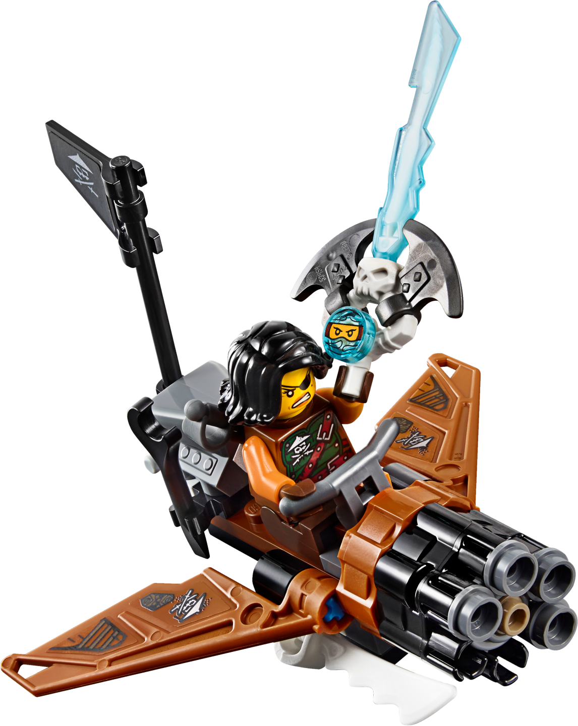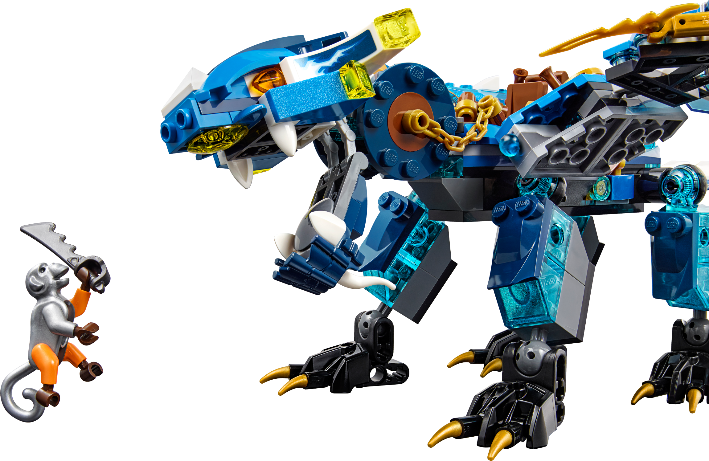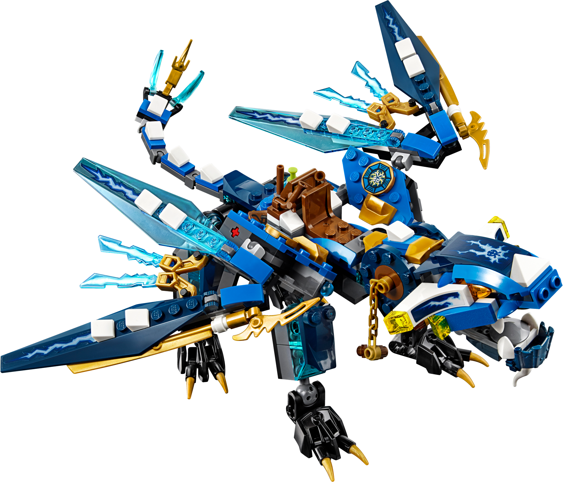 Defeat Cyren and Monkey Wretch with Jay’s Elemental Dragon! Jump into the dragon’s saddle and grab the reins. Snap the jaws and adjust the head, wings, legs and tail for awesome battle poses. Dodge Cyren’s harpoon hook shooter and the pirate flyer’s six-shooting rapid shooter. Fire the spring-loaded shooters to take down the flyer and then release Nya from the Djinn Blade! Includes 2 minifigures: Jay and Cyren, plus Monkey Wretch. Jay’s Elemental Dragon features a ball-joint system for maximum posability, including a posable head, neck, wings, legs, feet and tail, plus snapping jaws with big teeth. The Elemental Dragon also has 2 spring-loaded shooters, a saddle and chain reins for Jay, Ninja details, golden Ninja blades and translucent blue elements. The pirate flyer features a six-shooting rapid shooter, adjustable wings and an adjustable flag. Weapons include a translucent blue Djinn Blade with ‘trapped Nya’ element, Jay’s 2 golden katanas, Cyren’s harpoon hook shooter, pirate sword and dagger, and Monkey Wretch’s pirate sword. Accessory elements include a blow pipe and dart stored on the Elemental Dragon, plus Monkey Wretch’s wrench to repair the flyer. Recreate and role-play epic scenes from the NINJAGO™: Masters of Spinjitzu TV show. Jay’s Elemental Dragon measures over 4” (11cm) high, 12” (31cm) long and 11” (30cm) wide. Pirate flyer measures over 4” (11cm) high, 3” (8cm) long and 3” (9cm) wide.