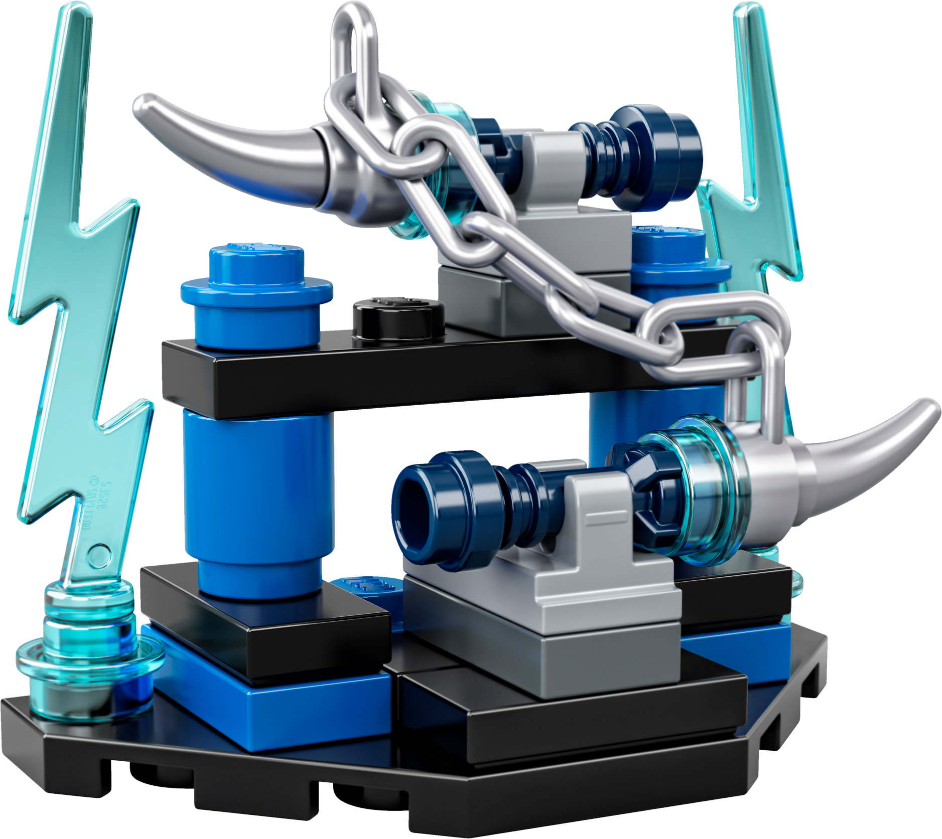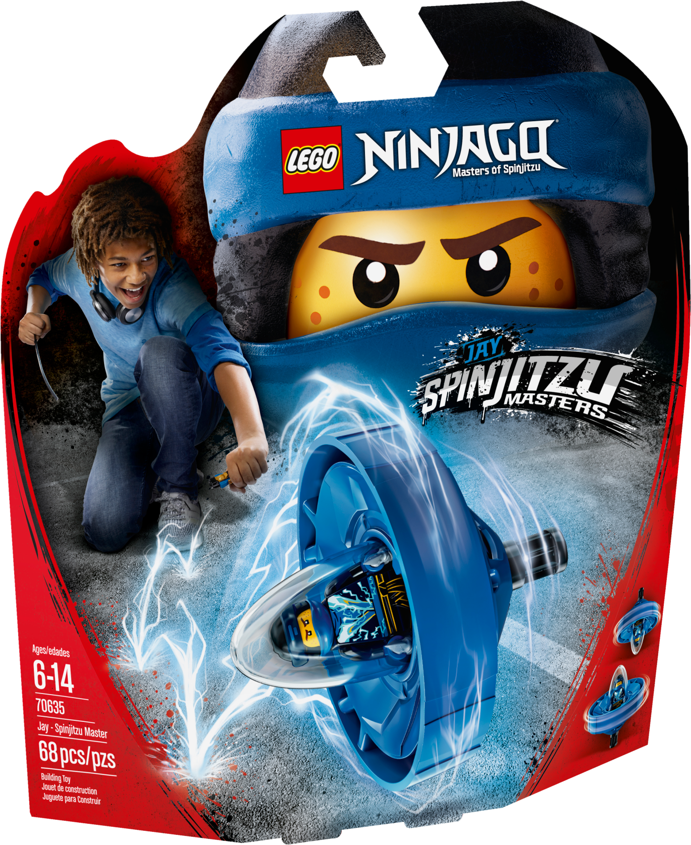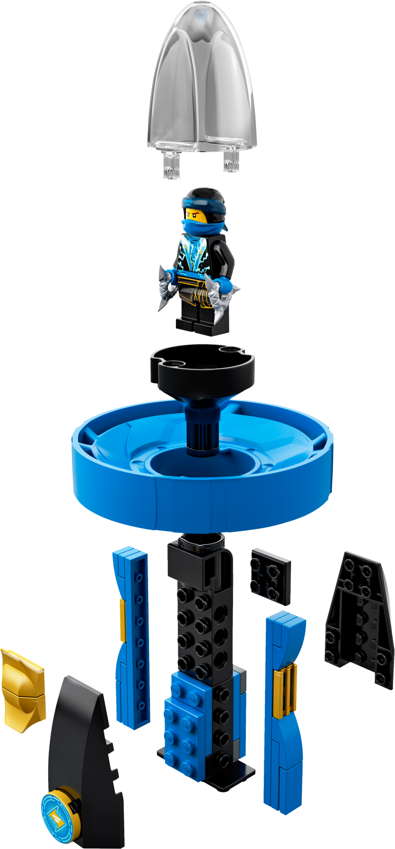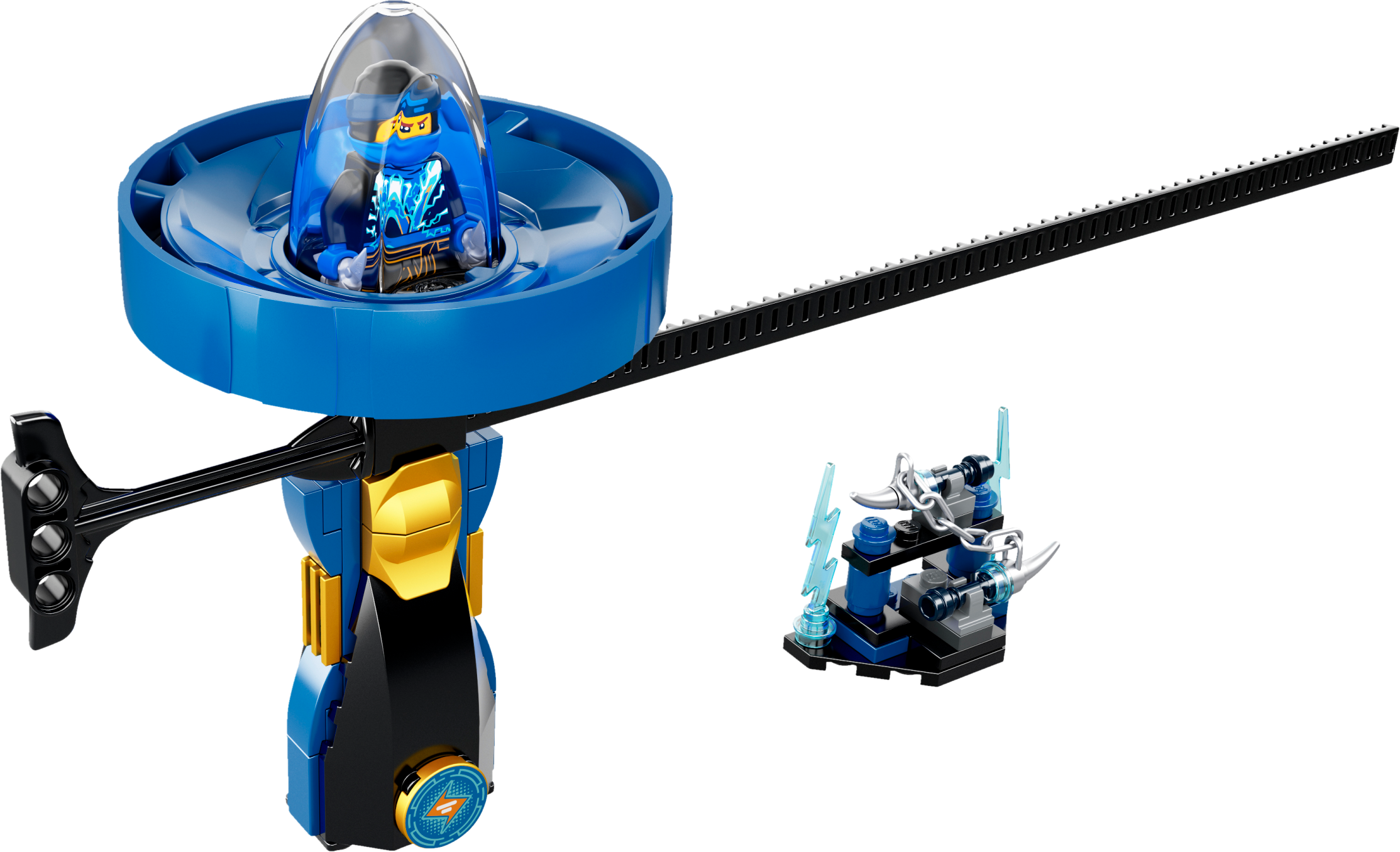 Features a Spinjitzu spinner with buildable LEGO® brick handle, spinner element with minifigure capsule and rip cord, weapon rack with nunchucks, and Jay’s 2 shurikens.