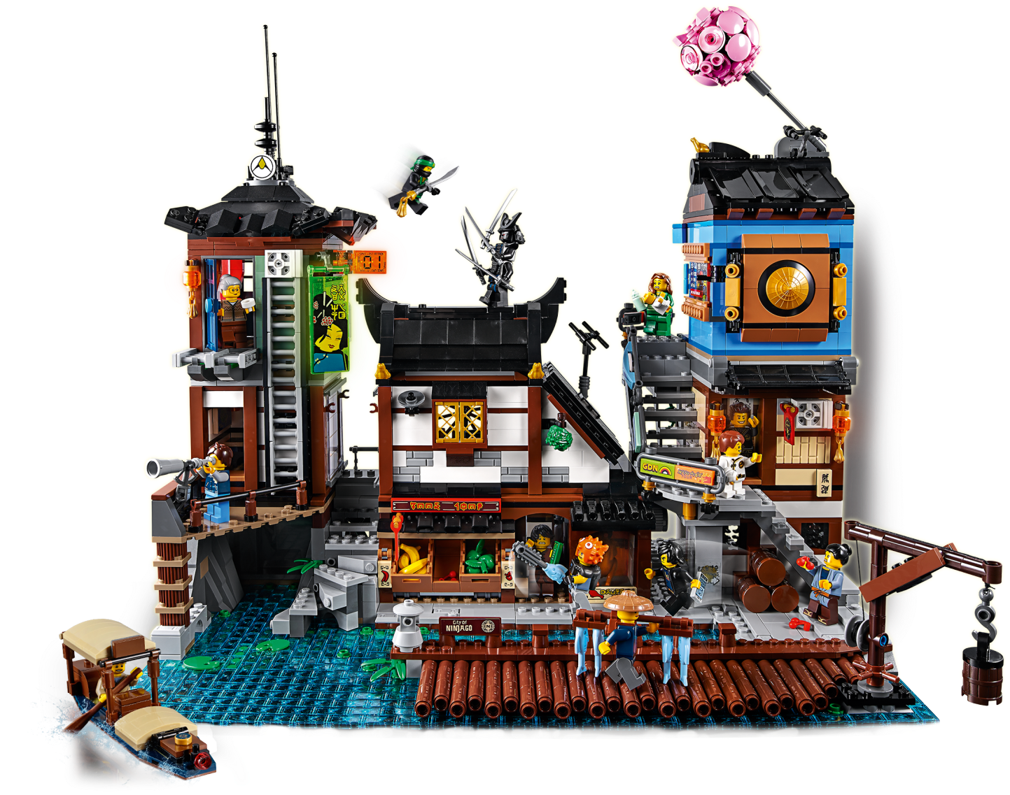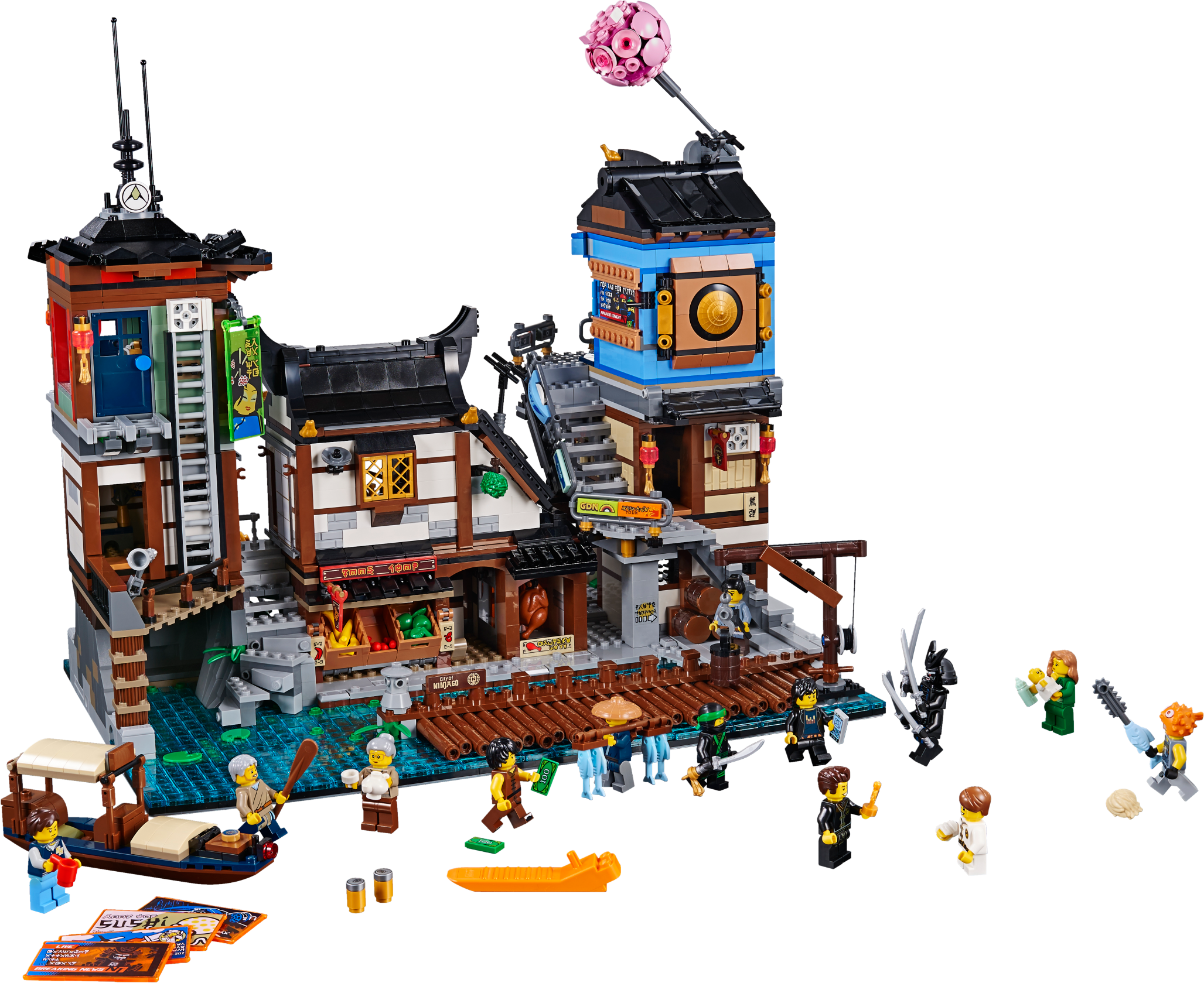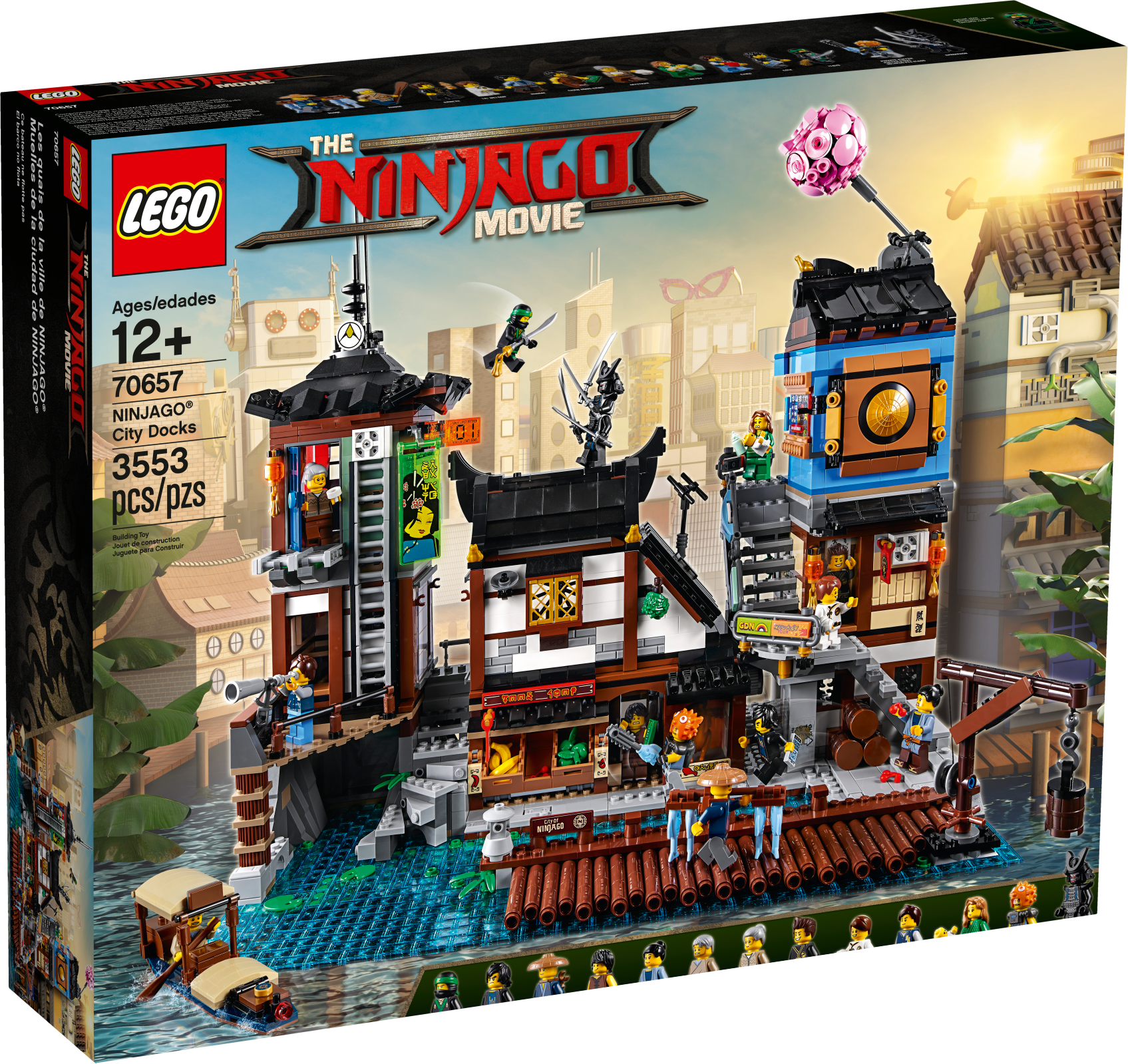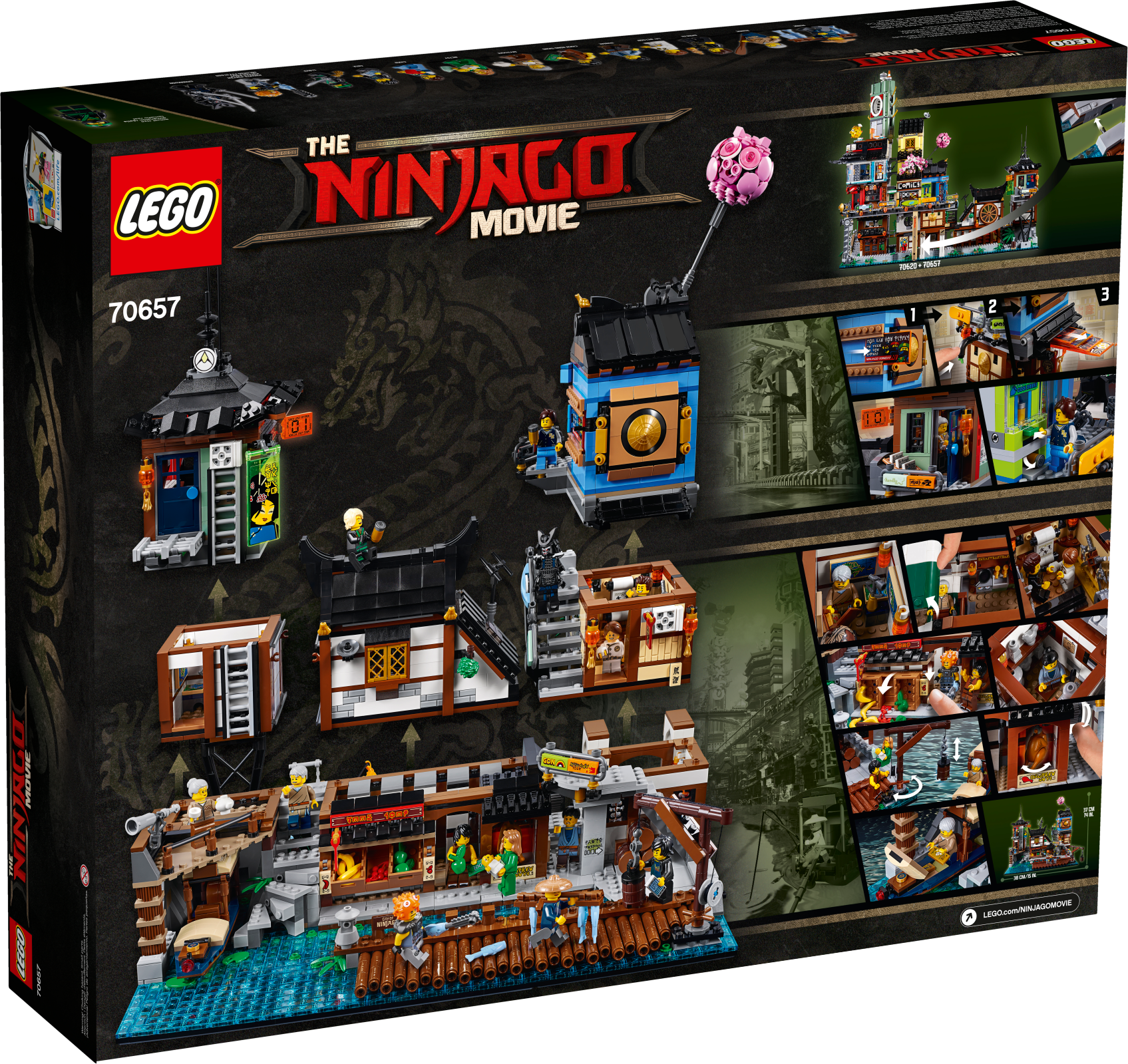Have fun with Lloyd, Cole and friends at THE LEGO® NINJAGO MOVIE™ 70657 NINJAGO® City Docks and defend against Garmadon’s attacks. This highly detailed set features a harbor with a functioning crane and boat, and 2 levels of Old World locations including a grocery store with tipping food display and rotating rotisserie; house with map room and kitchen/bedroom; sculptor's workshop; plus a dojo. Experience modern NINJAGO City life on The Street with a tearoom and an arcade with interchangeable billboards, buildable arcade games, functioning vending machine and a buildable pig ‘balloon’ attached to the roof. This set also includes 13 LEGO NINJAGO minifigures. Includes 13 LEGO® NINJAGO® minifigures: Lloyd, Cole (in casual outfit), Garmadon, Private Puffer, Runje, Chan Kong-Sang, Runme, Runde, Dareth, Lil’ Nelson, Mystake, Chad and Betsy (with a baby figure). Features a modular design for easy play, including a harbor, Old World (lower level), Old World (upper level) and The Street. Harbor features brick-built water; boathouse with a boat for a minifigure with an opening roof, oar and secret compartment with 2 collectible NINJAGO® ‘cards'; dock with functioning crane; removable barrels containing assorted elements; and an opening cave. Old World (lower level) features: a grocery store with tipping food display and rotating rotisserie; alleyway; and a sculptor’s workshop with a buildable statue and statue elements. Old World (upper level) features Runde the explorer and Mystake's house, and Dareth's dojo. House features a map room with assorted elements including a globe, sextant and a book with a collectible Atlantis ‘card' inside; sliding doors; kitchen/bedroom with buildable oven, sink, bunk beds with removable top bunk, and assorted elements including a TV; and a roof with attachment points for 2 minifigures. Dojo features 4 katanas, 4 shurikens, weapon racks and assorted elements including a Sensei Chen tournament leaflet, 3 trophies and exterior wall with scroll. The Street features the explorer and Mystake's tearoom, arcade with billboards, and a newspaper stand with 3 NINJAGO® News elements. Tearoom features a service counter, opening entrance door, scales, teapot, cup and 2 NINJAGO® News elements. Arcade features 2 buildable arcade games, a buildable candy machine, interchangeable billboards, functioning vending machine with money bill and 3 soda can elements, and a buildable pig ‘balloon' attached to the roof. Weapons include the Green Ninja Lloyd's sword, Garmadon's 4 katanas and Private Puffer's fish chainsaw. Accessory elements include Cole's mobile phone, Runje's fishing rod, Chan Kong-Sang’s money bill, Runme’s hammer and chisel, Lil’ Nelson’s arm cast, Chad’s cup and Betsy’s baby bottle. Connect to 70620 NINJAGO® City for endless ninja adventures. This cool toy for kids measures over 14” (37cm) high, 14” (38cm) wide and 9” (25cm) deep.
