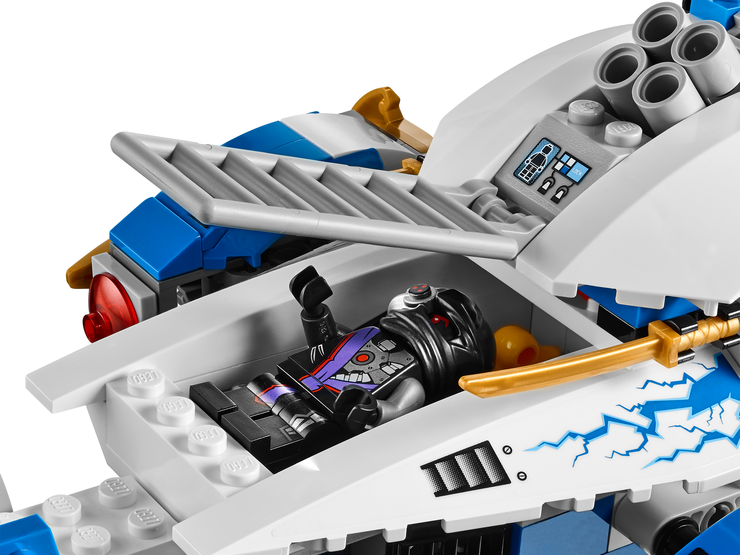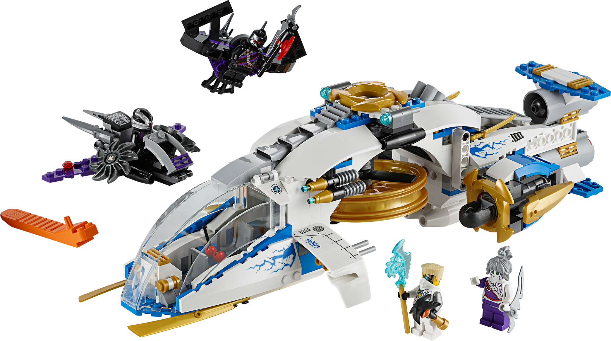 Launch an action-packed aerial assault on the Nindroids with the NinjaCopter! A thrilling battle is raging above New Ninjago City as the conflict for the Techno-Blades reaches new heights! Battle-scarred Zane, with his half-robot/half-Ninja face, and Pixal must work together in the NinjaCopter to outwit the attacking Nindroids. Spin the propellers and rear jet engines to soar into action. Fire the front flick missiles and rotating shooting cannons, taking care to evade the spinning saw blades of the Nindroid jet fighter. And beware – at any moment the Nindroid may launch the attack glider to double the aerial assault! Includes 4 minifigures with weapons: Zane, Pixal and 2 Nindroids.Includes 4 minifigures with weapons: Zane, Pixal and 2 NindroidsZane minifigure, with half-robot/half-Ninja face, is exclusive to this setNinjaCopter features hi-tech cockpit, rotating propellers for take-off and flight mode, rotating rear jet engines, air-intake engines, adjustable landing flaps, front flick missiles, front lasers, rotating shooting cannons, prison cell, gold elements and top flick missilesNindroid jet fighter features adjustable cockpit, spinning saw blades and a detachable gliderWeapons include translucent blue Techno-Blade for Zane, Nindroid battle saw blades and Pixal’s spike bladeAlso includes Zane’s falcon, new and exclusive to this setSpin the propellers and soar skywardsFire the front flick missiles and rotating shooting cannonsCapture a Nindroid in the prison cellClip the Nindroid onto the detachable glider to double the Nindroid’s aerial threatNinjaCopter measures over 3” (9cm) high, 14” (37cm) long) and 6” (16cm) wideNindroid jet fighter measures over 1” (3cm) high, 4” (11cm) long) and 4” (12cm) wide