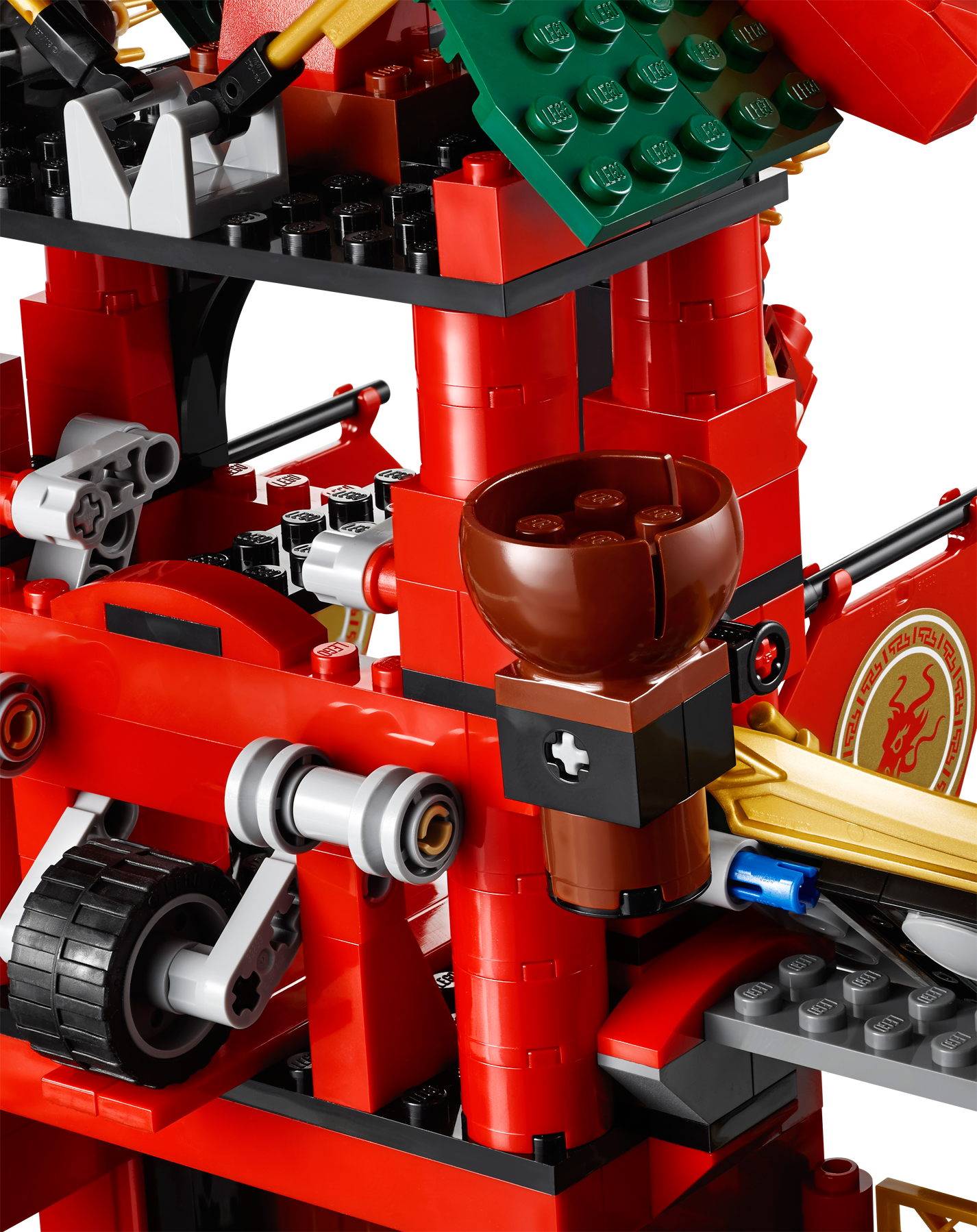 Defend the awesome Ninjago Temple against OverLord attacks! The huge evil OverLord has powered up and is threatening to take over New Ninjago City. Help the Ninjas to defend the Ninjago temple using its awesome array of hidden features. Plan your strategy in the control room and activate the catapult stairs to send intruding Nindroids flying. Evade laser-cannon fire from OverLord and retaliate by triggering the tower’s dual catapult and hidden disc shooter. Zoom down the zip line from the roof with Lloyd, spin the rotating walls to reveal hidden weapons, and glide into battle with Jay. Outsmart those Nindroid invaders and lock them up in the prison! Includes 8 minifigures with assorted weapons and accessories: Jay, Lloyd, Zane, Nya, OverLord and 3 Nindroids.Includes 8 minifigures with assorted weapons and accessories: Jay, Lloyd, Zane, Nya, OverLord and 3 NindroidsNinjago Temple features huge entrance doors, dragon windows, rotating walls with hidden weapons, catapult stairs, Ninja control room with computer, cool tools, hidden Ninja sleeping areas, kitchen with grill and sausages, prison for Nindroids, dragon tower with dragon head, flags, dual catapult and hidden disc shooter, roof with hidden shooter cannon, secret Ninja entrance, zip line and golden decorative elementsAlso includes iconic Ninjago entrance arch and treeOverLord features firing laser cannon, huge golden claws, giant mechanical posable legs, golden and red translucent elementsZane’s glider features 2 flick missiles, golden and translucent elementsWeapons include a translucent yellow Techno-Blade for Jay, blue Techno-Blade for Zane, 8 Ninja swords, Nindroid dagger, droid axe and sword, plus a cool gold and black weapon with red element for OverLordAccessories include a translucent blue shield for ZaneMake Ninja battle plans in the control roomGrill sausages in the kitchen to feed the Ninja warriorsActivate the catapult stairs to send a Nindroid flying!Spin the walls to access hidden weaponsFire the disc shooter at OverLordTrigger the catapults from the towerZoom down the zip line from the roof with LloydShoot the flick missiles from Zane’s gliderCapture Nindroids in the prisonNinjago Temple measures over 13” (33cm) high, 15” (36cm) wide and 7” (14cm) deepTree measures over 3” (9cm) high, 3” (9cm) wide and 4” (12cm) deepTemple entrance arch measures over 4” (12cm) high, 4” (12cm) wide and 1” (3cm) deepOverLord stands over 5” (14cm) tallZane’s glider measures over 1” (3cm) high, 7” (18cm) long and 1” (5cm) wide