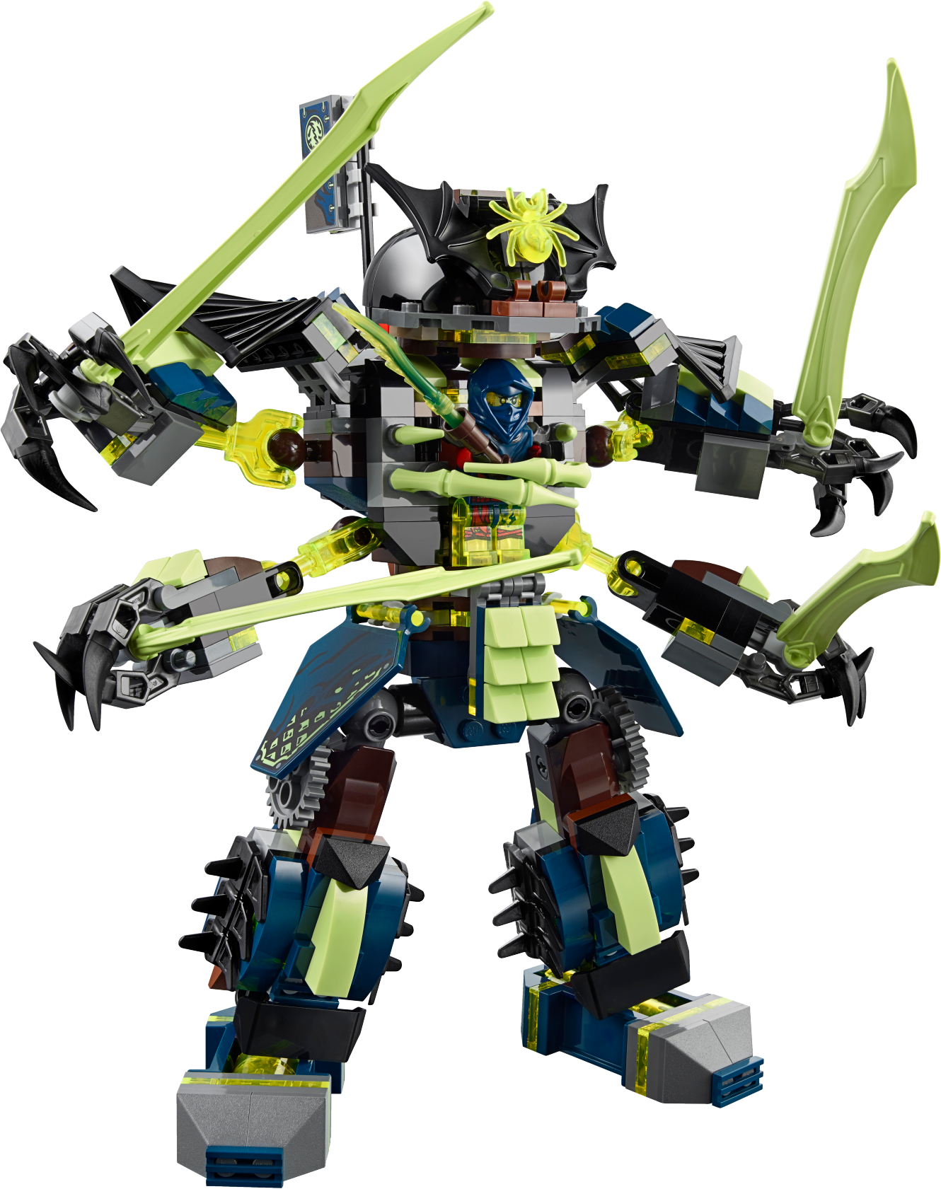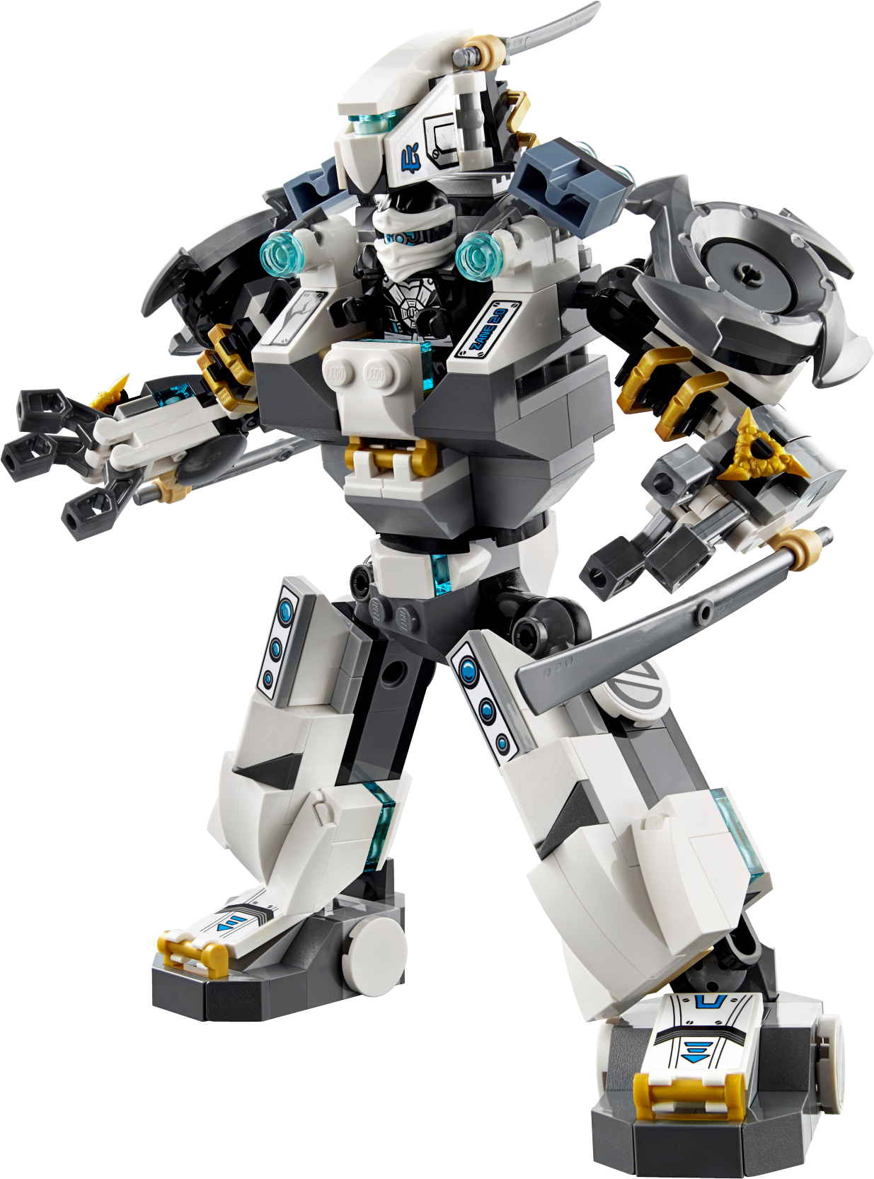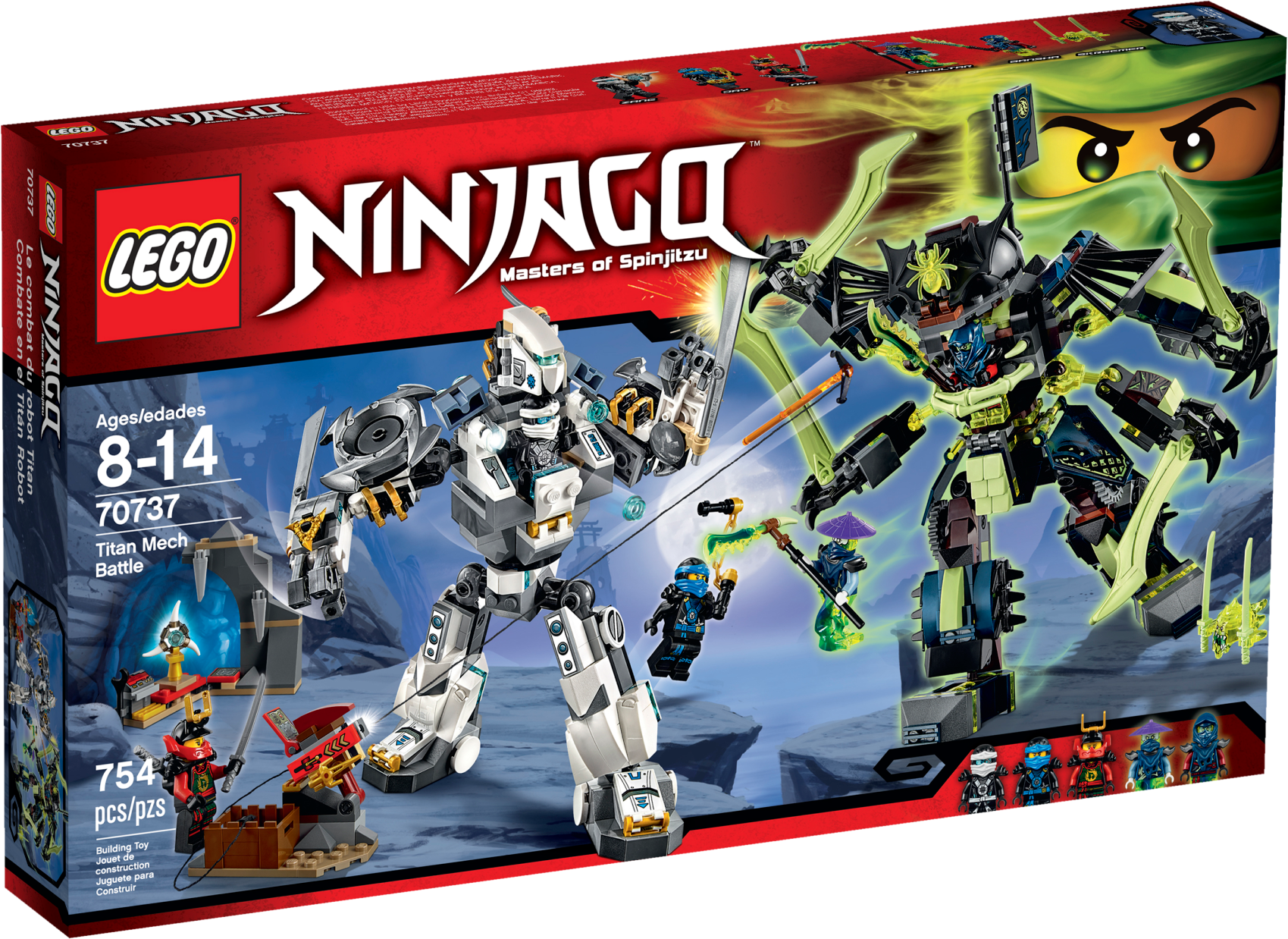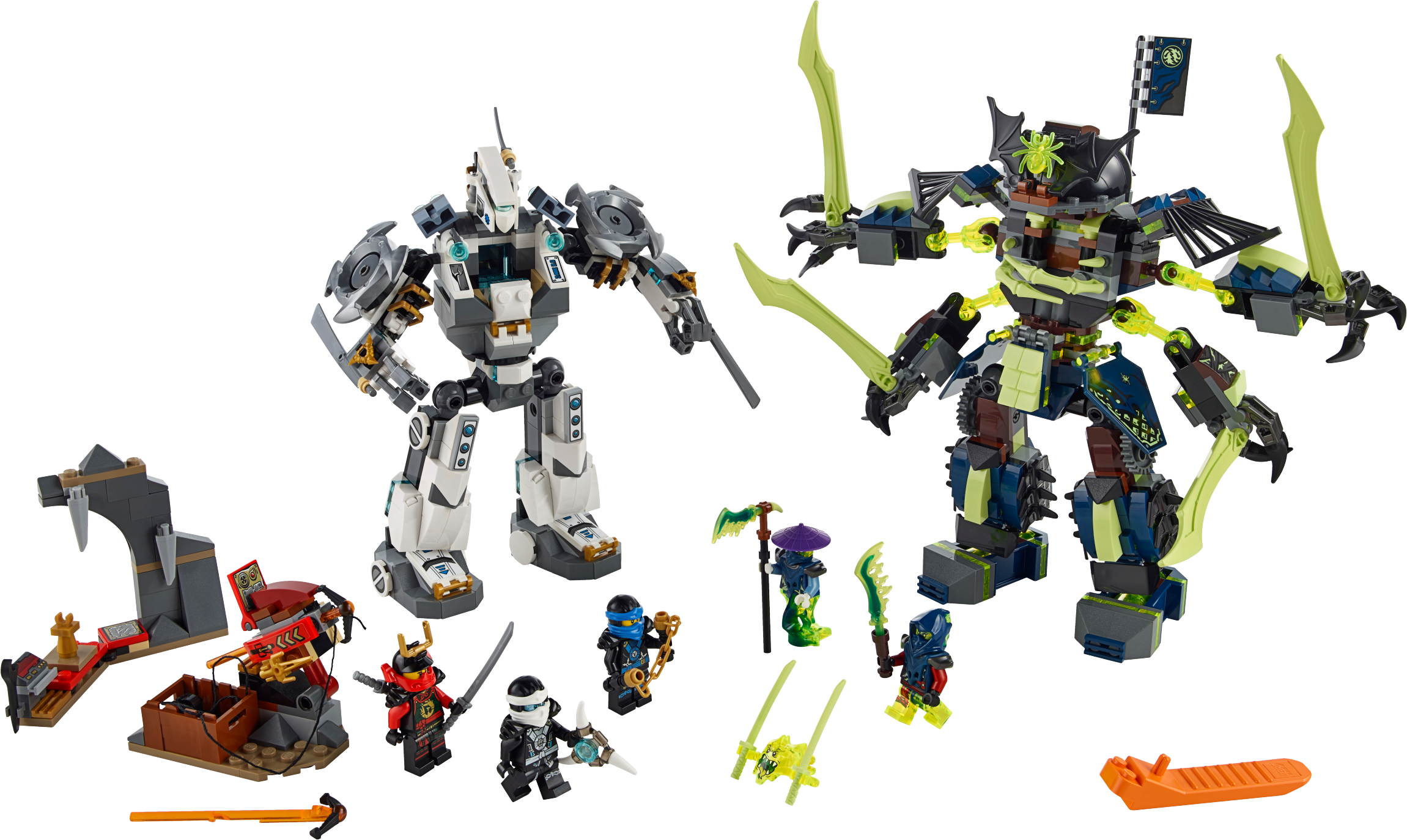 Take on the mighty Mech-enstein with Zane’s Titan Mech! Get set for the ultimate Mech Battle as Zane’s Titan Mech takes on Blade Master Bansha’s Ghost mech – Mech-enstein! Place Zane in the cockpit and adjust the arms and legs and rotating torso for awesome battle poses. Fire the stud shooters and dodge the massive swords of the 4-armed Mech-enstein. Then take the action to the air with the rocket-booster backpack! Give Zane support with Jay and Nya, firing the spring-loaded hook shooter to try and topple the Ghost mech. Use all the cool Ninja weapons to stop Scythe Master Ghoultar getting into the Samurai X Cave and stealing the Aeroblade! Includes 5 minifigures with assorted weapon and accessory elements: Zane, Jay, Nya, Scythe Master Ghoultar and Blade Master Bansha. Includes 5 minifigures with assorted weapon and accessory elements: Zane, Jay, Nya, Scythe Master Ghoultar and Blade Master Bansha Zane’s Titan Mech features an opening cockpit, posable arms with titanium-style swords, posable legs and feet, rotating torso, rotating shoulder blades, rocket-booster backpack and 2 stud shooters Mech-enstein features an opening head/cockpit, adjustable shoulder armor, adjustable Ghost bones to hold a minifigure, 4 posable arms with huge Ghost swords, rotatingtorso, posable legs and feet, dual jet booster pack and translucent details Samurai X Cave features a spring-loaded hook shooter with a hook on a string and assorted elements: the Aeroblade, tools, computer and a storage barrel Also includes a Skreemer (attachable to minifigures) with 2 Ghost Katana weapon elements Weapon elements include Zane’s 2 golden shurikens and Aeroblade, Jay’s Deepstone Nunchuk, Nya’s 2 Katanas, Wrayth’s Scythe Ghost Master Blade and Bansha’s Ghost Master Blade Accessory elements include Deepstone armor for Zane and Jay and Nya’s Samurai X outfit Ghoultar minifigure features a ghost tail (new for fall 2015) Bansha minifigure features transparent ghost legs and ghost armor Fire the Titan Mech’s stud shooters Evade the massive swords of 4-armed Mech-enstein! Topple Mech-enstein with the spring-loaded hook shooter! Defend the Aeroblade in Nya’s cave Recreate your favorite scenes from the NINJAGO™: Masters of Spinjitzu TV showZane’s Titan Mech measures over 7” (20cm) high, 3” (10cm) long and 6” (16cm) wide Mech-enstein measures over 8” (22cm) high, 4” (12cm) long and 9” (25cm) wide Nya’s Cave measures over 3” (8cm) high, 3” (10cm) wide and under 1” (1cm) deep Hook shooter measures over 1” (5cm) high, 2” (7cm) wide and 1” (5cm) deep