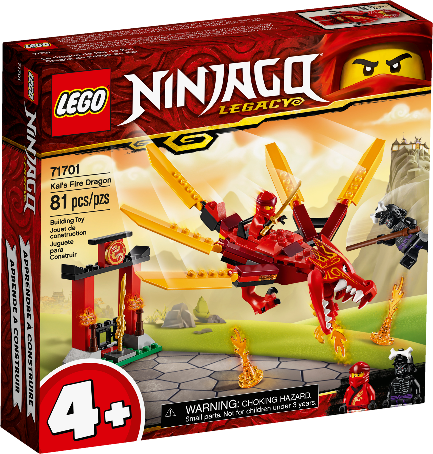 LEGO® NINJAGO® fans can recreate famous scenes from season 1 of the TV series with this upgraded legacy red dragon toy and 2 minifigures. Kai’s Fire Dragon (71701) must stop Lord Garmadon snatching the Sword of Fire from the mini fire temple. Kids are sure to be entertained for hours as they escape into this fantasy world.The new way to build toys for kidsLEGO fans now have a new and interactive way to build this dragon toy figure: the digital Instructions PLUS via the free LEGO Life app on smartphones and tablets. Zoom, rotate and view this ninja dragon as it comes to life on a screen and in front of you.Welcome to 4+!LEGO NINJAGO® 4+ toys offer preschool kids a gateway to an action-packed world where they can let their imaginations run wild as they learn to build their favourite characters, vehicles and buildings. With Starter Brick bases to make the process simpler, these sets are specially designed so first-time builders can experience the pride of constructing all on their own.LEGO® NINJAGO® Legacy playset featuring Kai and his Fire Dragon from season 1 of the TV series for epic battles against Lord Garmadon. This cool toy for kids will help them learn to build with confidence.This ninja toy has a Starter Brick base to help youngsters learn to build and create role-play stories with NINJAGO® Kai, his Fire Dragon, Lord Garmadon, a mini fire temple with the Sword of Fire, and 2 fire elements. This Red Dragon toy is highly posable, and can move its legs, wings, tail, head and mouth as it battles alongside Kai against Lord Garmadon. Kids can devise stories as they seek to protect the Sword of Fire. This 81-piece dragon toy provides a fun building experience for preschoolers and youngsters aged 4+ and makes a great birthday gift for kids, Xmas present, or LEGO® gift for any occasion. New for January 2020, this is an update on the LEGO® NINJAGO® dragon toy from season 1 of the TV series. The ninja dragon measures over 2” (6cm) high, 2” (6cm) long and9” (23cm) wide – the perfect size to play with anywhere. No batteries are needed for this LEGO® NINJAGO® dragon – it’s can be played with right out of the box. The dragon toy figure is powered by kids’ imaginations, so the quest to protect the Sword of Fire never has to stop. The perfect LEGO® toy to help preschoolers learn to build. A guide is included to explain the building steps and the ninja dragon can also be built using the interactive Instructions Plus guide on the free LEGO Life app! LEGO® 4+ buildable toys introduce younger children to a wide universe of their movie favorites, TV characters and everyday heroes, helping them to understand the purpose of building steps and boosting their confidence. LEGO® building bricks have met the highest industry standards since 1958. They are consistent, compatible and pull apart with ease every time. Used to create this ninja build, they would defeat even Lord Garmadon! These LEGO® bricks and pieces have been rigorously tested and meet the highest global safety and quality standards, both here on Earth and in NINJAGO® city!