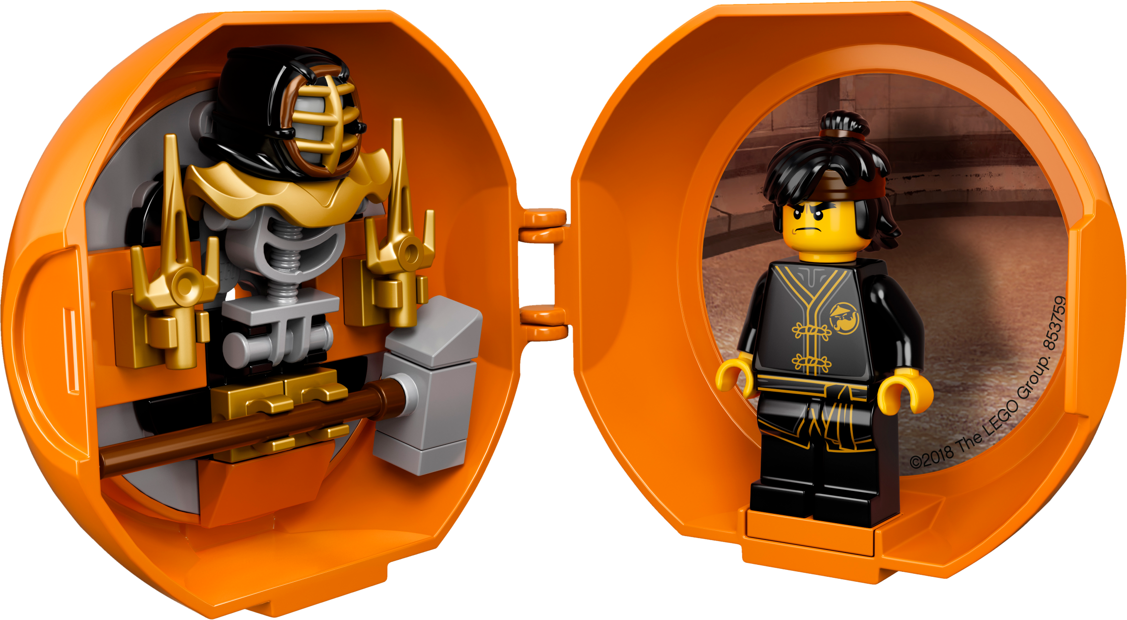 Features a portable plastic pod in orange with a Cole minifigure inside, plus a rack with assorted Kendo training weapons and accessory elements including: Kendo mask with brown rim, hammer, 2 gold-colored sai, shoulder armor, plus LEGO® elements to store the weapons and accessories in cool ninja style. • Measures over 2” (6cm) high, 2” (6cm) wide and 1” (3cm) deep.