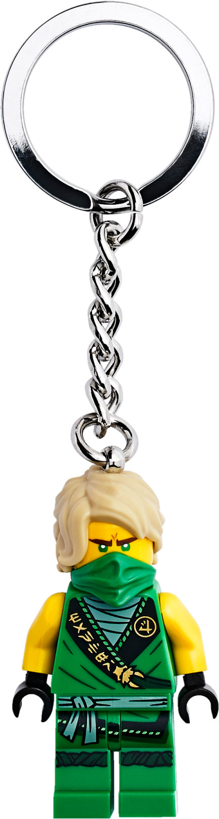 The key chain features a Lloyd minifigure ready for battle wearing a stylish green Legacy outfit with a bandana covering his face, and is attached to a durable metal chain and ring. This key chain will proudly show off their passion for their ninja hero when secured to a backpack or a set of keys.