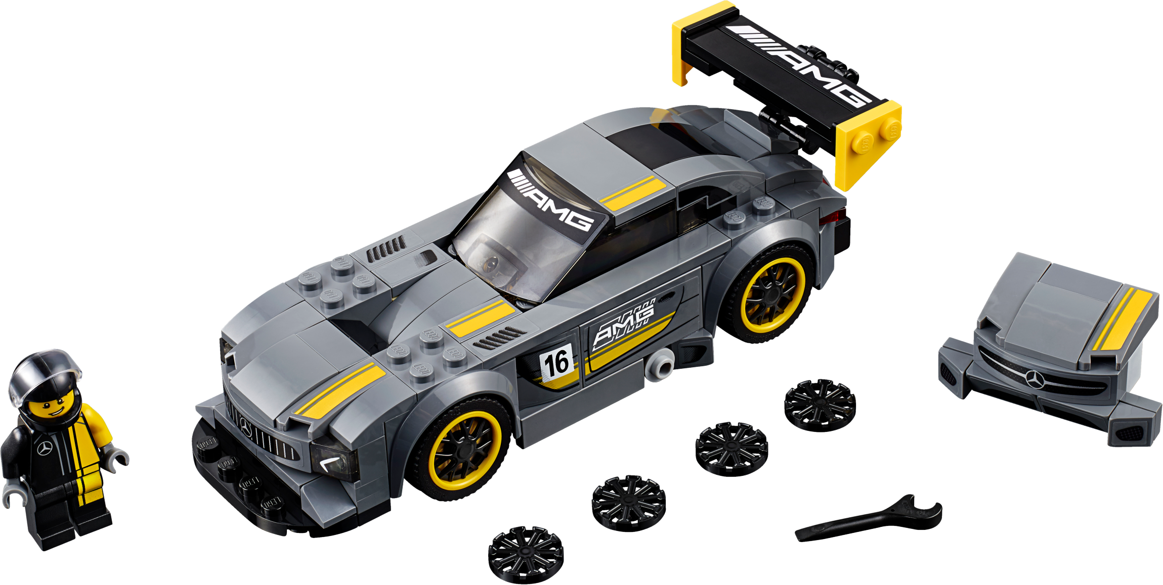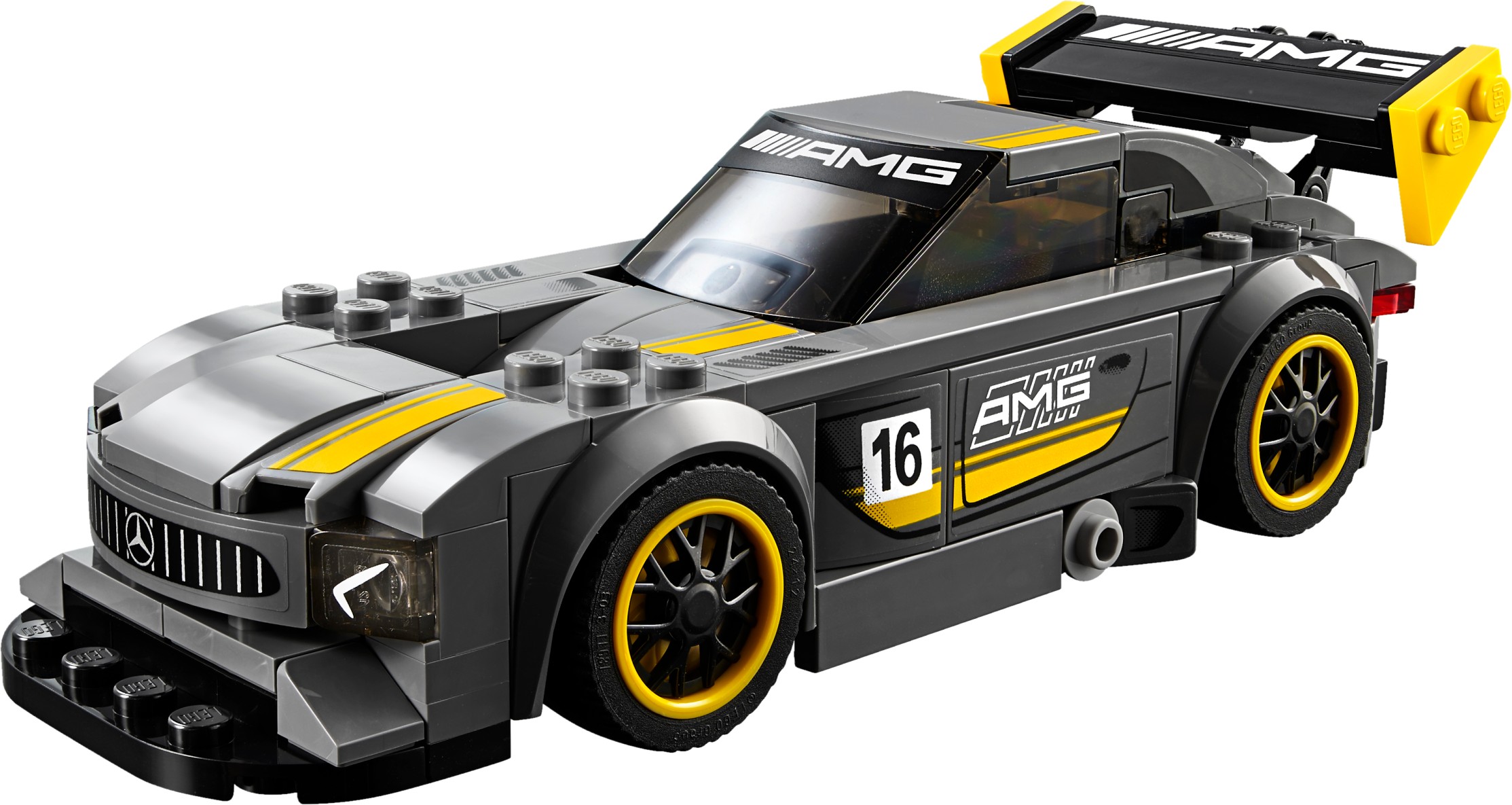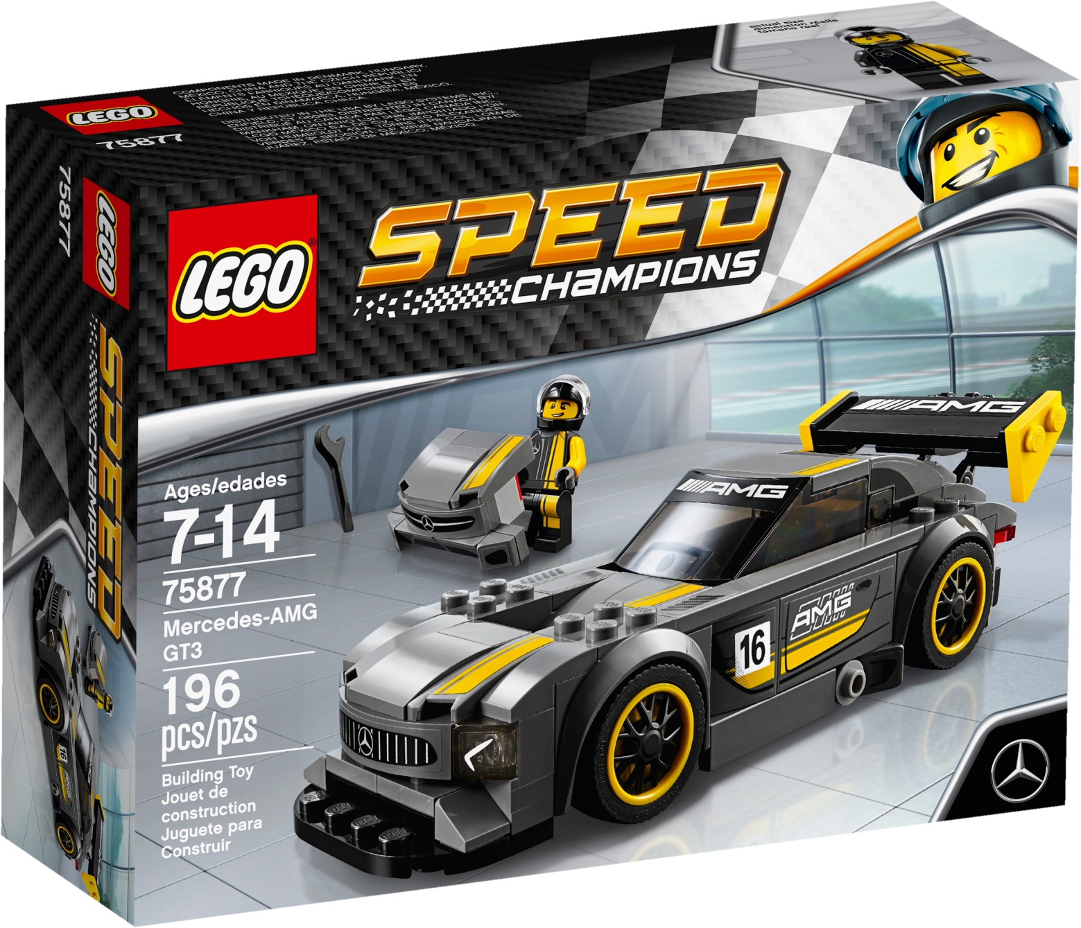 Show your skills as both an engineer and driver with this buildable LEGO® Speed Champions version of the Mercedes-AMG GT3. Customizable for race or road-driving modes, it features wheels with rubber tires, yellow rims and black trims, a removable front splitter, adjustable and removable rear wing, removable windshield and authentic racing colors and race-graphics stickers. Includes a minifigure.Includes a Mercedes-AMG racing driver minifigure.The race-ready, buildable Mercedes-AMG GT3 vehicle features a minifigure cockpit, wheels with rubber tires, yellow rims and black trims, removable windshield, removable front splitter, adjustable and removable rear wing, and authentic Mercedes-AMG design details, racing colors and race-graphics stickers.Customize the front and rear of the vehicle for race or road modes.Remove the windshield to place the minifigure in the car.Accessory elements include the Mercedes-AMG racing driver’s helmet and wrench.This set offers an age-appropriate build and play experience for ages 7+.Measures over 1” (4cm) high, 6” (16cm) long and 2” (6cm) wide in race mode.