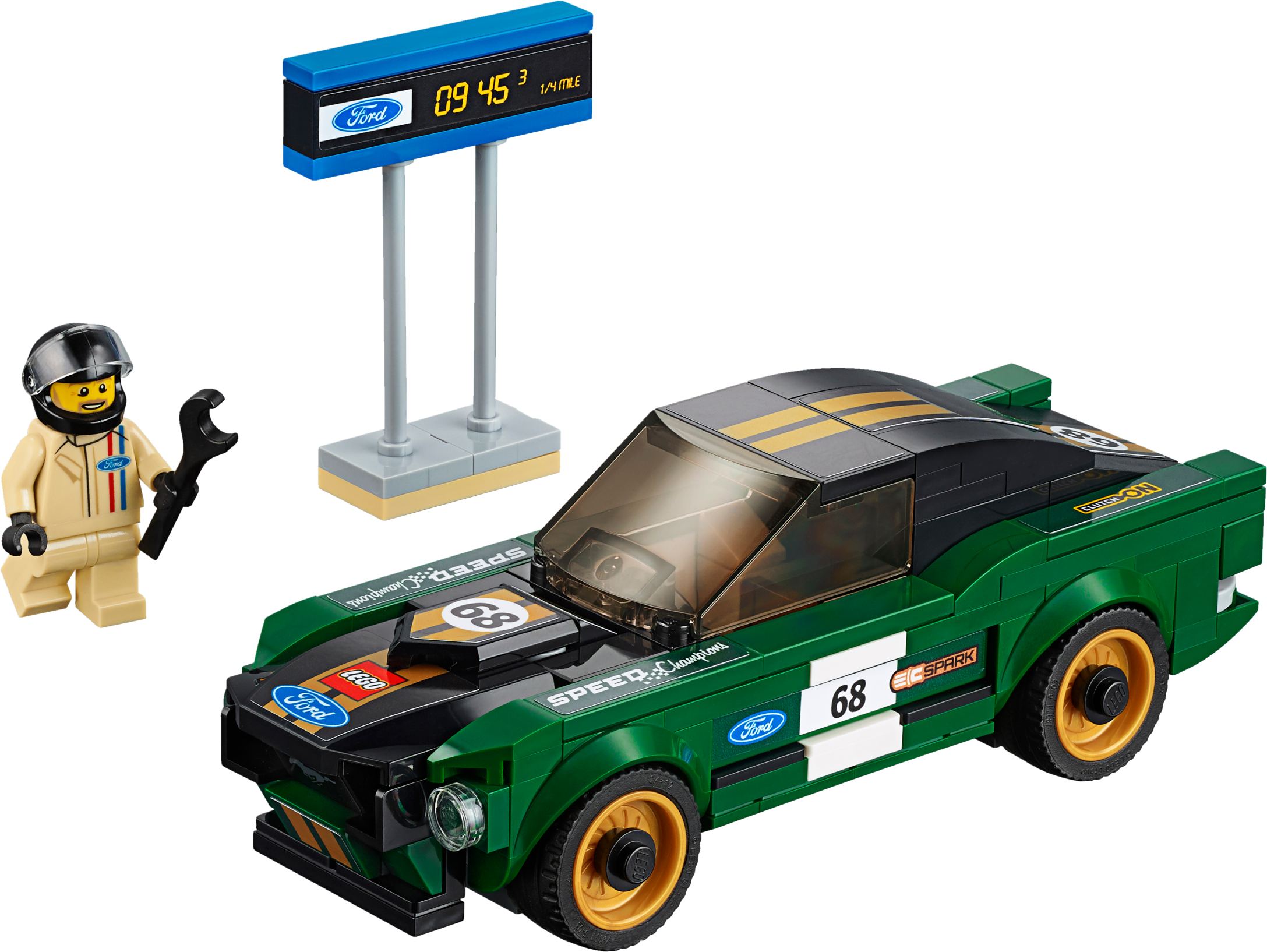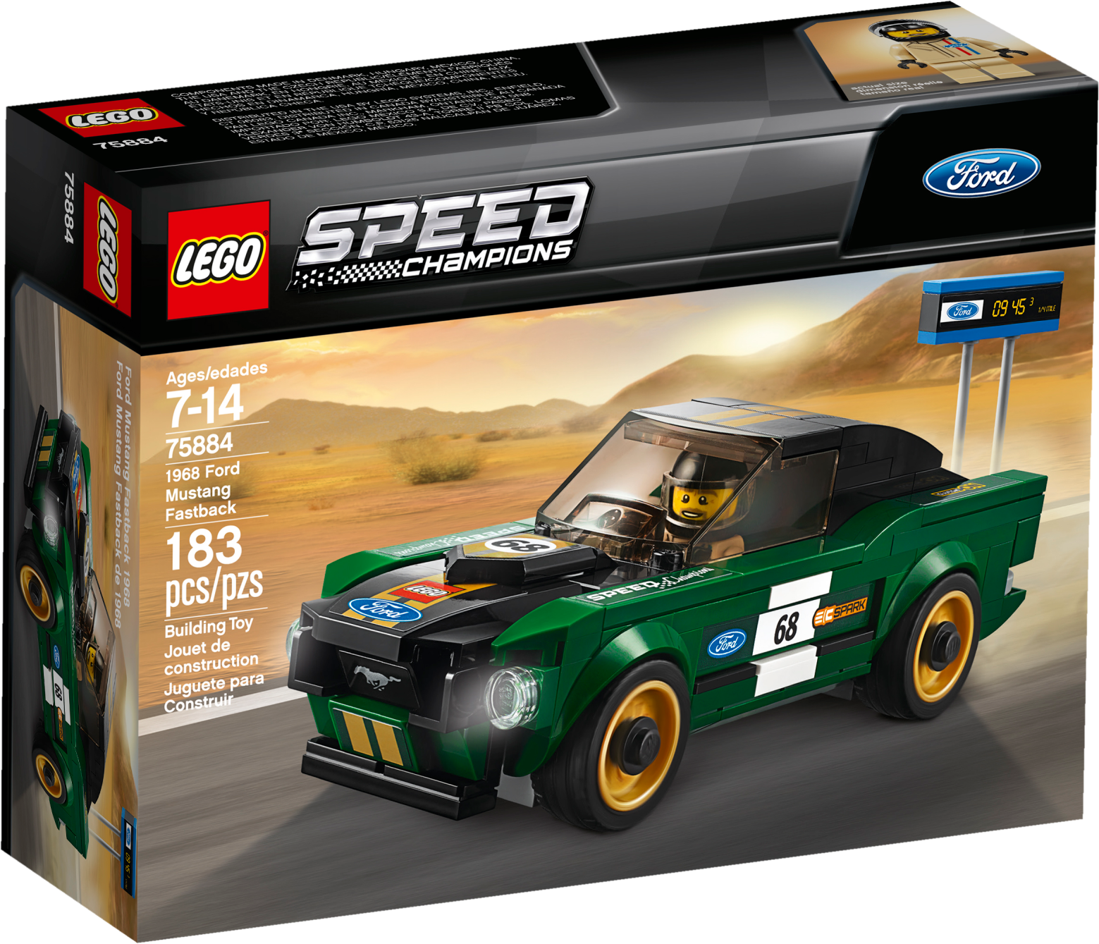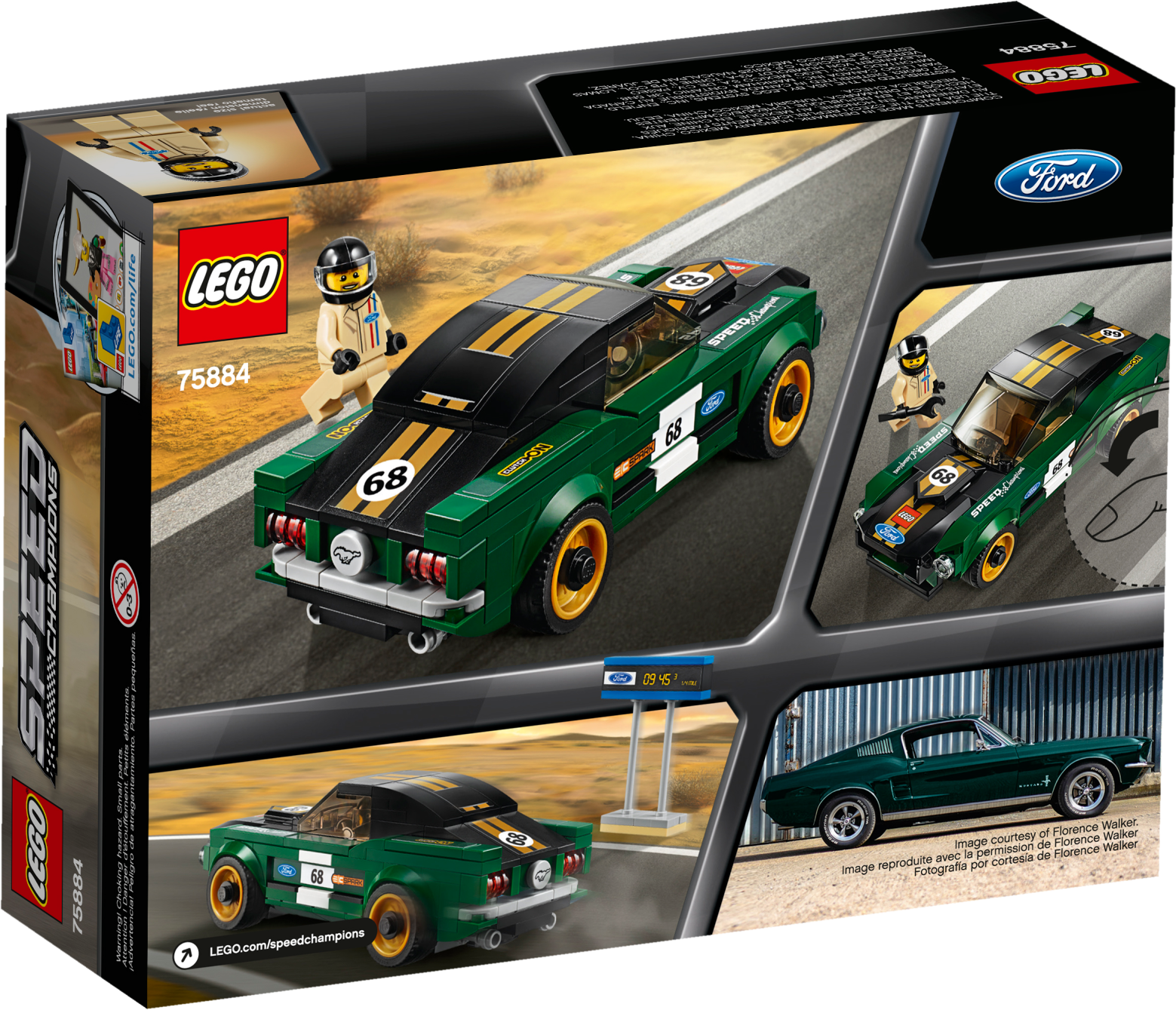 The race-ready, buildable 1968 Ford Mustang Fastback vehicle features a minifigure cockpit with removable windshield, wheels with rubber tires and gold-colored rims, transparent light-style elements, racing colors, race-graphics stickers and authentic design details.
