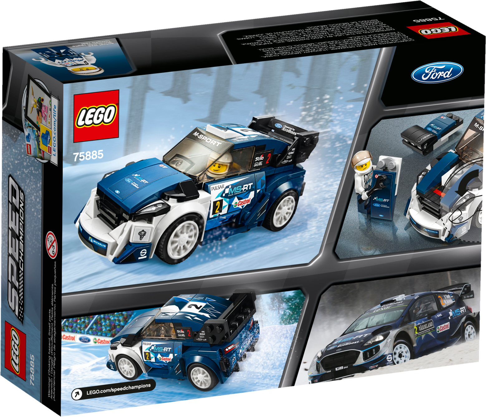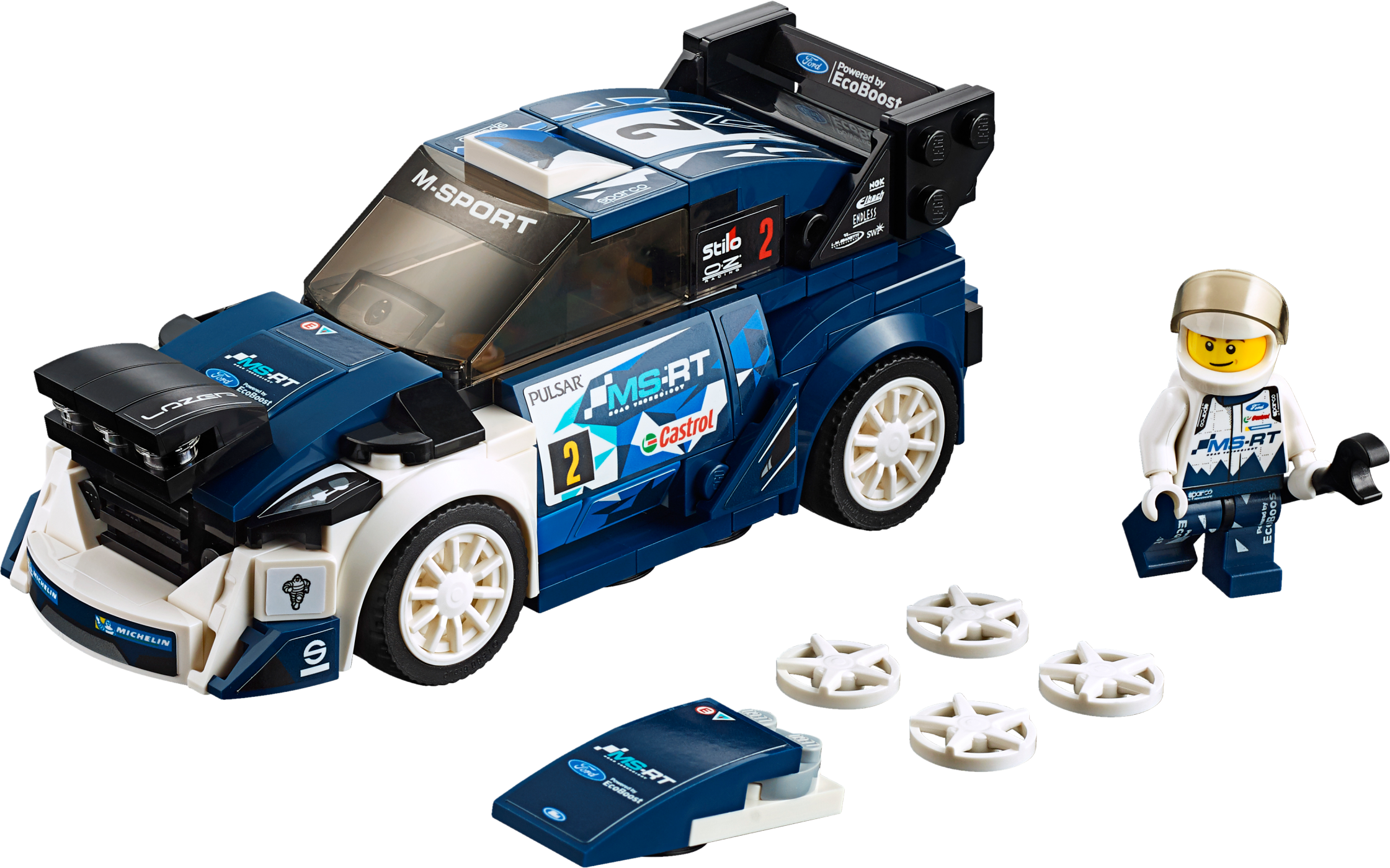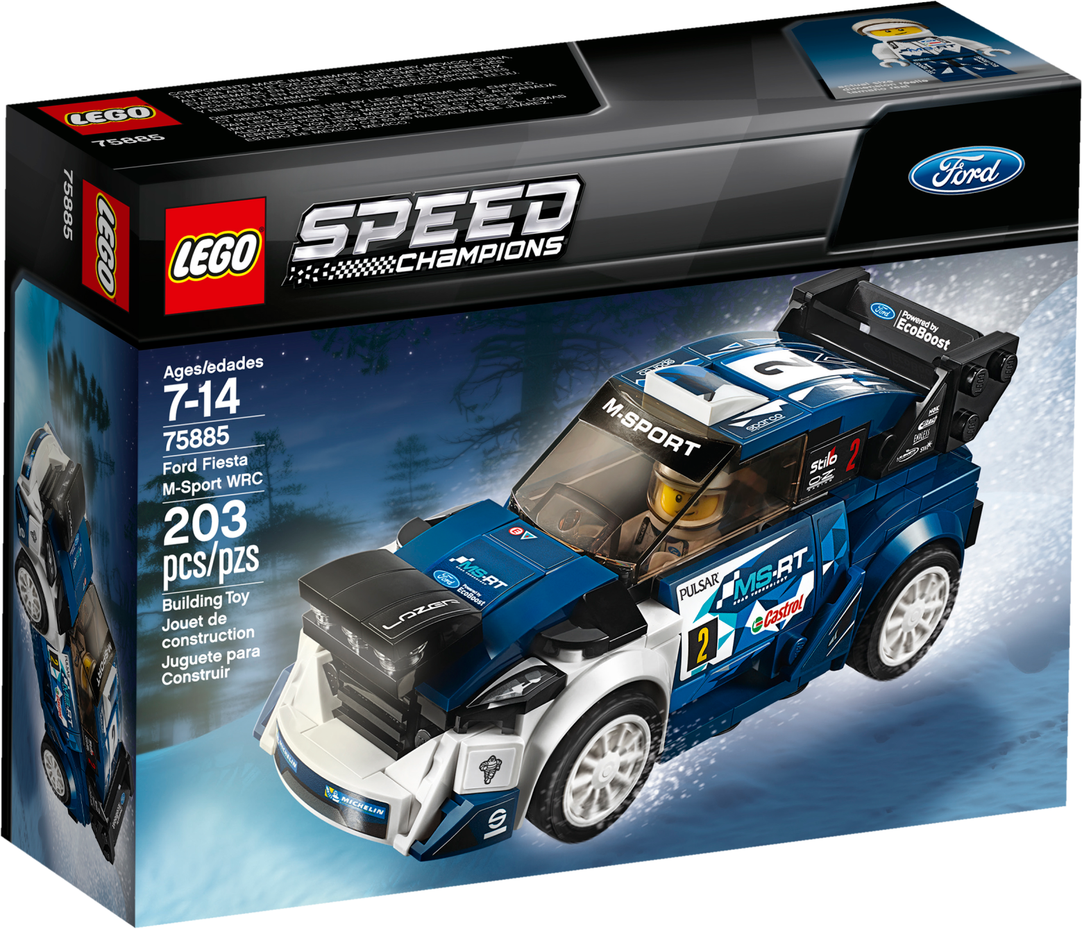 Display and race a buildable LEGO® Speed Champions version of the Fiesta M-Sport WRC, featuring a minifigure cockpit, removable windshield, 2 interchangeable hoods—including one with spotlight-style elements to play out low-light/nighttime racing scenarios, and authentic design details. This cool toy for kids includes a minifigure. Includes a Ford M-Sport rally racing driver minifigure. The race-ready, buildable Ford Fiesta M-Sport WRC features a minifigure cockpit with removable windshield, 2 interchangeable hoods—including one with spotlight-style elements, wheels with rubber tires, transparent light-style elements, authentic design details, racing colors and race-graphics stickers. Remove the windshield to place the minifigure in the car. Also includes the Ford racing driver's helmet. This cool toy for kids is suitable for ages 7-14. Ford Fiesta M-Sport WRC measures over 2” (6cm) high, 5” (13cm) long and 2” (6cm) wide. Alternative hood measures over 1” (5cm) high and under 1” (2cm) wide and 1” (1cm) deep.
