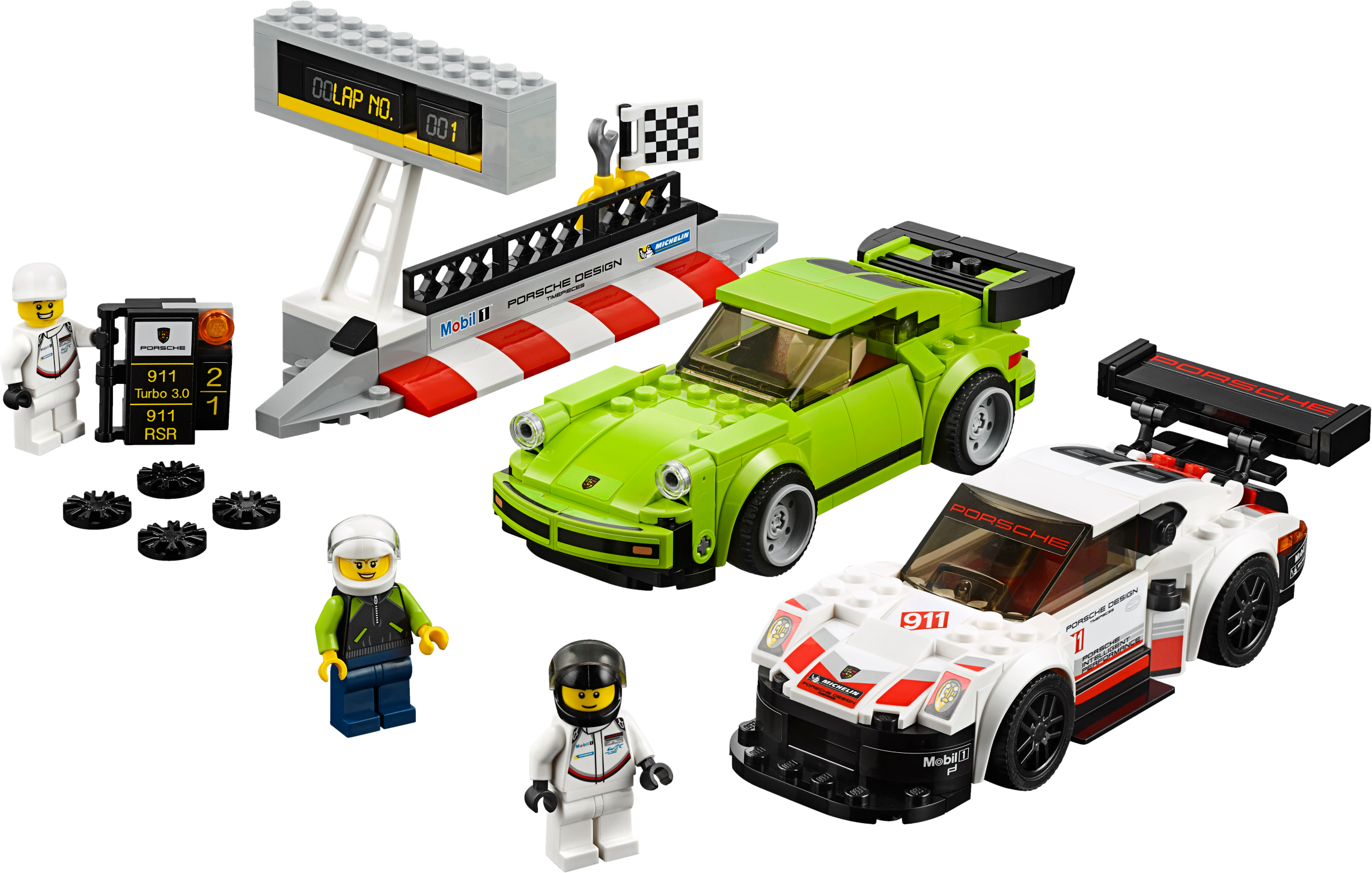 The race-ready, buildable Porsche 911 RSR and Porsche 911 Turbo 3.0 cars each feature a minifigure cockpit with removable windshield, wheels with rubber tires, authentic design details, racing colors and race-graphics stickers.