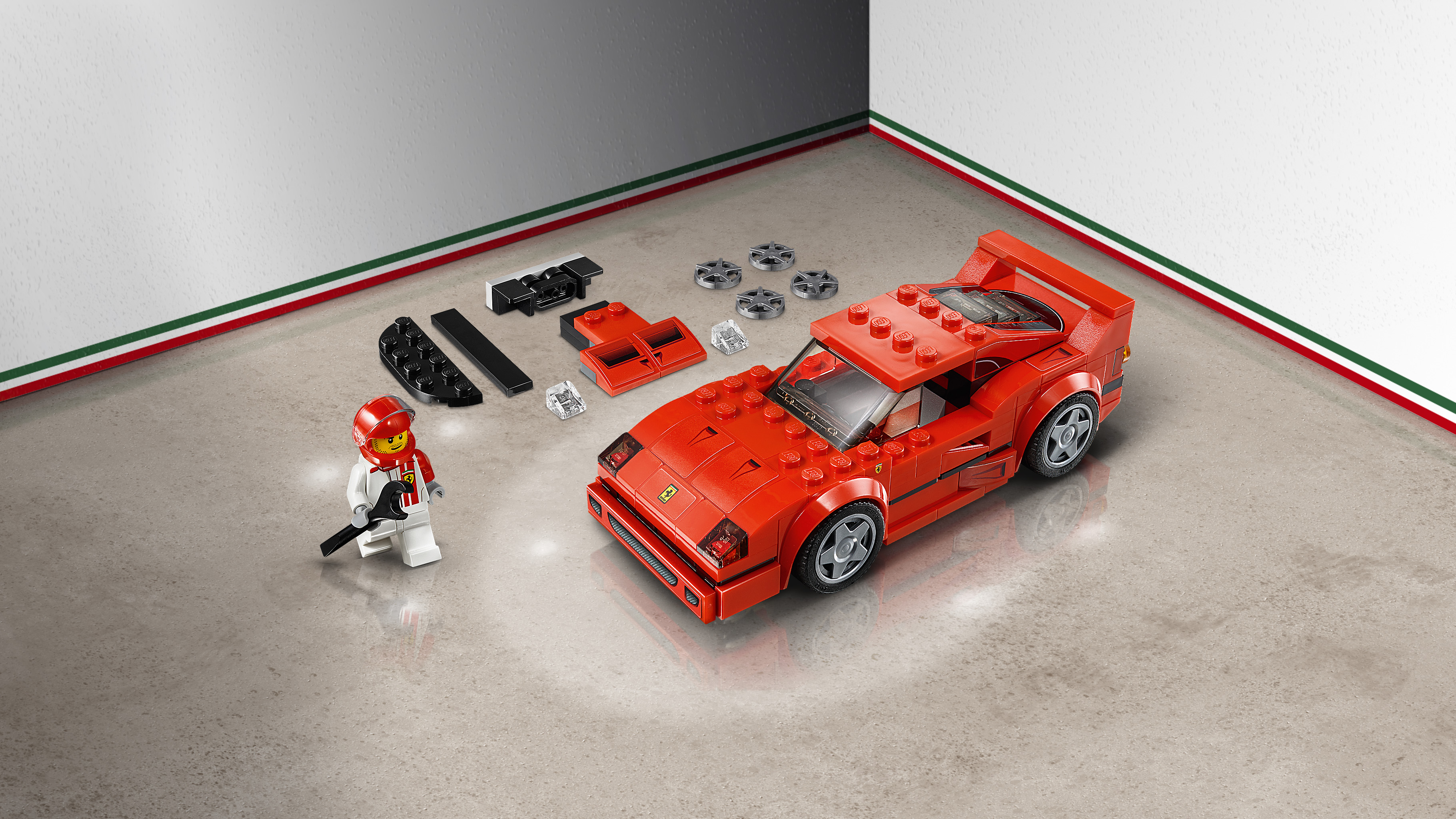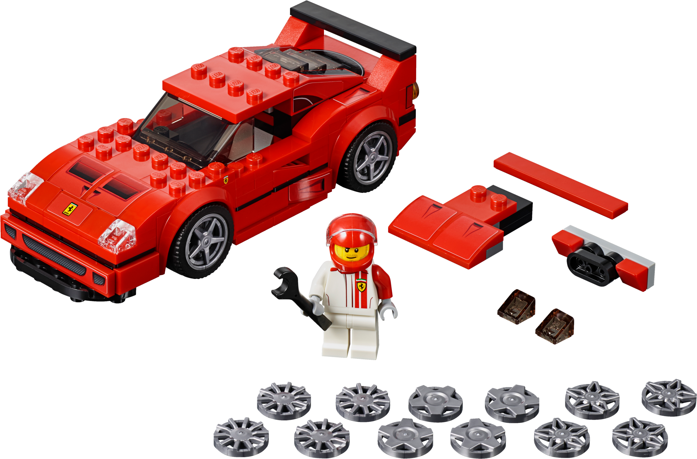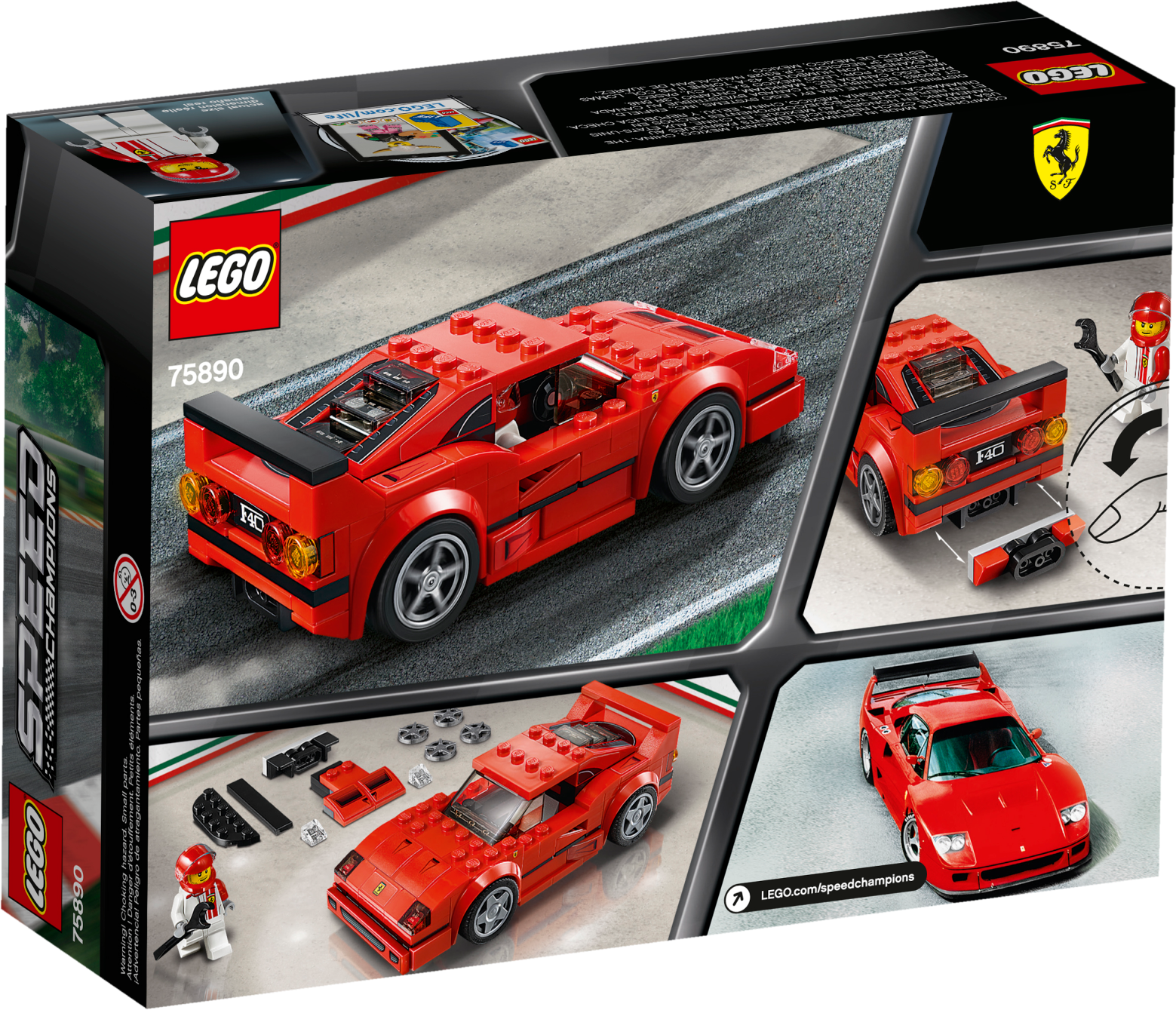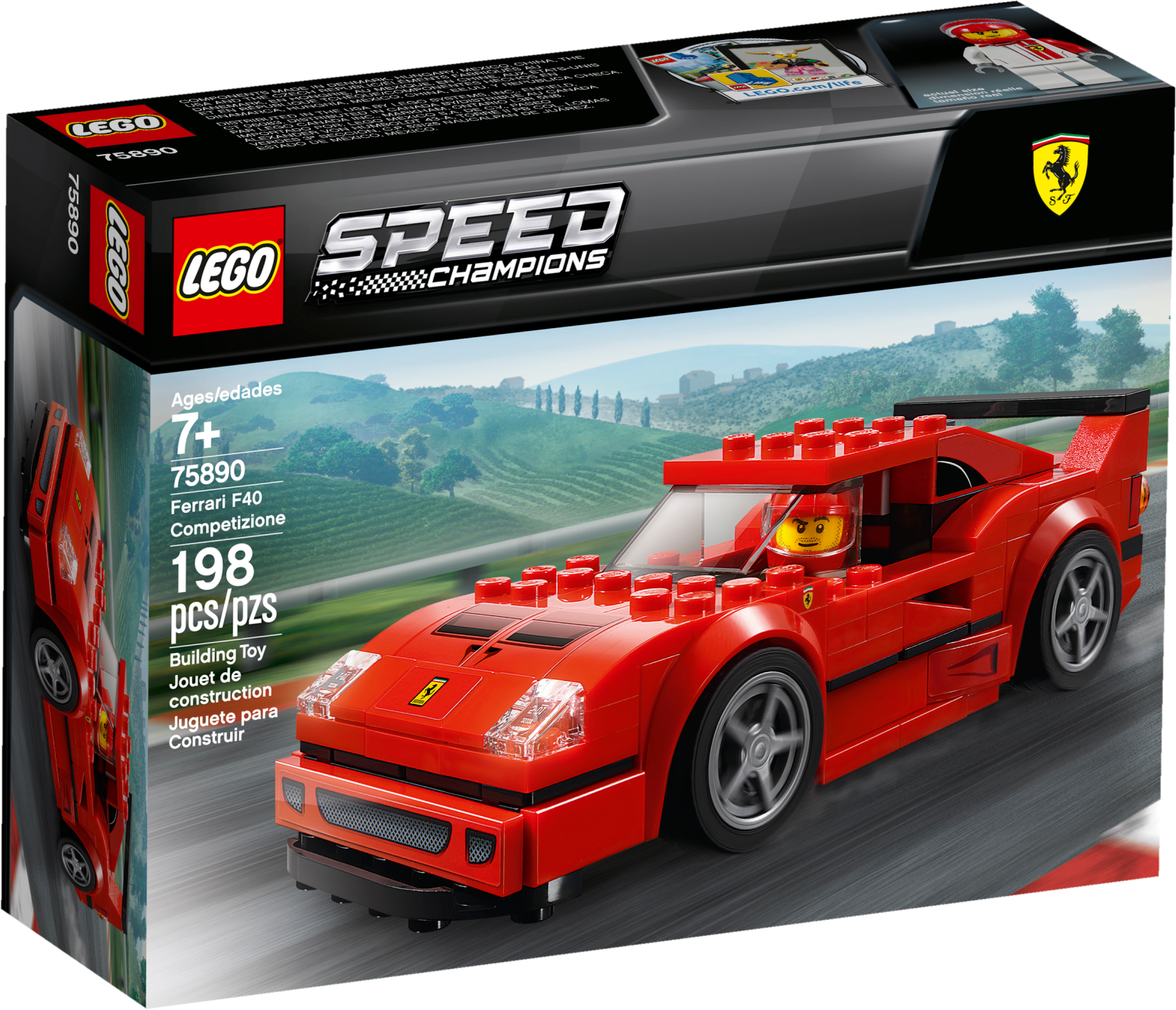 Build, race and display the LEGO® Speed Champions 75890 Ferrari F40 Competizione toy car, then transform it into the classic F40 road car, the last car that Enzo Ferrari oversaw in his lifetime! Packed with authentic details, this 2-in-1 model features a minifigure cockpit with a removable windshield, plus interchangeable hoods and spoilers to turn the Competizione into the road version of the F40. This car toy also includes a Ferrari racing driver minifigure to play out exciting race scenarios. Includes a Ferrari racing driver minifigure. The race-ready, buildable Ferrari F40 Competizione vehicle features a minifigure cockpit with removable windshield, wheels with rubber racing tires, translucent light-style elements, racing colors, authentic design details, plus interchangeable hoods and rear spoilers. Remove the windshield to place the minifigure in the car. Change the hood and the spoiler to transform the F40 Competizione into the classic Ferrari F40 road car. Also includes the Ferrari racing driver’s helmet. Ferrari F40 Competizione car for kids measures over 1” (4cm) high, 5” (13cm) long and 1” (5cm) wide.