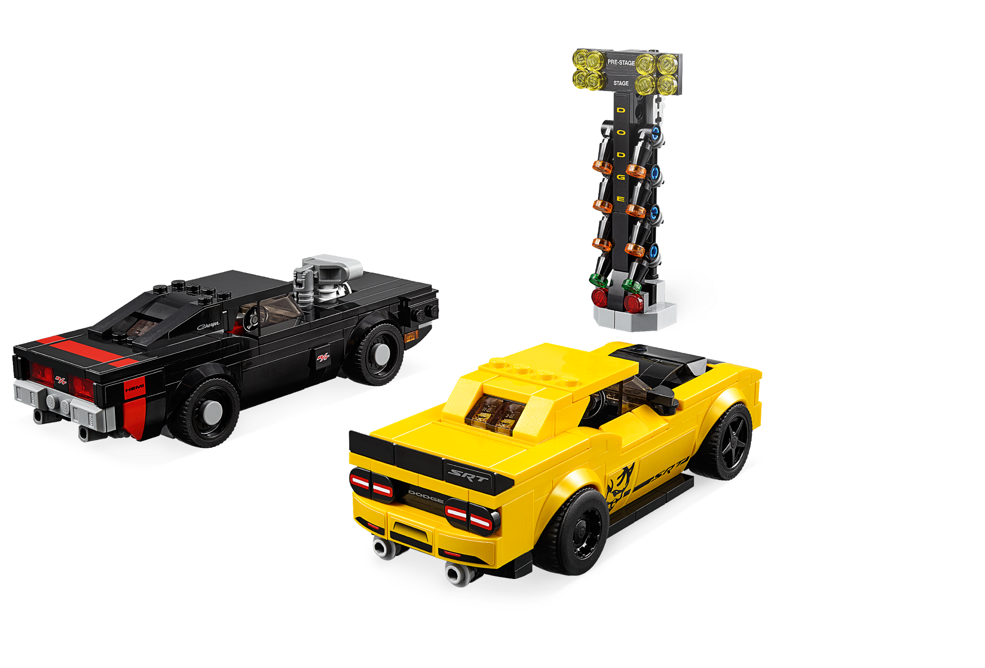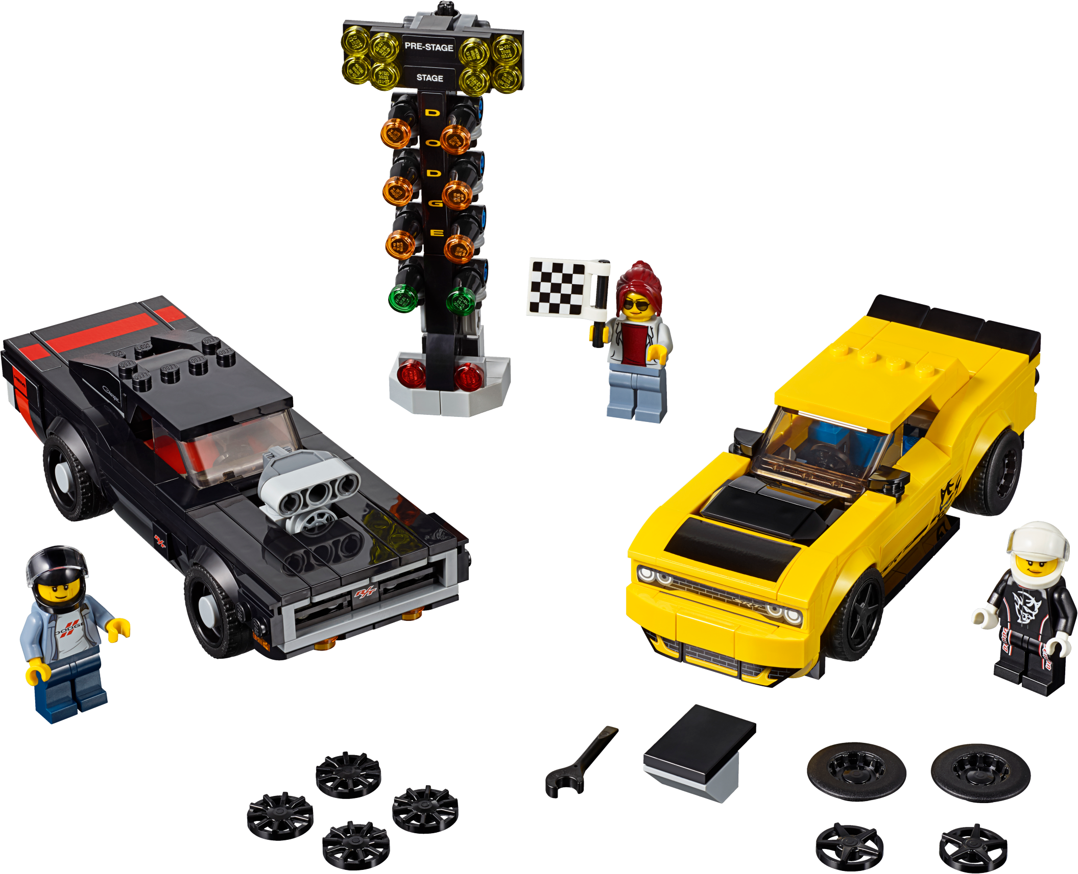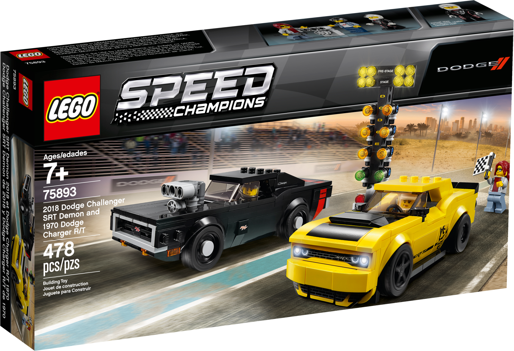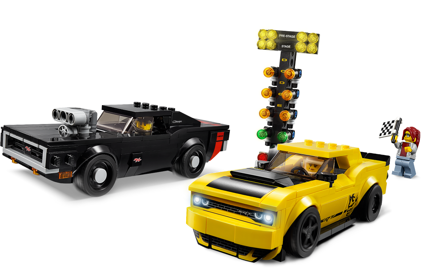 Includes 3 minifigures: a Challenger driver, Charger driver and a race marshal.