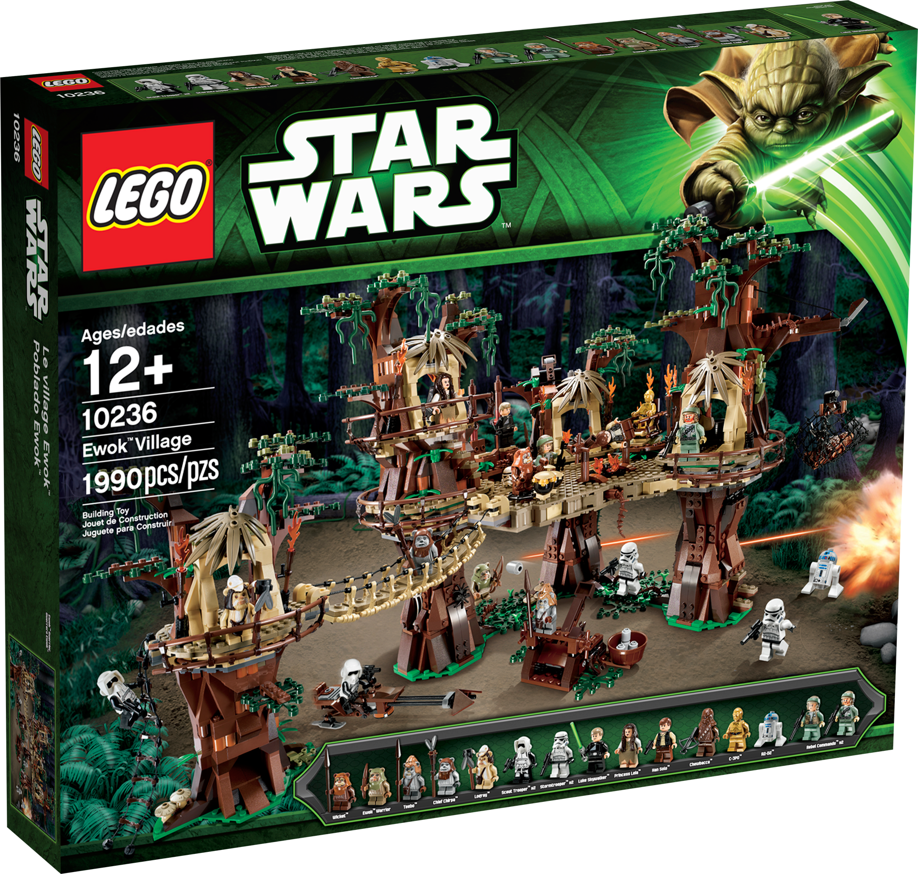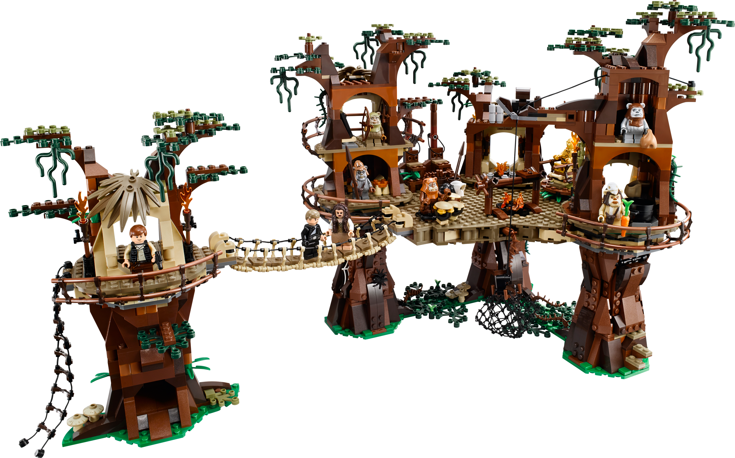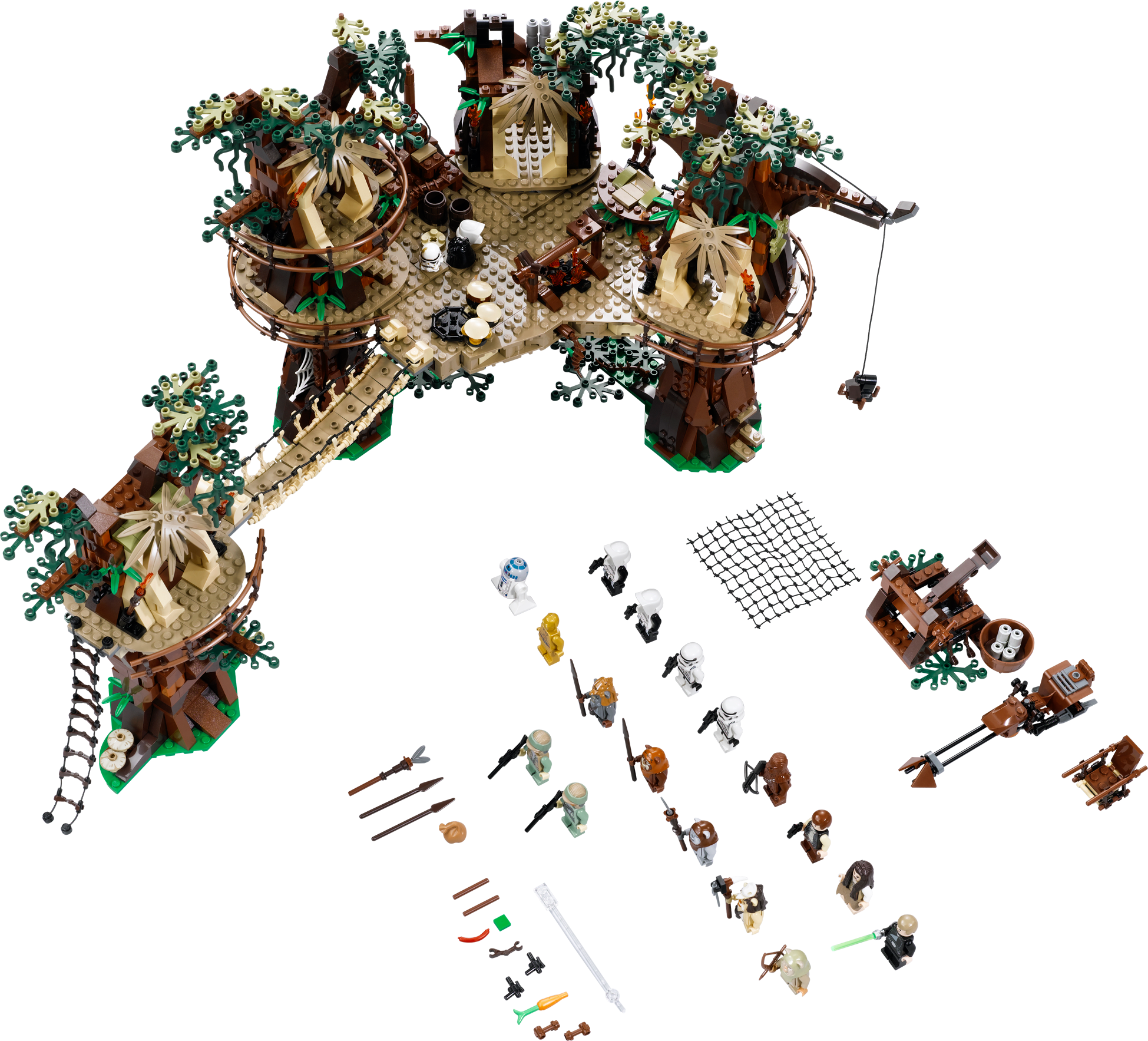 Recreate classic scenes at the Ewok Village! Travel to Endor™ and visit the treetop home of the Ewoks. Just like in Star Wars™: Episode VI Return of the Jedi, this recreation of the Ewoks’ forest dwelling is packed with cool functions, including the tree-trunk hideout, secret Lightsaber stash, spider web, net traps, slide, catapults and an elevating throne. Use the rammer function to take out the Scout Trooper’s speeder - just like in the movie! Realistic details include rope walkways, vine and leaf elements, kitchen, food storage area, bedroom and a planning room. The Ewok Village set is the perfect addition to your LEGO® Star Wars collection. Includes R2-D2™and 16 minifigures with weapons: Luke Skywalker™, Princess Leia™, Han Solo™, Chewbacca™, C-3PO™, 2 Rebel soldiers, 5 Ewoks™ (including Wicket™, Teebo™, Chief Chirpa™ and Logray™), 2 Scout Troopers and 2 Stormtroopers™.• Includes R2-D2™ and 16 minifigures: Luke Skywalker™, Princess Leia™, Han Solo™, Chewbacca™, C-3PO™, 2 Rebel soldiers, 5 Ewoks™, 2 Scout™ Troopers™ and 2 Stormtroopers™• Features tree-trunk hideout and secret Lightsaber stash, spider web and net traps, slide, catapults, elevating throne, speeder rammer function, kitchen, food storage area, bedroom and a planning room• Speeder also included• Weapons include a Lightsaber, 3 blaster pistols, 2 blasters, 2 blaster rifles, 2 spears, bow and a crossbow• Also includes 2 staffs• Collect hard-to-find Endor Princess Leia, C-3PO, Luke, Han Solo and Wicket Ewok minifigures!• Fend off the advancing Imperial forces• Amaze the Ewoks with the elevating throne!• Avoid the spider web and net traps!• Destroy the speeder with the rammer function!• Take refuge in the tree-trunk hideout• Shoot down the slide and join the battle• Fire rocks at the enemy with the catapults!• Measures over 1" (35cm) high, 21" (55cm) wide and 13" (35cm) deep