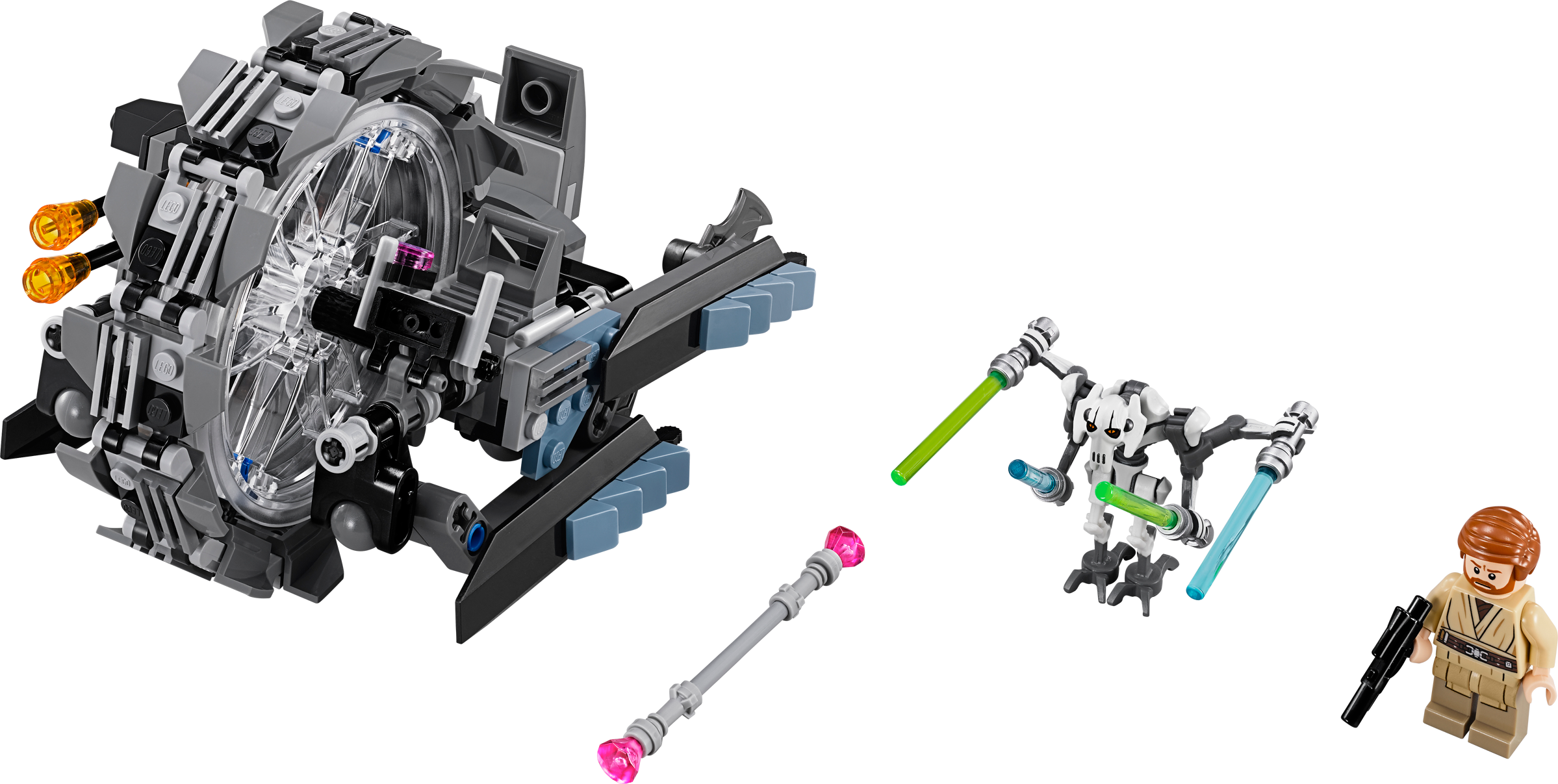 Stop General Grievous’ Wheel Bike™ before he gets away! Beneath the planet surface of Utapau™, Obi-Wan Kenobi™ is in hot pursuit of General Grievous™ on his all-terrain Wheel Bike™ with cool details like a real turning wheel, double laser cannons and flick missile. When the terrain gets tough, extend the fold-out clawed legs and ride the steepest slopes. Can Obi-Wan catch his Separatist rival and bring him to justice? Includes Obi-Wan Kenobi minifigure and General Grievous figure with assorted weapons.Includes Obi-Wan Kenobi™ minifigure and General Grievous™ figure with assorted weaponsFeatures real turning wheel, fold-out clawed legs, double laser cannons, flick missile and a control seatWeapons include a electrostaff, blaster pistol and 4 LightsabersSpin the wheel and speed awayLoad up the flick missile and fireFold out the legs for climbing the steepest slopesCatch General Grievous™ and bring him to justiceRecreate exciting scenes from Star Wars: Episode III Revenge of the SithMeasures over 5” (14cm) high, 6” (16cm) long and 4” (11cm) wide