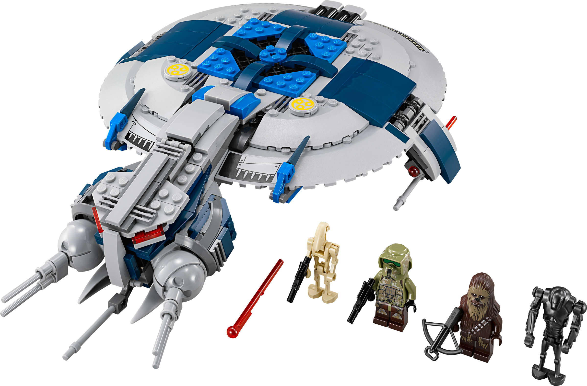 Power up and launch a heavily armored assault with the awesome Droid Gunship™! Bring heavy firepower to the Battle of Kashyyyk with the super-tough Droid Gunship™. Release the bombs, aim the front-mounted laser cannons and fire the powerful new side-mounted, spring-loaded shooters to repel the Republic forces with this heavily armored attack craft. If the heat of battle gets too hot, detach the front section and escape to fight another day! Includes Chewbacca™ and a 41st Elite Corps Trooper™ minifigure plus Super Battle Droid™ and Battle Droid™ figures with assorted weapons.Includes Chewbacca™ and a 41st Elite Corps Trooper™ minifigure plus Super Battle Droid™ and Battle Droid™ figures with assorted weaponsFeatures bomb-release function, new dual side-mounted, spring-loaded shooters, adjustable front-mounted laser cannons, detachable front section, opening cockpit and retractable hatches/landing gearWeapons include a crossbow and a blasterFire the powerful new spring-loaded shooters and release the bombsDetach the front section and make your escapeLoad up the Battle Droid™ and prepare for takeoffTake aim with the cool front-mounted cannonsRecreate exciting scenes from Star Wars: Episode III Revenge of the SithMeasures over 3” (8cm) high, 11” (29cm) long and 8” (22cm) wideCreate an even bigger Battle of Kashyyyk with 75035 Kashyyyk™ Troopers™ and 75043 AT-AP™