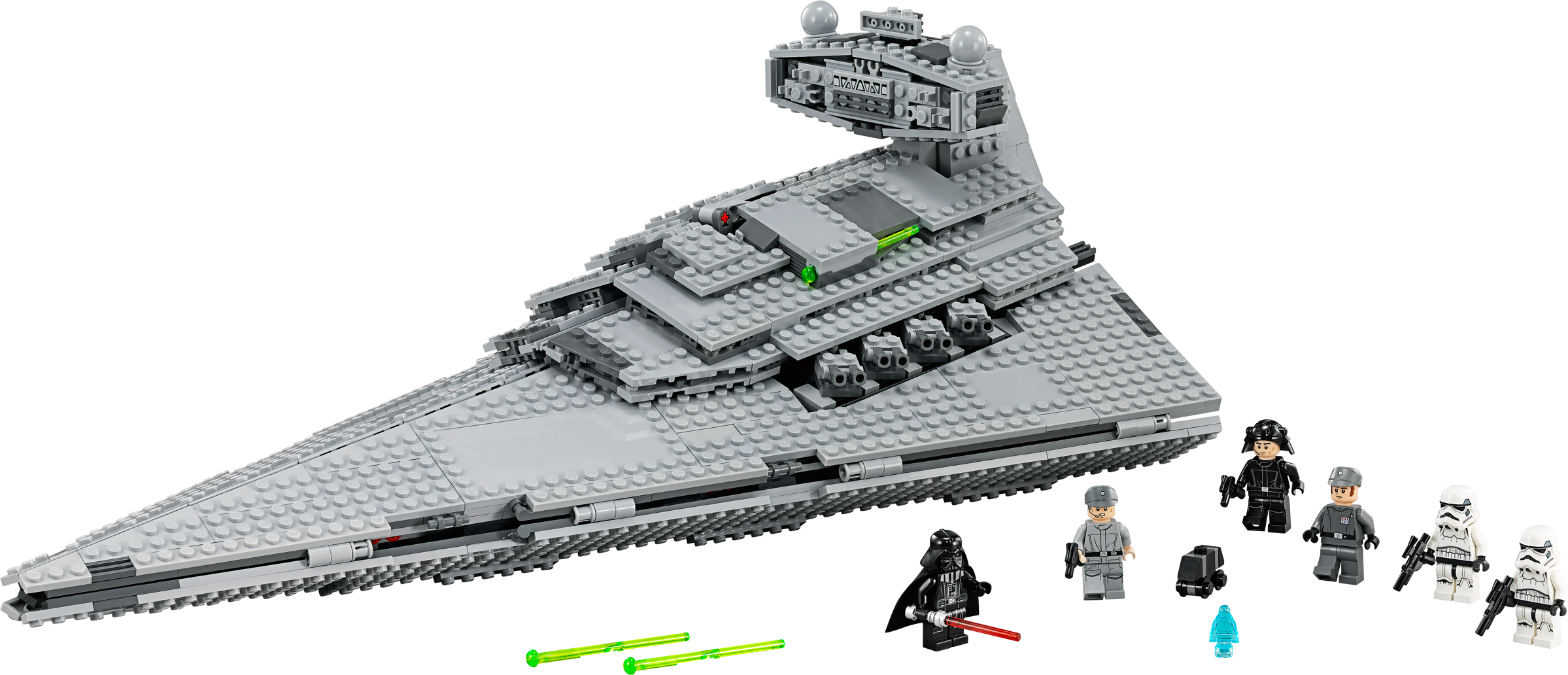Get inside one of the Imperial fleet’s most destructive vessels! Experience the power of the Empire! The Imperial Star Destroyer™ is the signature vessel of the Imperial fleet. Turn the rear handle to aim the 8 synchronized cannons and unleash the spring-loaded shooters mounted on the superstructure. Remove the top to reveal the stunningly detailed interior with never-before-seen Emperor Palpatine hologram, rotating chairs for the crew, weapons rack, bridge, control panel and more. Recreate scenes featuring the evil Sith Lord Darth Vader™ from the classic Star Wars movies with this iconic model and use the lifting handle for enhanced play and easy transportation.Includes 6 minifigures with assorted weapons: Darth Vader™, Imperial Officer, 2 Stormtroopers™, Imperial Crew, Imperial Navy Trooper™, plus 2 new, unique figures: Emperor Palpatine Hologram and a Mouse Droid™Features a lifting handle, removable top and fold-down sides for easy play, 8 synchronized turning cannons, 2 spring-loaded shooters, storage compartment for 2 spare missiles, 7 powerful blue engines, and a detailed interior including rotating Emperor Palpatine hologram, rotating chairs, turning weapon rack, bridge, blue screen and a control panelWeapons include 2 blaster rifles and 2 blastersTurn the handle to aim the 8 synchronized cannonsFire the spring-loaded shootersRotate the never-before-seen Emperor Palpatine hologramPlay out classic Star Wars scenes with the Dark Lord of the Sith, Darth Vader™!Measures over 7” (19cm) high, 19” (50cm) long and 12” (33cm) wide