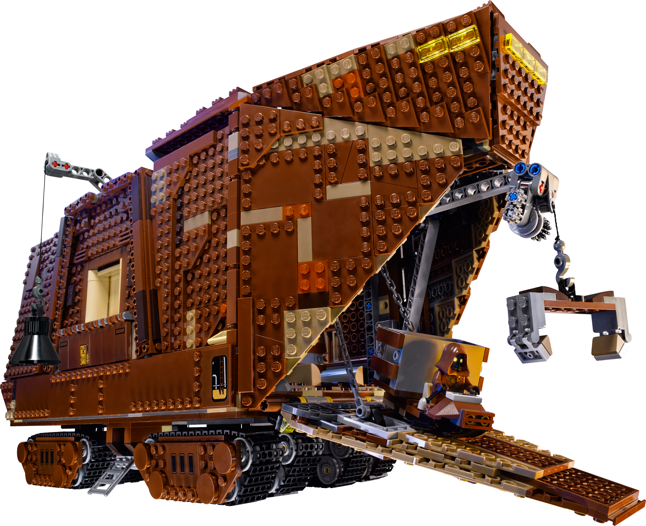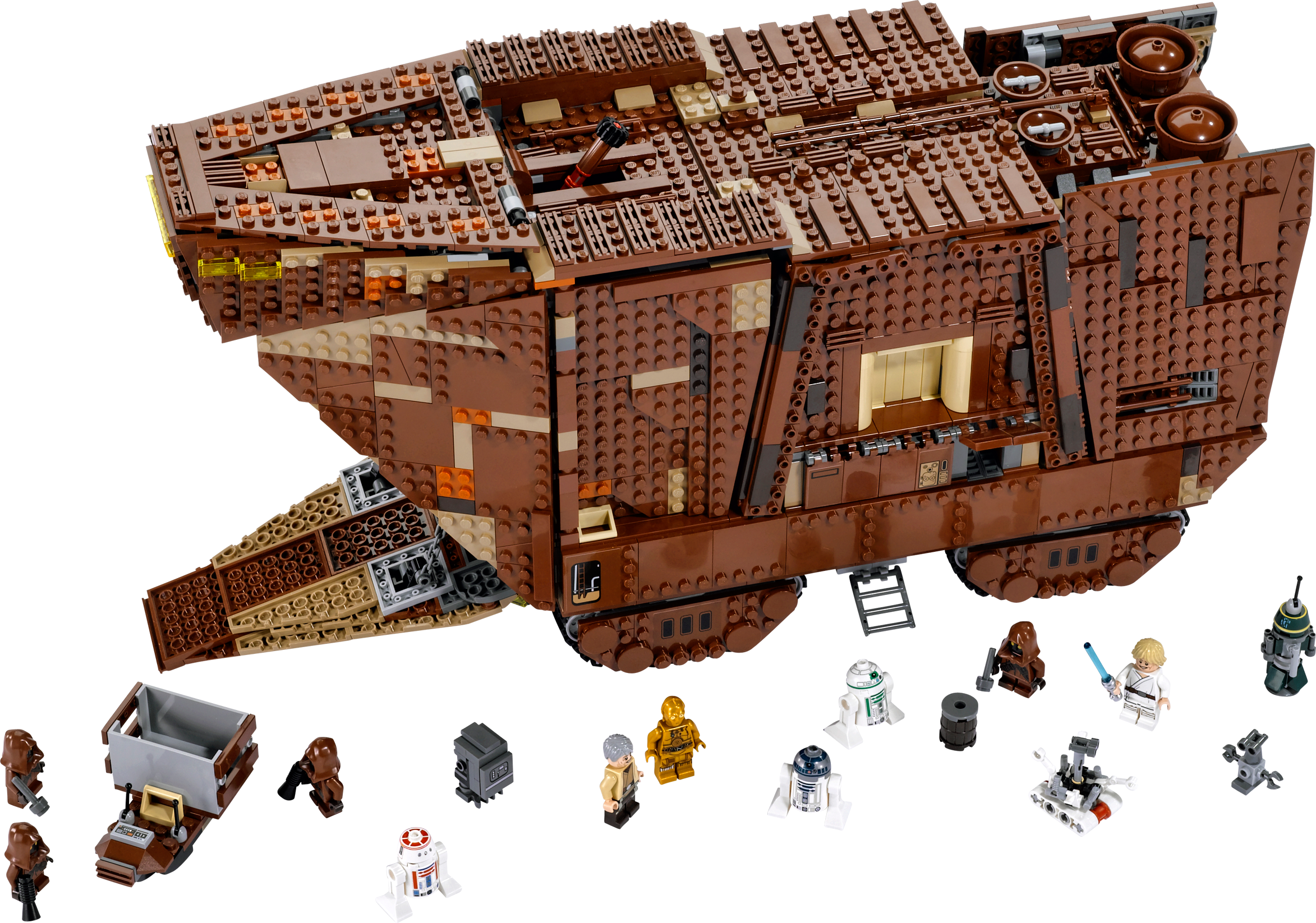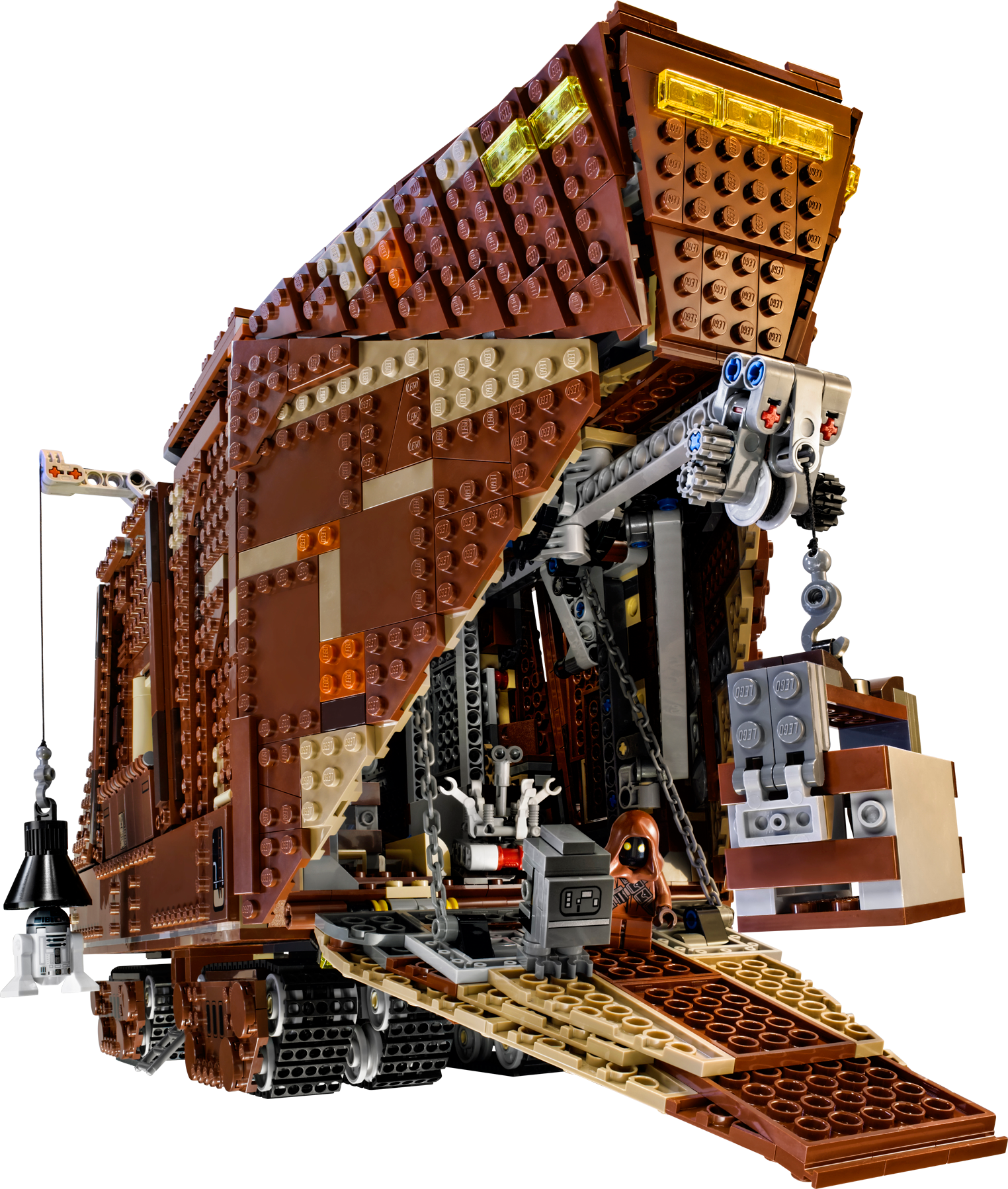 Collect a true icon of the classic Star Wars™ universe – the mighty Sandcrawler™! Recreate unforgettable scenes from Star Wars: Episode IV A New Hope with this amazing LEGO® incarnation of the Jawas’ desert-going vehicle, the Sandcrawler™. Turn the knob at the rear and steer the Sandcrawler into position, lower the front ramp and offload the droids using the 2 working cranes. Luke Skywalker™ and his Uncle, Owen Lars, are sure to be impressed with the selection on offer: there’s R2-D2, an R1-series Droid, an R2 unit, R5-D4™, a Treadwell Droid™, Gonk Droid™ and even C-3PO™. When the sale is complete, lift the side panels and top to reveal more great features inside, like the engine, storage bay, cockpit and more. There’s even a speeder bike for when the Jawas need to venture outside.Includes 7 minifigures: Luke Skywalker™, Uncle Owen, C-3PO™ and 4 Jawas™, plus R2-D2™, R2 unit, an R1-series Droid™, Gonk Droid™, R5-D4™ and a Treadwell Droid™Features 8 tracks with steering function, lowering front ramp, opening side flaps, removable top, working cranes, speeder bike, opening hatch for easy access to the boxes, attachable handles for lifting boxes, and a detailed interior including engine bay, storage bay and cockpitAlso includes stock for old droids and droid partsWeapons include a lightsaber for Luke Skywalker™Sell droids to Luke and his UncleKeep your droids well maintainedPretend to suck R2-D2™ up into the Sandcrawler™ – just like in the movie!Own your own iconic vehicle from the classic Star Wars™ universeRelive classic moments from Star Wars: Episode IV A New HopeMeasures over 9” (24cm) high, 18” (48cm) long and 6” (16cm) wide