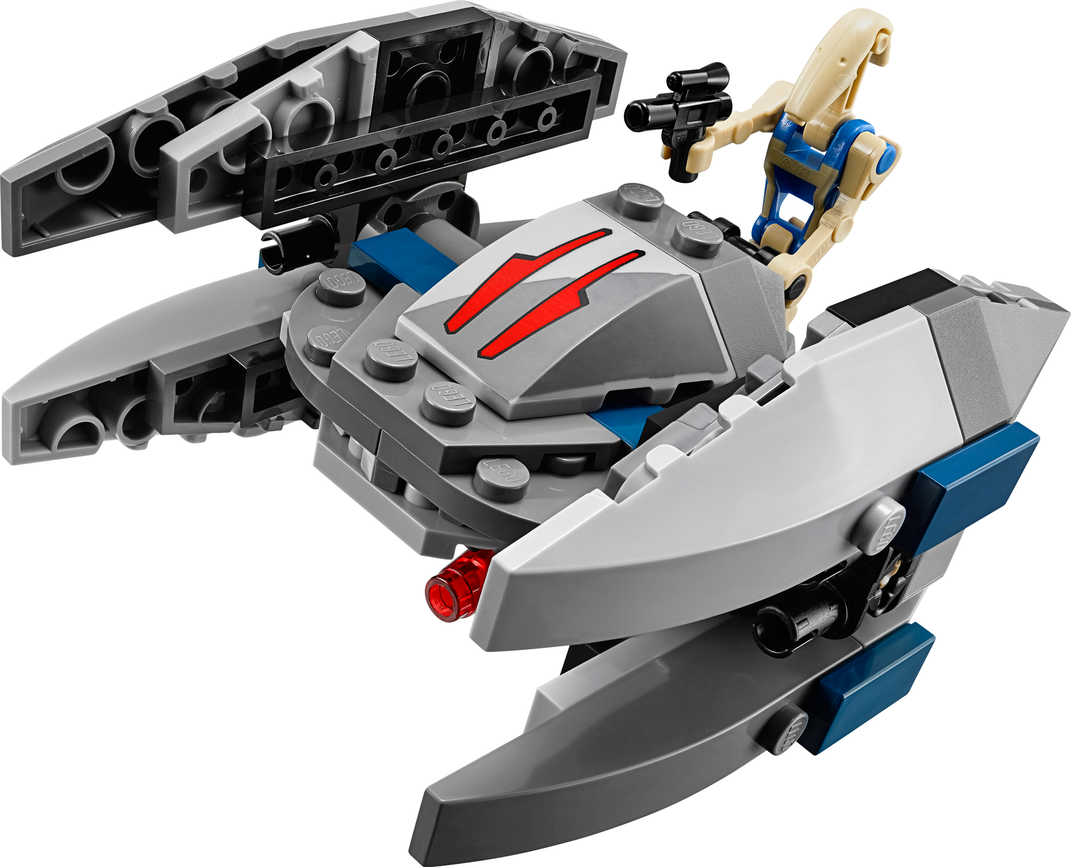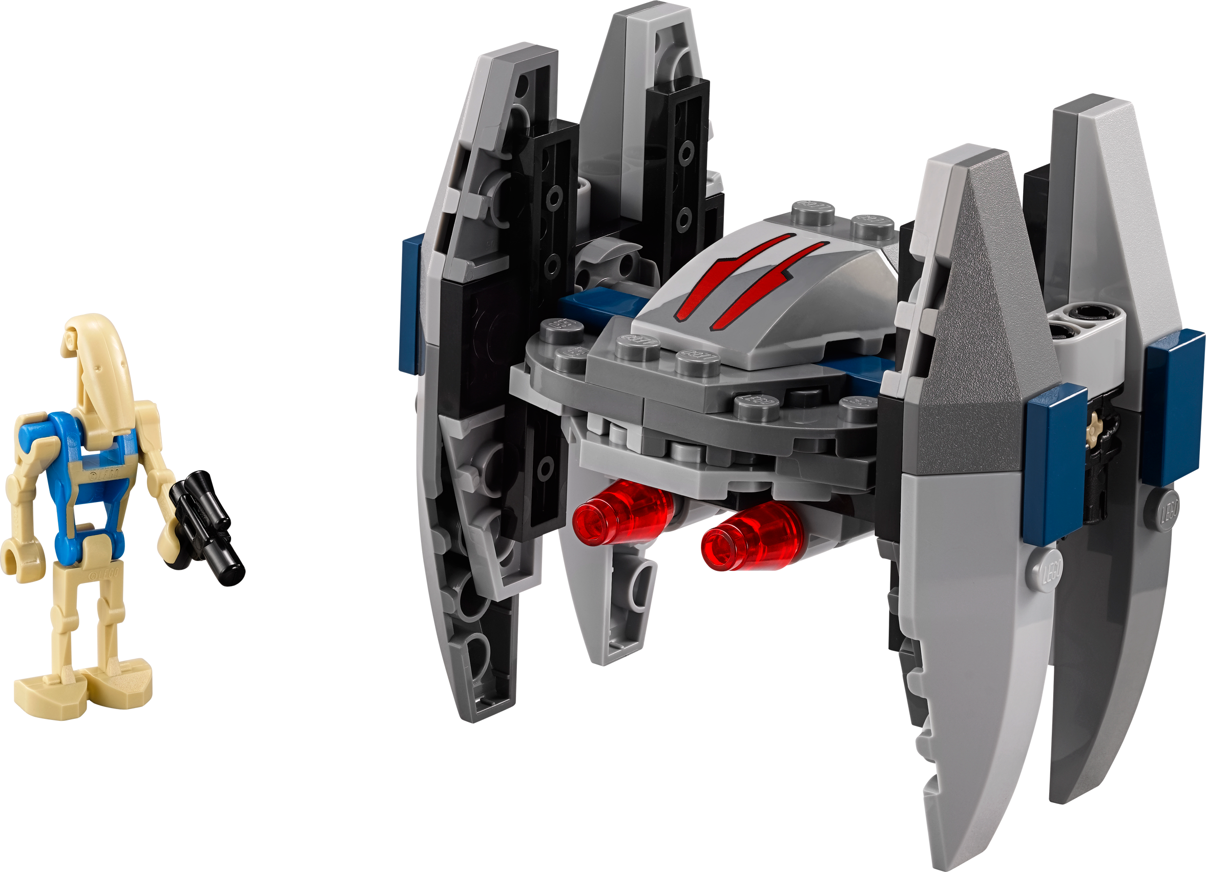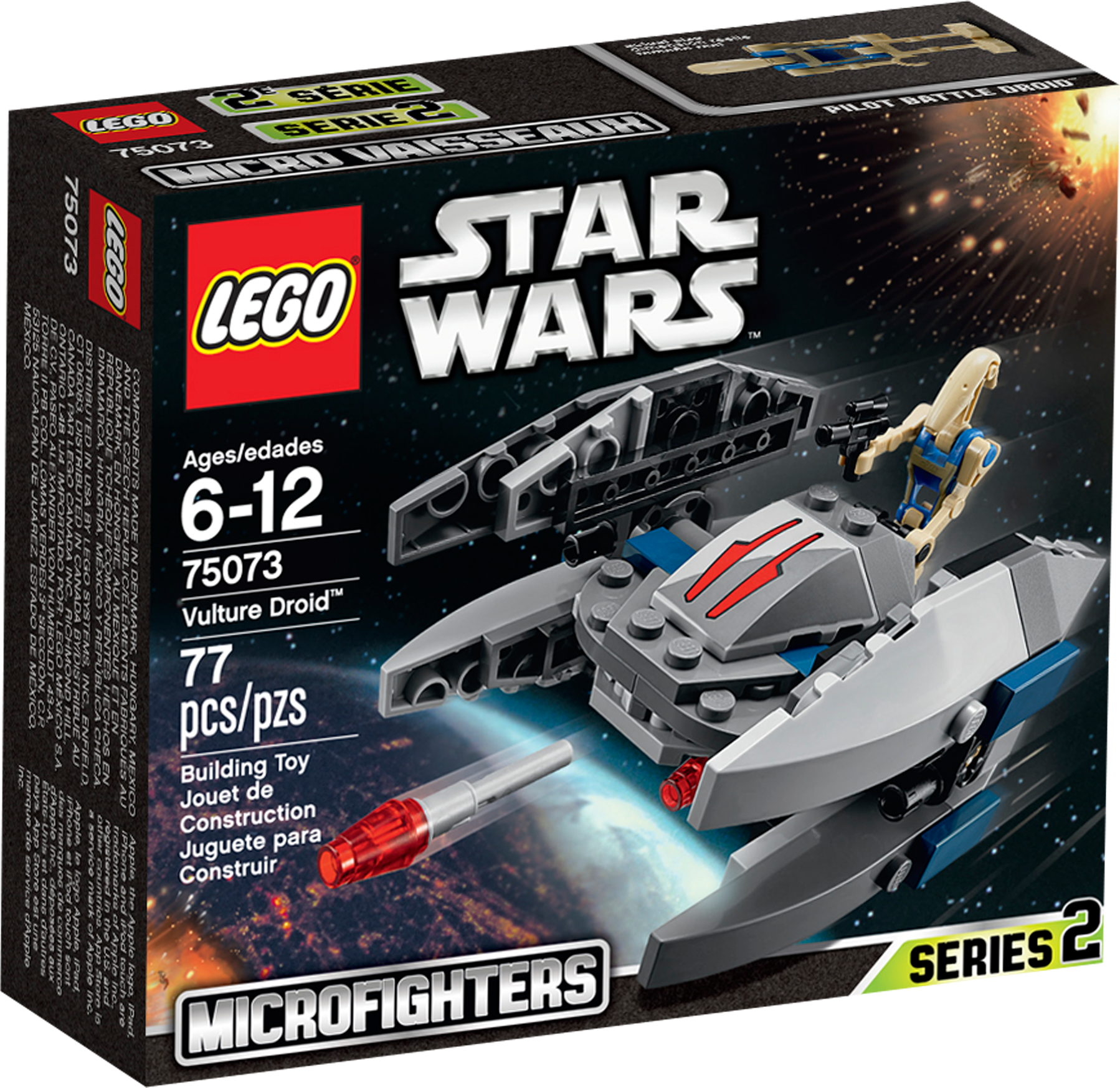 Lead the Vulture Droid microfighter into battle against the Republic! Prepare to attack the Republic with the deadly LEGO® Star Wars Vulture Droid microfighter. This cool mini version of the Separatist attack droid features some great details, like 2 flick missiles, wings that rotate for walker and flight modes, and even a mini cockpit for the Pilot Battle Droid to sit in. Jump in, activate flying mode and go hunt down Republic forces in the skies above Coruscant! Includes a Pilot Battle Droid figure with a blaster pistol Includes a Pilot Battle Droid figure with a blaster pistol Features realistic detailing, 2 flick missiles, rotating wings for walker and flight modes and a mini cockpit for the Pilot Battle Droid minifigure to sit in Rotate the wings and speed into space Amazing miniature version of the Droid featured in the Star Wars movies! Track down and intercept the 75072 LEGO® Star Wars ARC-170 Starfighter As seen in Star Wars: Episode III Revenge of the Sith Measures over 3” (9cm) high, 1” (4cm) long and 3” (8cm) wide in walker mode, and over 2” (7cm) high, 3” (8cm) long and 3” (8cm) wide in flight mode