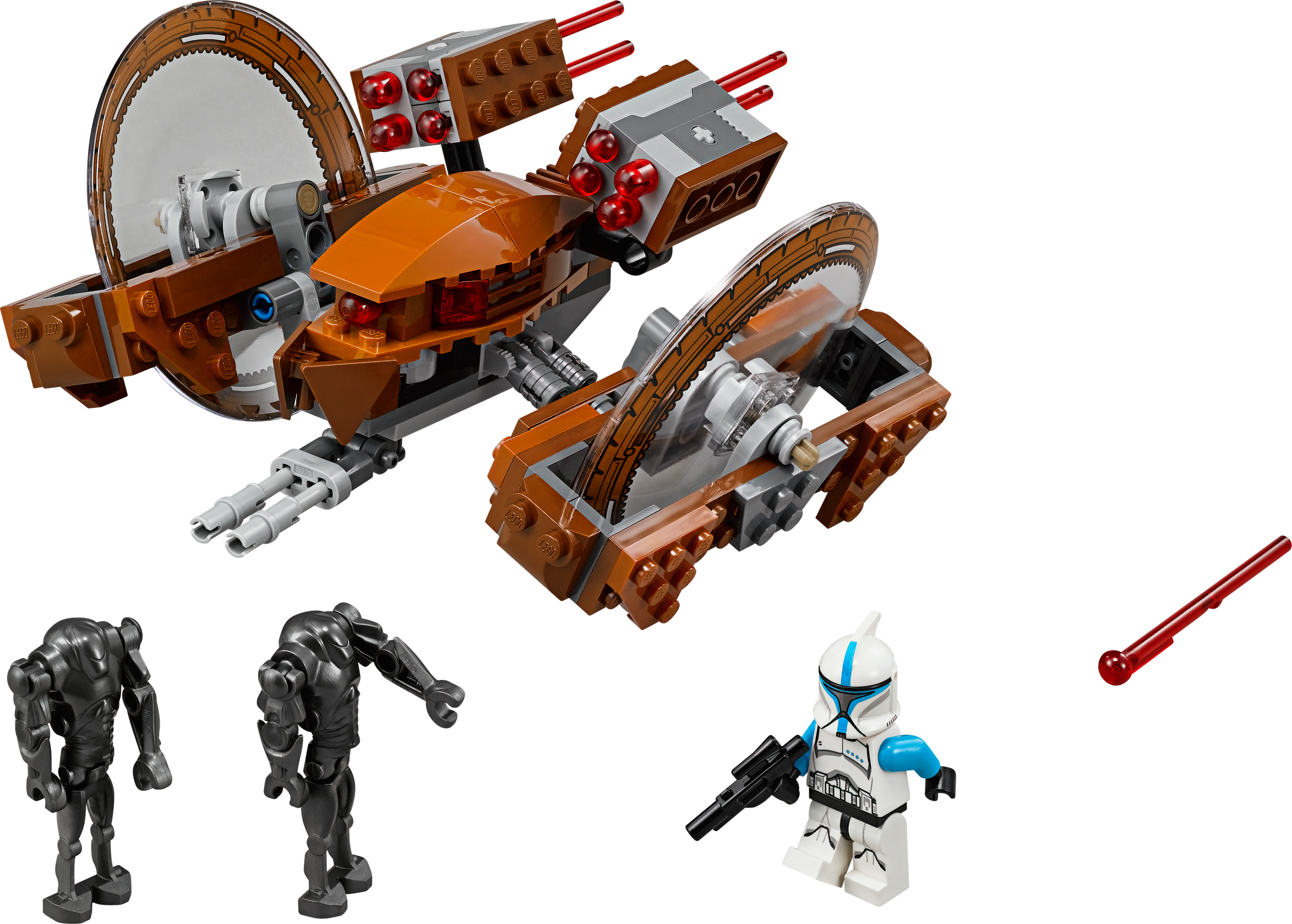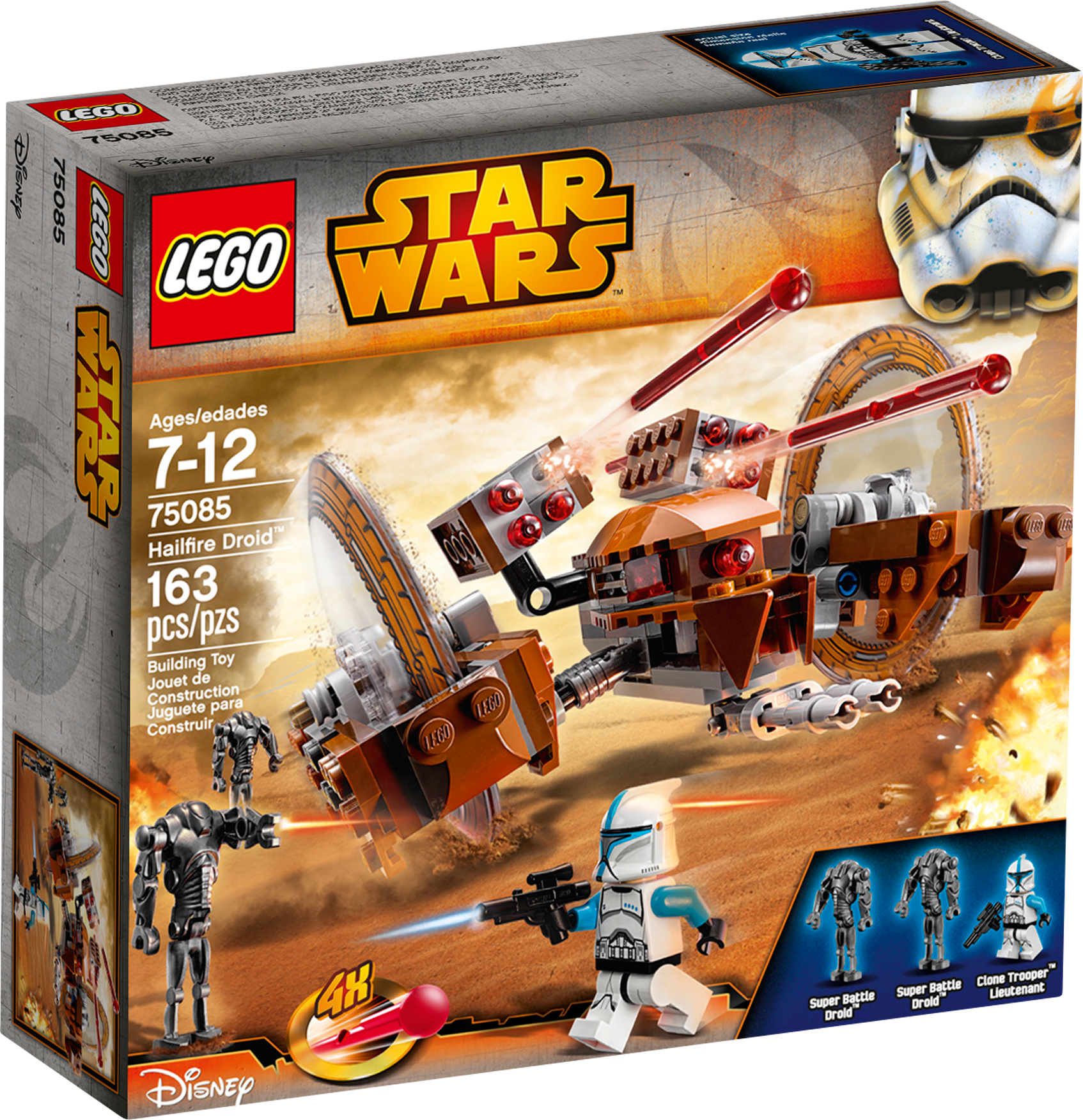 Call in mobile firepower with the amazing Hailfire Droid! Roll into battle against the clone army on Geonosis with the devastating LEGO® Star Wars Hailfire Droid! As featured in Star Wars: Episode II Attack of the Clones, this highly maneuverable Droid can speed across any terrain on its huge wheels to join the battle. As well as giant rotating wheels, this armored Droid features folding side pylons, an adjustable gun and 4 awesome spring-loaded shooters. Includes a Clone Trooper Lieutenant minifigure with a weapon and 2 Super Battle Droids. Includes a Clone Trooper Lieutenant minifigure with a weapon and 2 Super Battle Droids Features giant rotating wheels, folding side pylons, an adjustable gun and 4 spring-loaded shooters Also includes a blaster Unleash the 4 spring-loaded shooters Roll into battle and cause some havoc! Extend the pylons for attack mode Avoid the Super Battle Droids As featured in Star Wars: Episode II Attack of the Clones Hailfire Droid (in attack mode) measures over 3” (8cm) high, 5” (13cm) long and 5” (15cm) wide