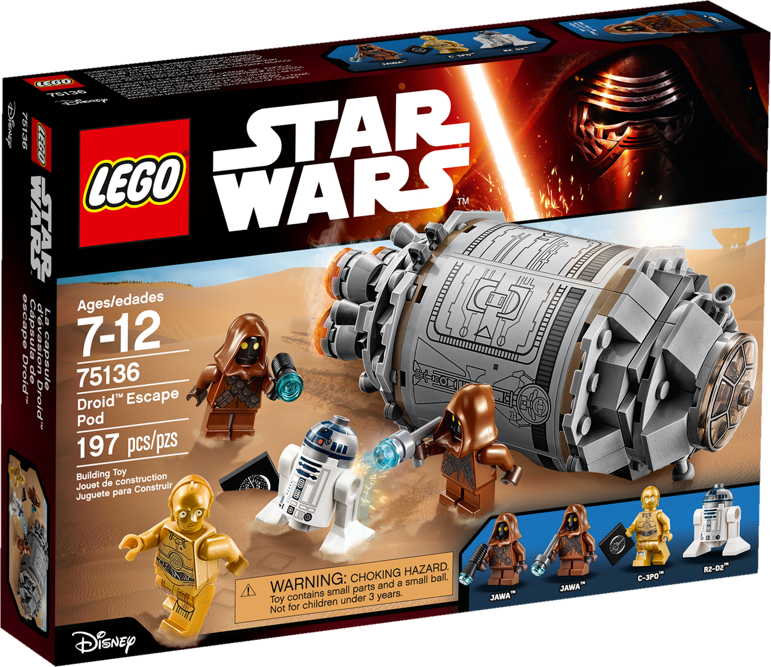 Help the droids escape with the Death Star plans! C-3PO and R2-D2 are in danger and they need your help to escape! Load them into the Droid Escape Pod, close the hatches and launch to safety. After landing on the nearest planet, can you keep them safe from the Jawas with their ion blasters? That’s for you to decide. Includes 3 minifigures: C-3PO and 2 Jawas, plus an R2-D2 Astromech Droid. Features opening hatches, large engines at the back and a detailed interior with space for 2 characters and a display showing the top-secret Death Star plans. Includes 2 Jawa ion blasters. Recreate the unforgettable opening scenes from Star Wars: Episode IV A New Hope. Measures over 2” (7cm) high, 5” (14cm) long and 2” (6cm) wide with hatches closed, and over 5” (13cm) wide when open.
