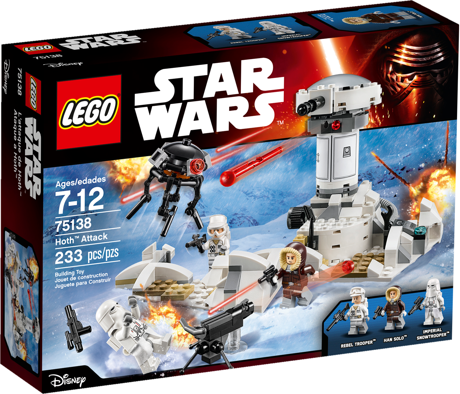 Defend the Hoth rebel base from Imperial attack! The Imperial forces have discovered the location of the secret Rebel base and are attacking. Turn the tower, close the hatch and fire the shooter. Look out for the Snowtrooper firing his stud shooter and destroy the Imperial Probe Droid before it gets too close. Can you help Han Solo and the rebels stop the base from being overrun? Only you can decide. Includes 3 minifigures: Han Solo, a Rebel Trooper and an Imperial Snowtrooper. Features a foldout Echo Base with a rotating tower with opening hatch and flick missile, trench, Imperial Probe Droid and an Imperial stud shooter. Fold out the base for an even bigger model. Fire the flick missile from the tower to defend the base. Use the stud shooter to attack the Imperial Snowtrooper. Weapons include a blaster rifle, blaster and a blaster pistol. Accessory elements include a shovel,wrench, and 2 helmets. Recreate unforgettable ice-planet battles from Star Wars: Episode V The Empire Strikes Back. Rebel base measures over 4” (12cm) high, 5” (14cm) wide and 4” (12cm) deep.