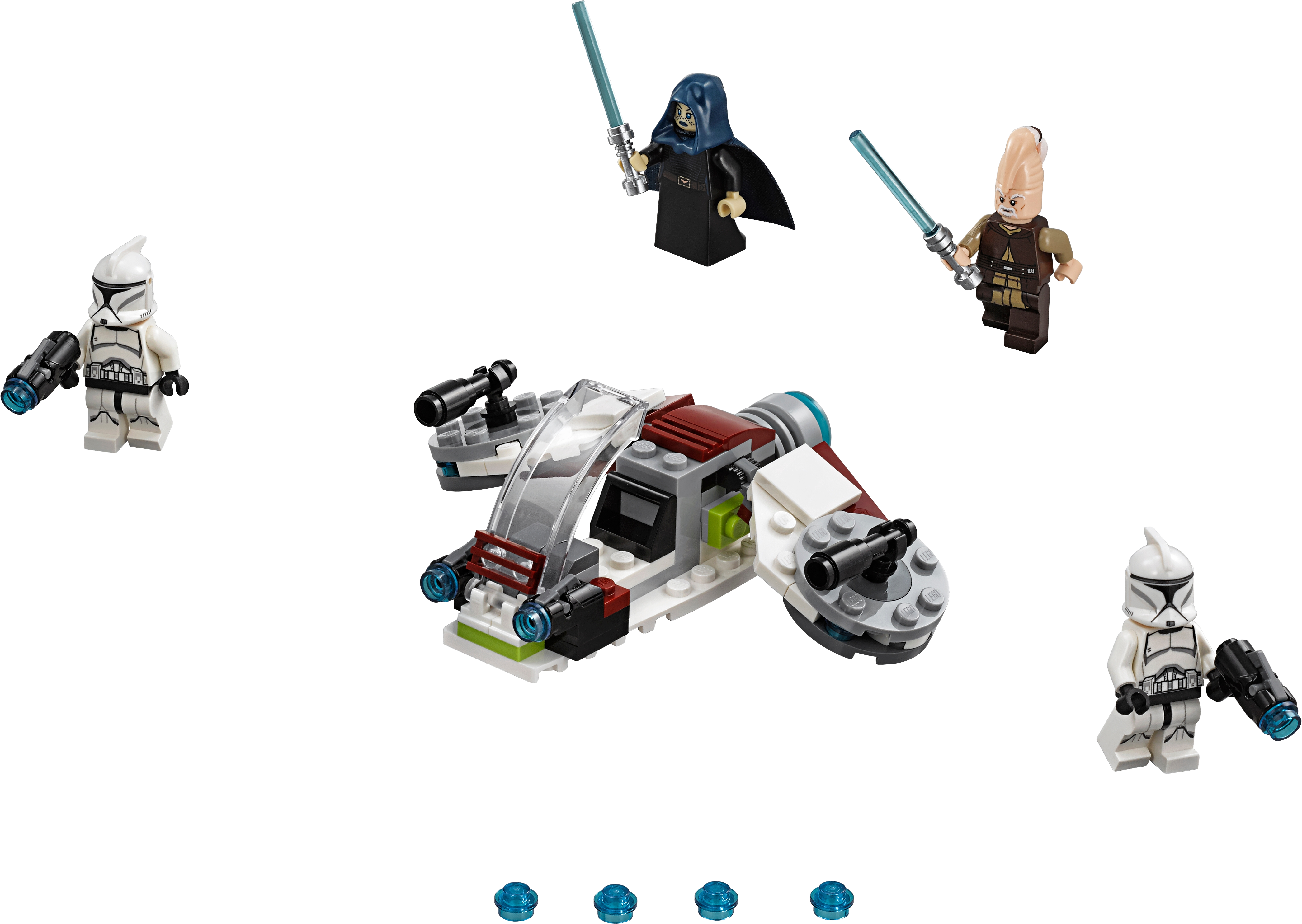 Command your own LEGO® Star Wars Jedi & Clone Trooper squad with this fun battle pack, featuring 2 Lightsaber-wielding Jedi warriors, 2 Clone Troopers with stud blasters and a speeder with stud shooters and rotating wingtip guns. Includes 4 minifigures: Ki-Adi Mundi, Barriss Offee and 2 Clone Troopers. Features a speeder with opening canopy and space for a Clone Trooper inside, 2 stud shooters and rotating guns on the wingtips. Weapons include 2 stud blasters for the Clone Troopers and 2 Lightsabers. This LEGO® Star Wars toy is suitable for ages 6-12. Speeder measures over 1” (5cm) high, 3” (10cm) long and 4” (12cm) wide.