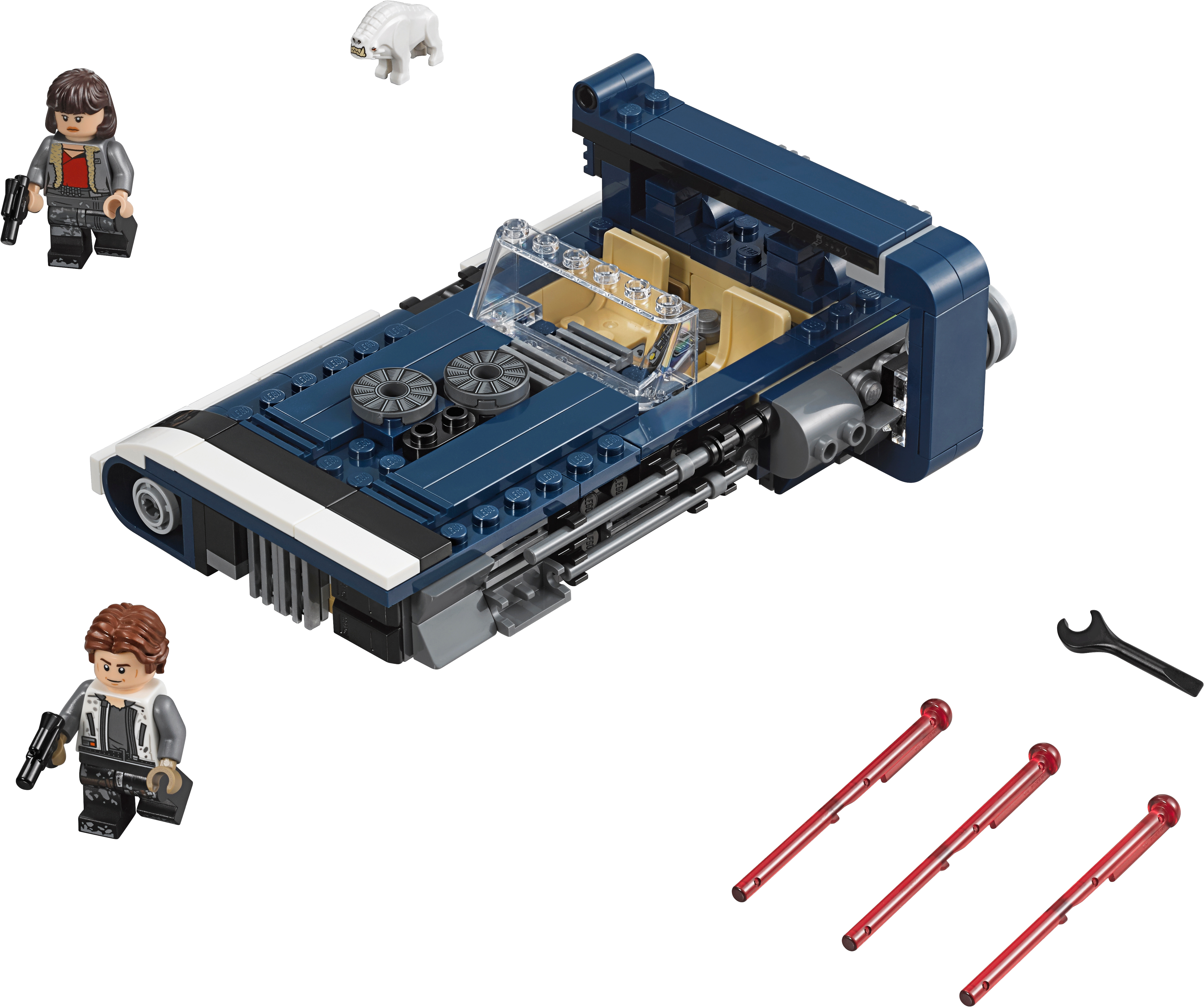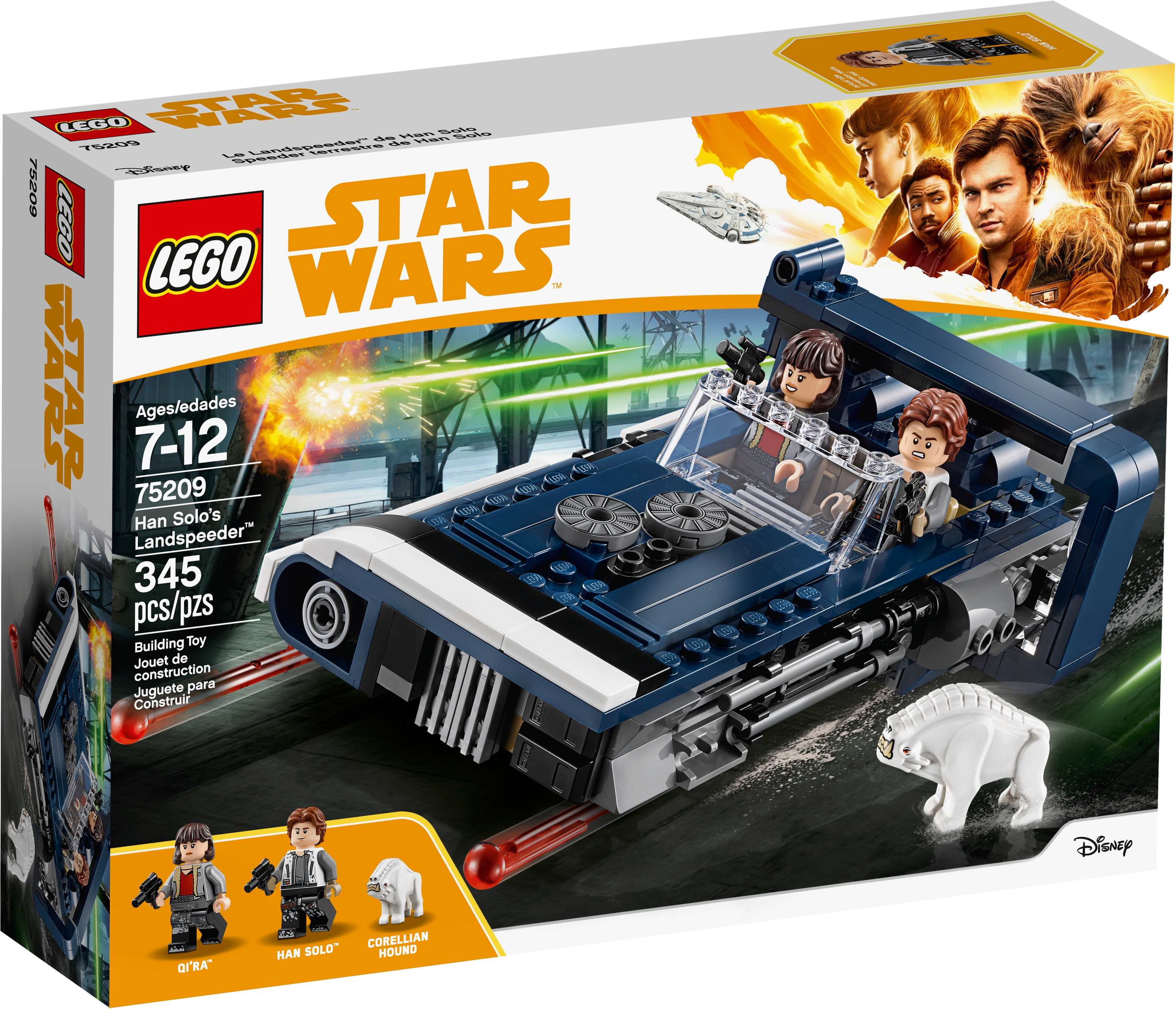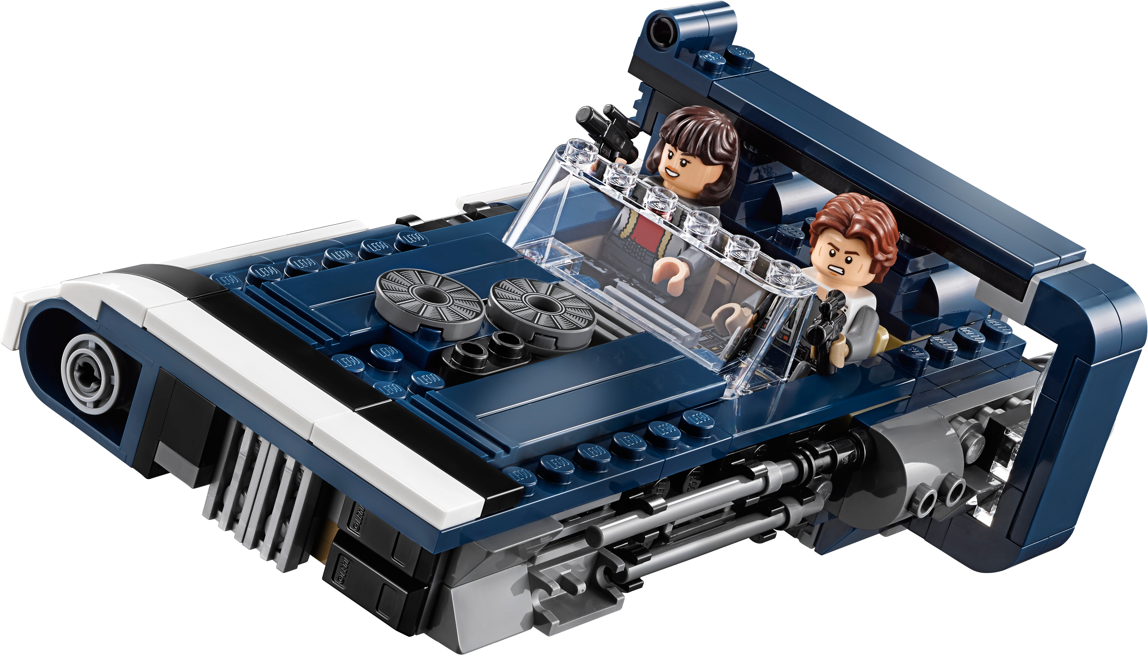 Recreate high-speed LEGO® Star Wars action scenes from the Han Solo movie with Han’s Landspeeder. Featuring an open 2-minifigure cockpit, opening hood with storage compartment, removable engine, rear storage compartment with secret cargo, hidden wheels for a hover effect and 2 spring-loaded shooters, this action-packed Star Wars toy also includes a Corellian Hound figure for Han and Qi'ra to battle. Includes Han Solo and Qi’ra minifigures, plus a Corellian Hound figure. Features an open 2-minifigure cockpit, opening hood with ammo and accessory storage, removable engine, rear storage compartment with secret cargo, hidden wheels for a hover effect, and 2 spring-loaded shooters. Remove the engine for a much-needed overhaul. Also includes 2 blaster pistols. Play out epic Han Solo movie chase scenes with 75210 Moloch's Landspeeder! This LEGO® Star Wars toy is suitable for ages 7-12. Measures over 1” (5cm) high, 6” (16cm) long and 3” (10cm) wide.