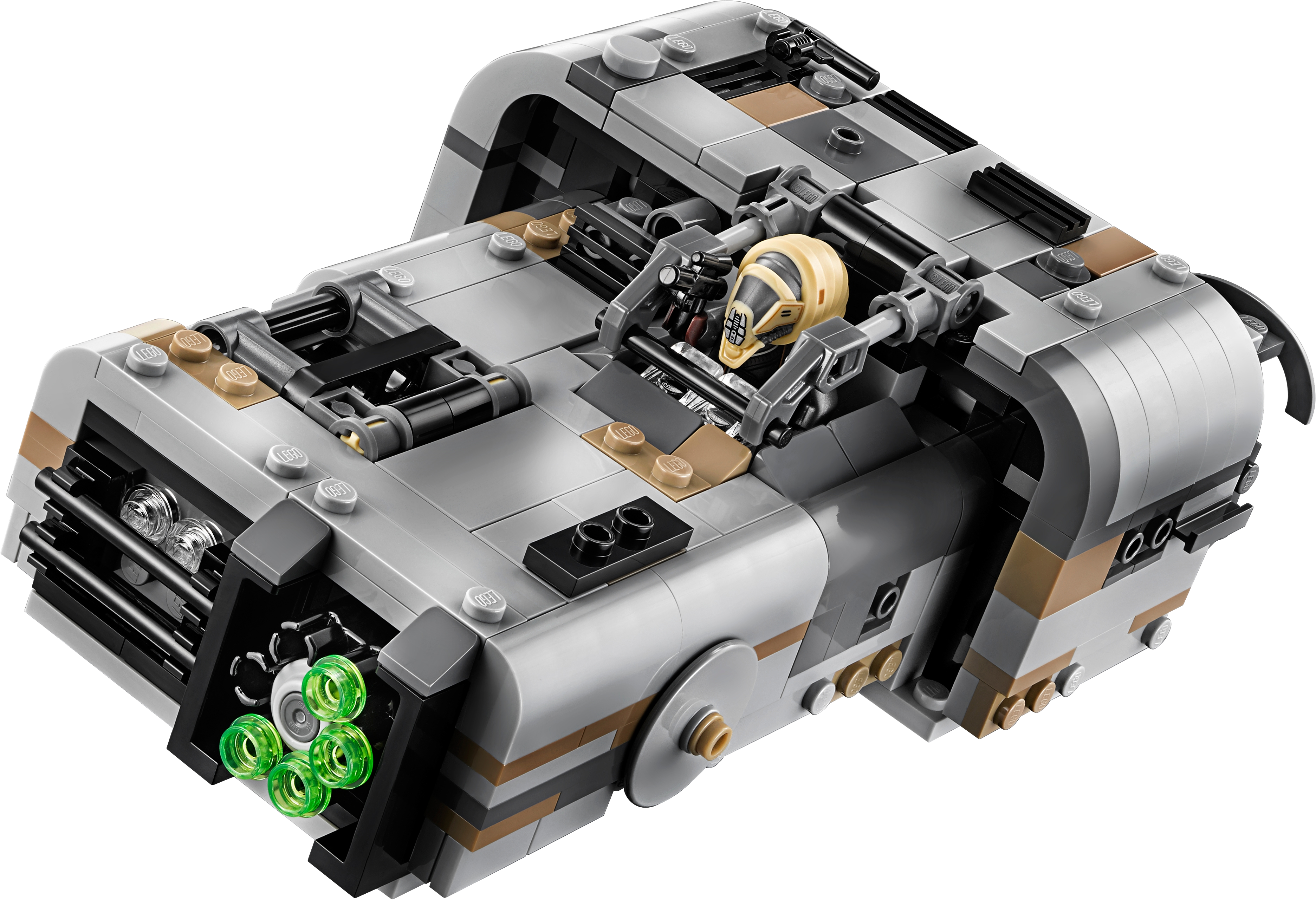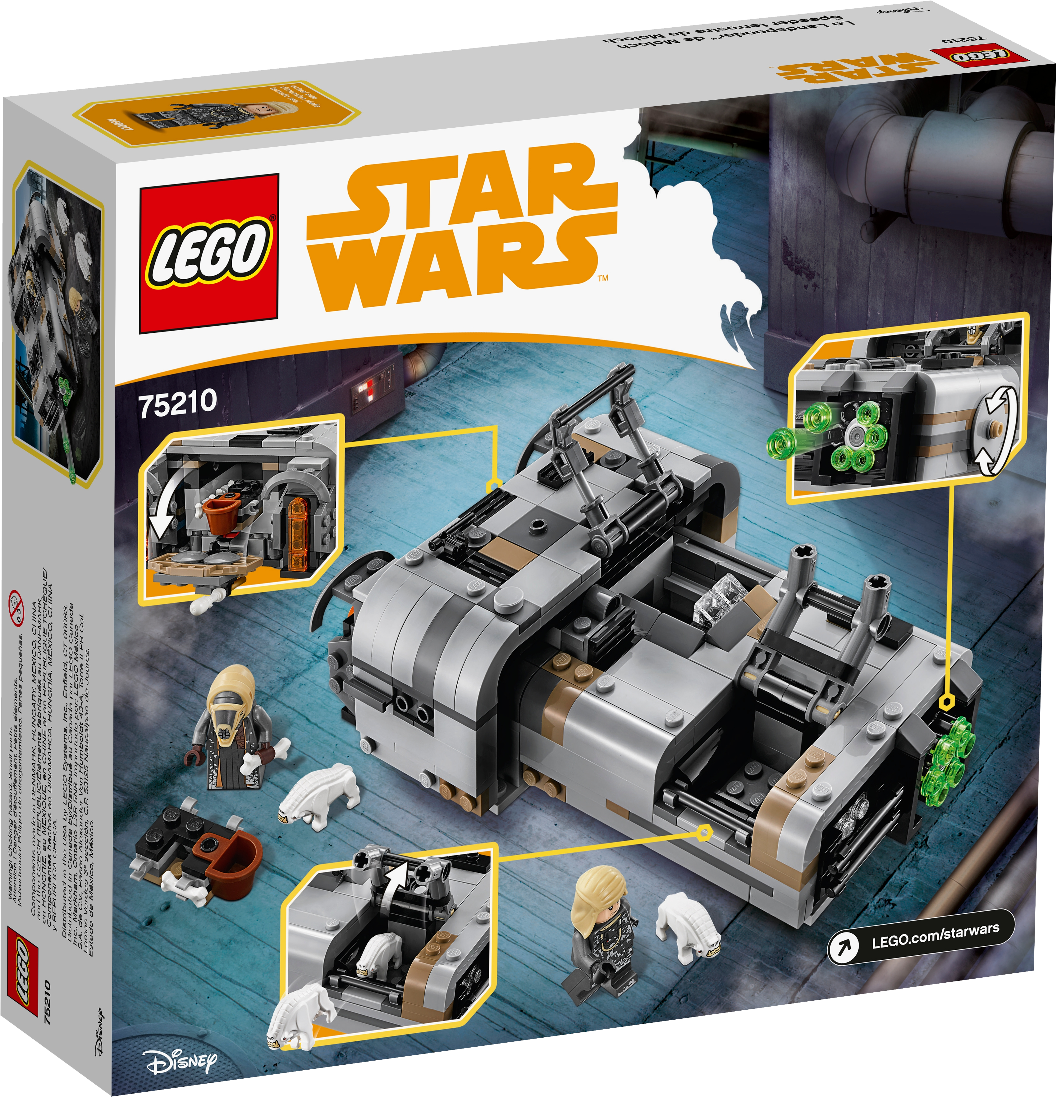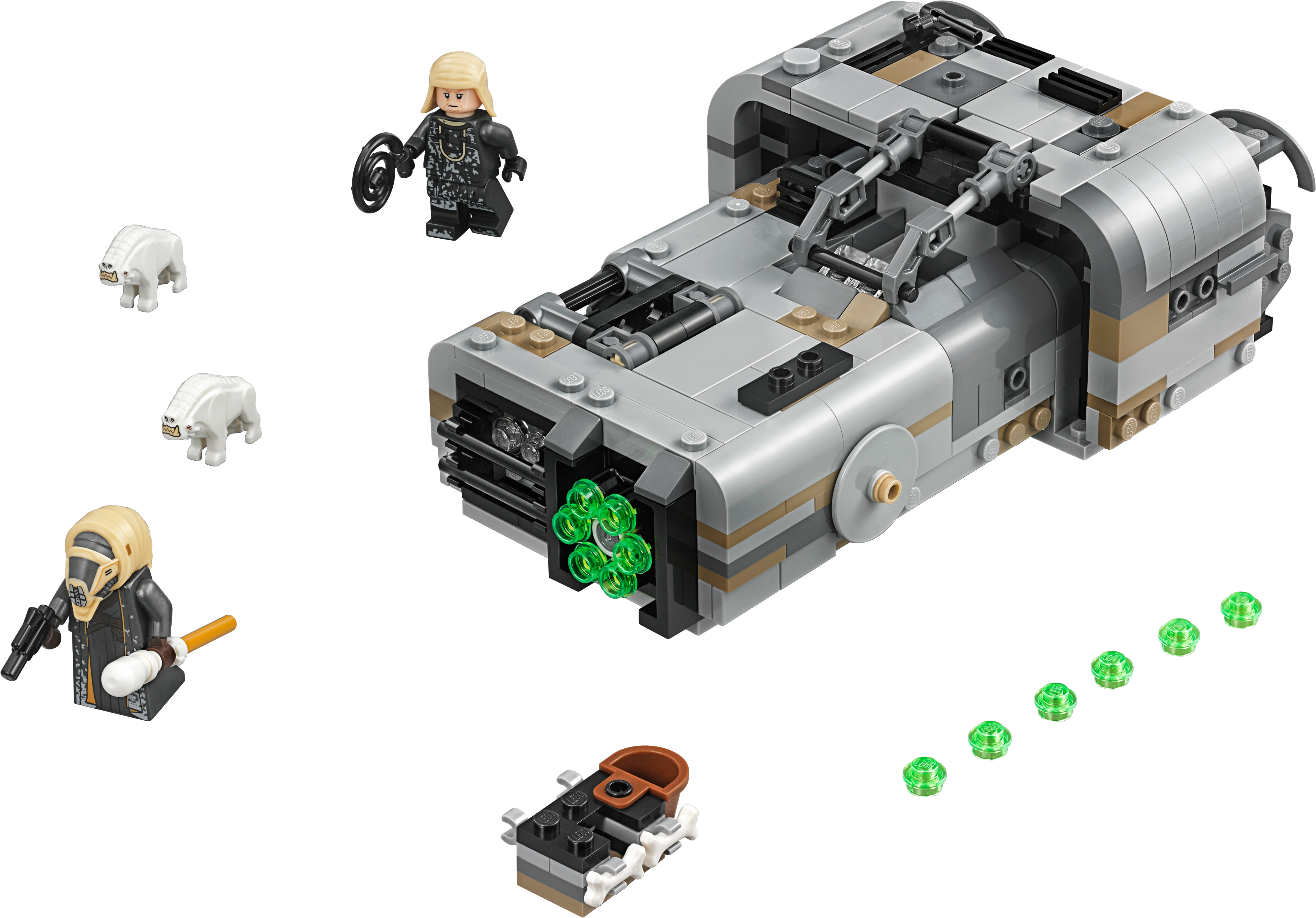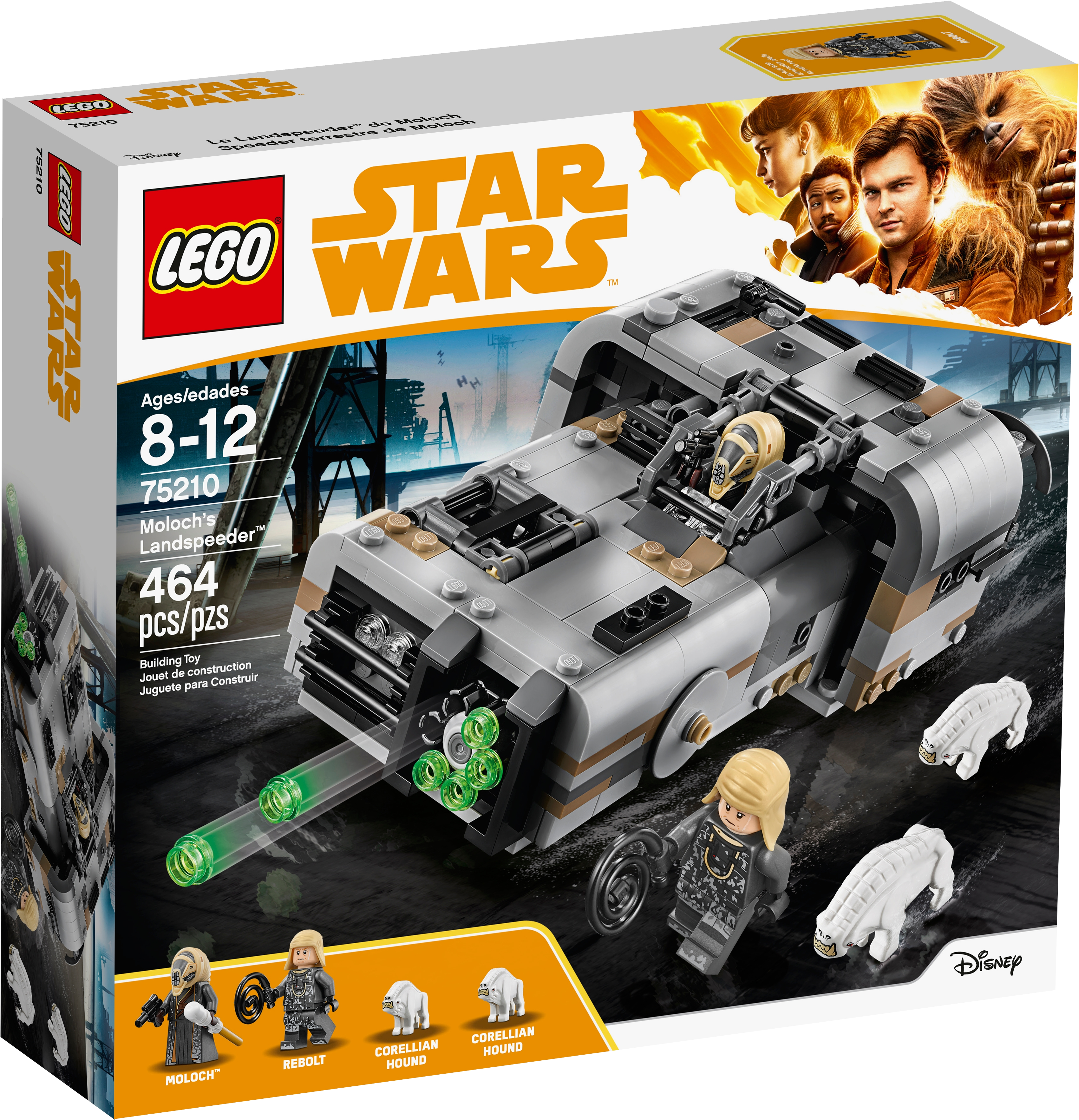 Recreate action-filled scenes from the Han Solo movie with this LEGO® Star Wars Moloch’s Landspeeder set. The infamous gang leader’s vehicle features an open minifigure cockpit, storage hold at the rear and hidden wheels for a cool hover effect. This Star Wars toy also has a 6-stud rapid shooter for intense action play, and an opening cage to hold the 2 Corellian Hound figures to add an extra dimension of battling fun for any LEGO Star Wars fan! Includes Moloch and Rebolt minifigures, plus 2 Corellian Hound figures. Features an open minifigure cockpit, opening cage for the hounds, rear storage hold, multi-stud shooter and hidden wheels for a hover effect. Also includes Moloch’s blaster pistol and Rebolt's whip. Play out epic Han Solo movie chase scenes with 75209 Han Solo's Landspeeder! This LEGO® Star Wars toy is suitable for ages 8-12. Measures over 2” (6cm) high, 6” (16cm) long and 4” (11cm) wide.