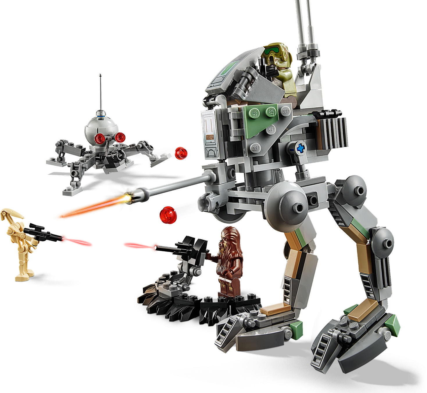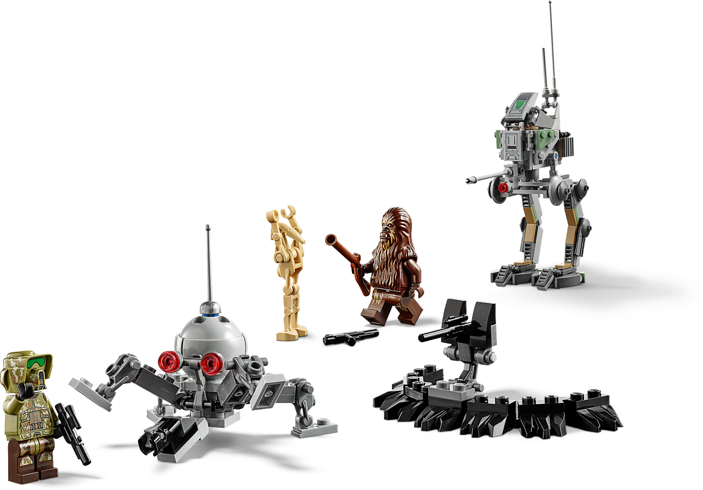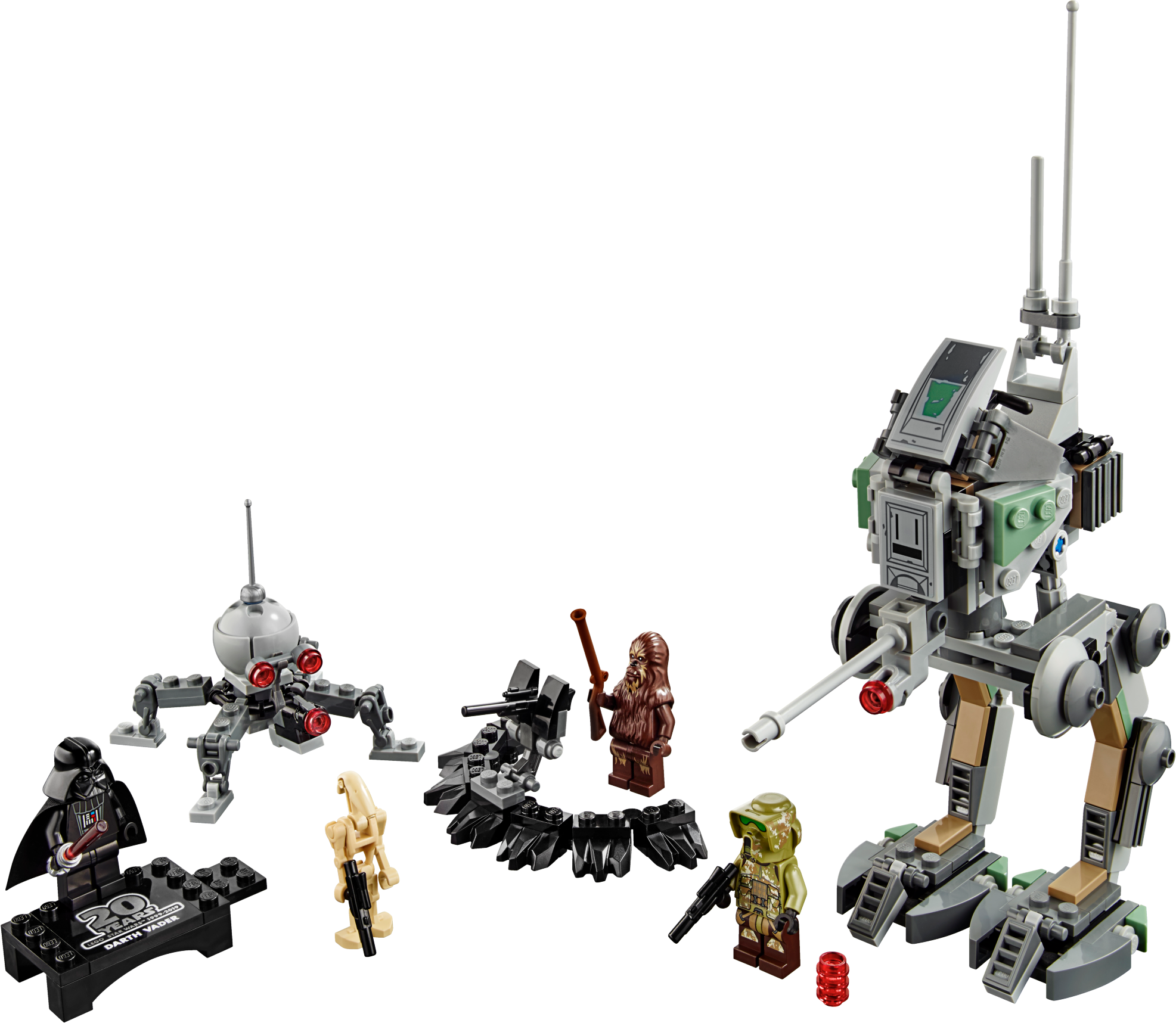 Includes 3 LEGO® Star Wars™ minifigures: a Kashyyyk Trooper, Wookiee Warrior and bonus 20th anniversary Darth Vader on a detachable display stand, plus a Battle Droid LEGO figure. Features an AT-RT Clone Scout Walker, Dwarf Spider Droid and a trench section with a non-firing gun. AT-RT features posable legs, turning turret, a seat on top for a minifigure and a stud shooter at the front. Dwarf Spider Droid features posable legs, movable antenna and a stud shooter. Weapons include the Battle Droid’s blaster, Kashyyyk Trooper’s blaster, Wookiee warrior’s rifle and Darth Vader’s red Lightsaber. This LEGO® Star Wars™ construction toy is a reinterpretation of the 7250 Clone Scout Walker from 2005 and makes a great LEGO Star Wars collectible construction toy for builders of any age. The Battle Droid's head decoration is new for April 2019. Darth Vader minifigure is a faithful reproduction of the original minifigure from 1999 and includes a 20th anniversary logo. Connect the LEGO® Star Wars™ 20th anniversary minifigure display stands for the perfect collector’s item. Recreate epic battles from the Star Wars™ saga or make up your own creative play action! AT-RT LEGO® Star Wars™ vehicle with antenna measures over 8” (21cm) high, 5” (14cm) long and 2” (7cm) wide. Dwarf Spider Droid kids building toy measures over 3” (8cm) high, 2” (7cm) long and 2” (7cm) wide.