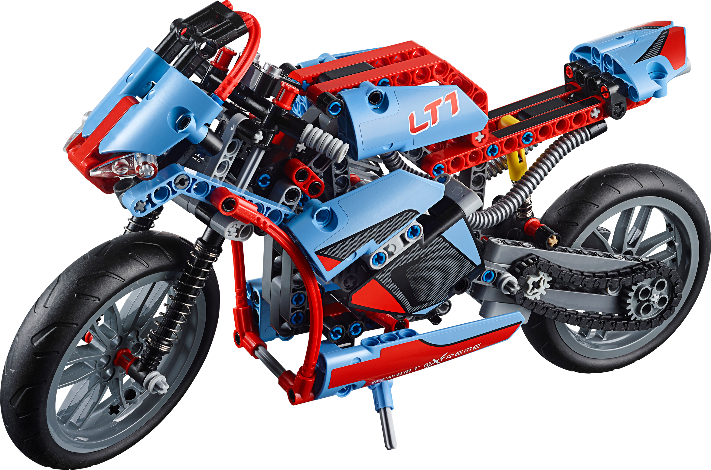 Cruise on the open road with the awesome LEGO® Technic Street Motorcycle! This cool, sturdy model has all the features of the real-life machine, including full fairing, rugged front and rear suspension, chain drive, working steering, kickstand, detailed engine with moving pistons and a sporty, light blue and red color scheme. Experience the joy of motorcycling! This 2-in-1 model rebuilds into a cool Retro Bike.
