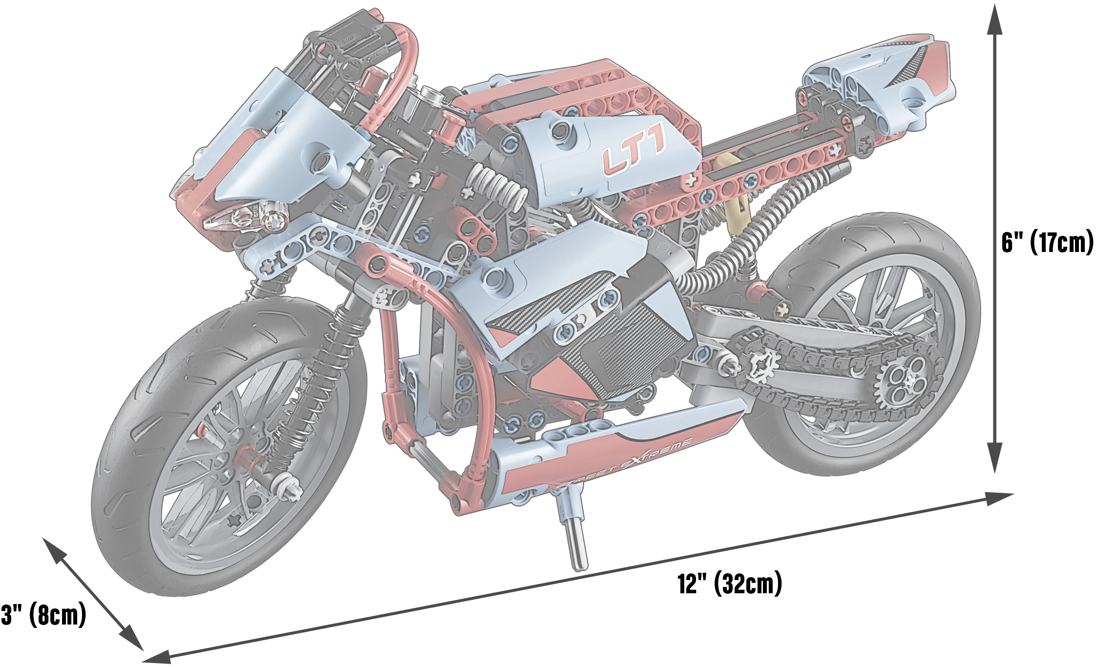 Street Motorcycle measures over 6” (17cm) high, 12” (32cm) long and 3” (8cm) wide