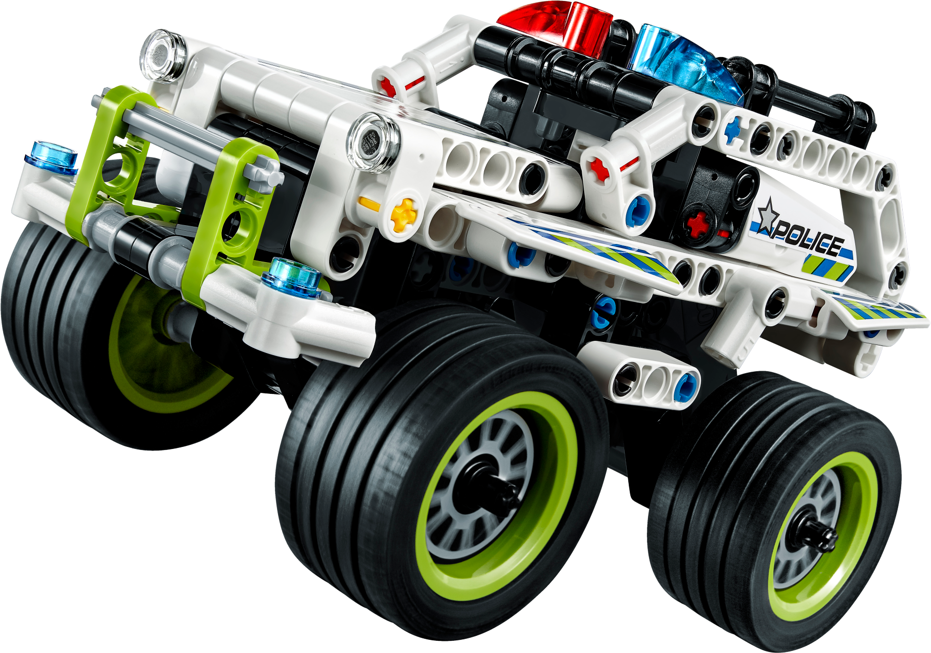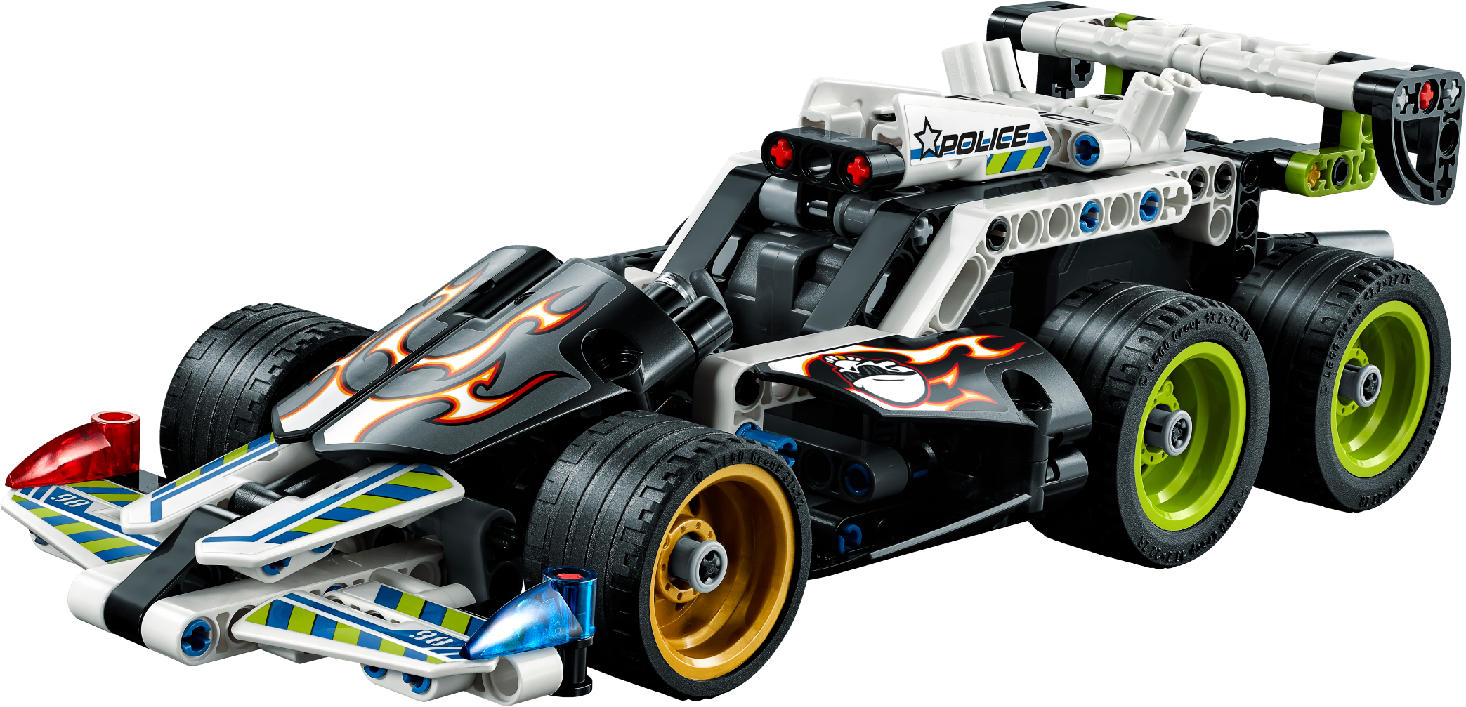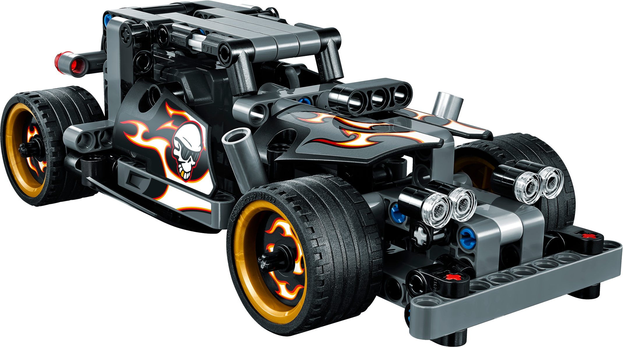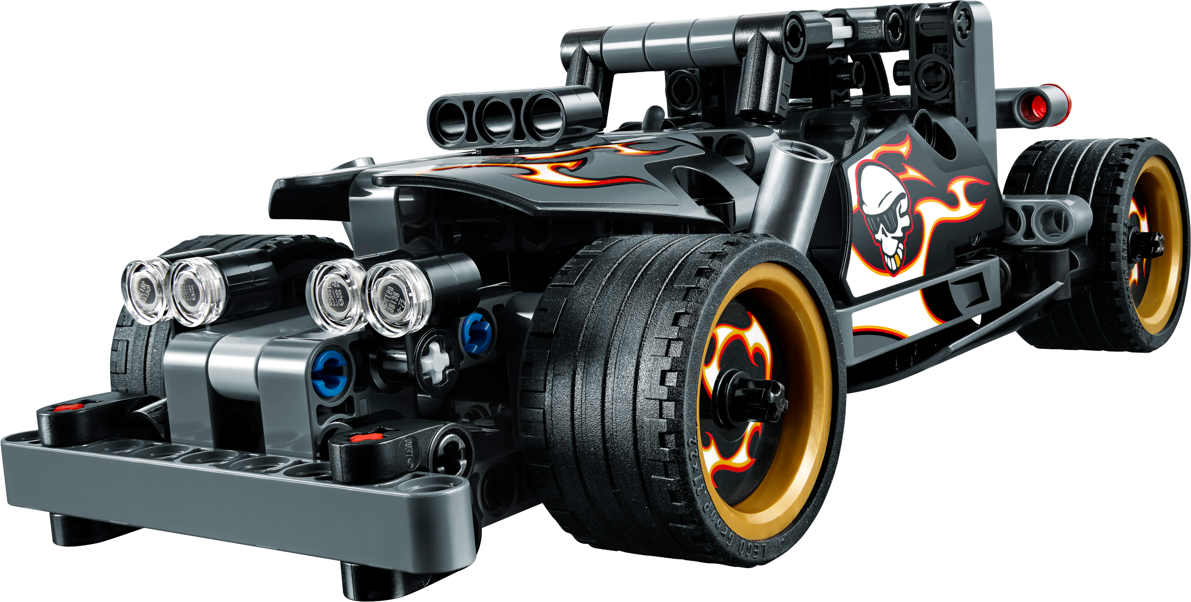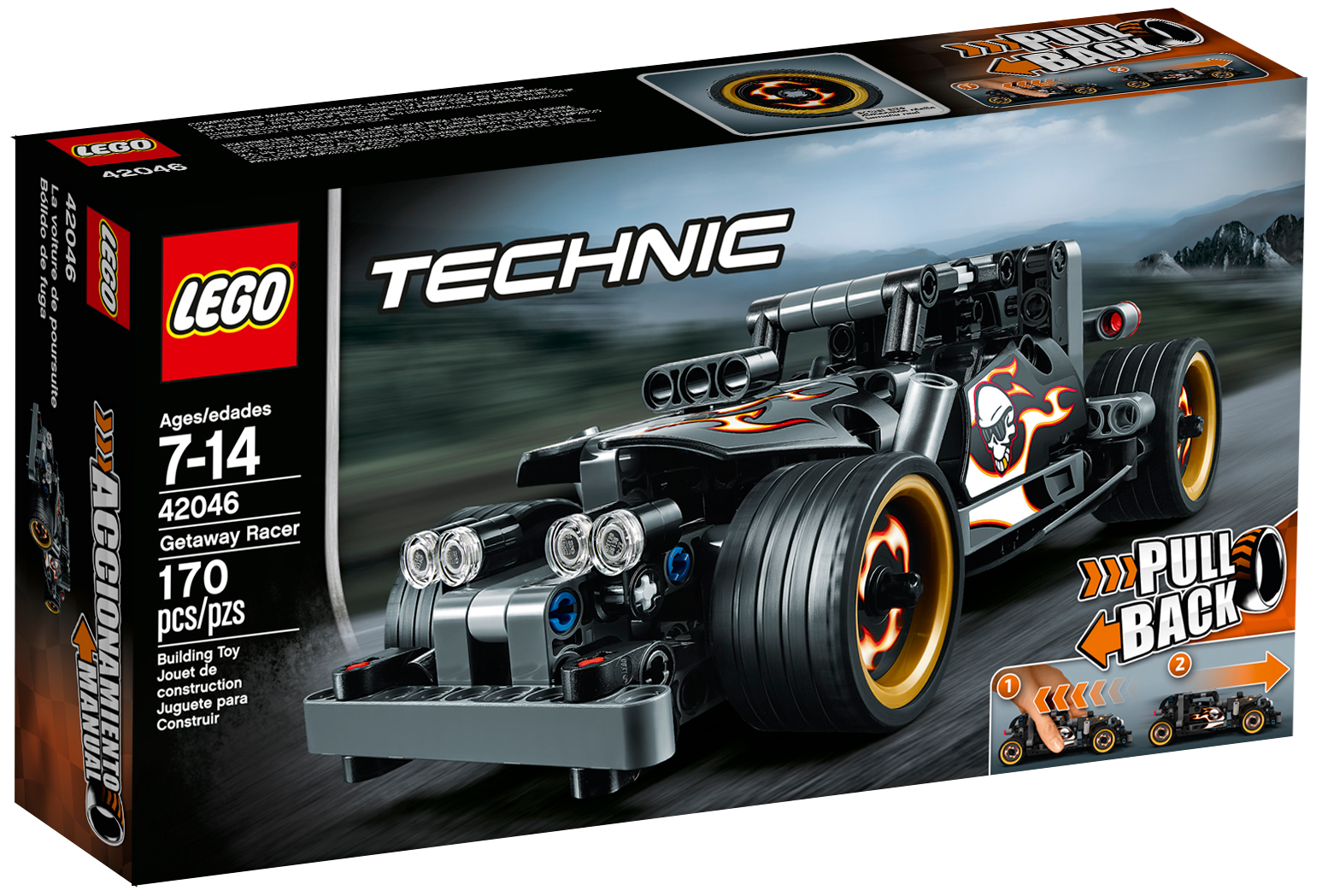 Make a quick exit with the Getaway Racer! Cruise the streets with this cool, powerful vehicle featuring massive extra-wide rims with low profile tires, huge vertical exhaust pipes, heavy-duty front bumper and awesome dark-gray and black color scheme with cool flame stickers for a real bad-guy look. Activate the powerful pull-back motor to make a quick getaway! Features a powerful pull-back motor, huge vertical exhaust pipes, extra-wide rims with low profile tires, and a heavy-duty front bumper. Check out the dark-gray and black color scheme with flame stickers. Bring on the 42047 Police Interceptor and let the chase begin. Activate the pull-back motor for a quick getaway. This LEGO® Technic model is designed to provide an immersive and rewarding building experience. Appropriate for children aged 7 to 14. Getaway Racer measures over2” (6cm) high, 7” (19cm) long and 3” (9cm) wide. Combine with the 42047 Police Interceptor to create an awesome Extreme Police Racer. Combi model Extreme Police Racer measures over 2” (7cm) high, 10” (26cm) long and 3” (10cm) wide.