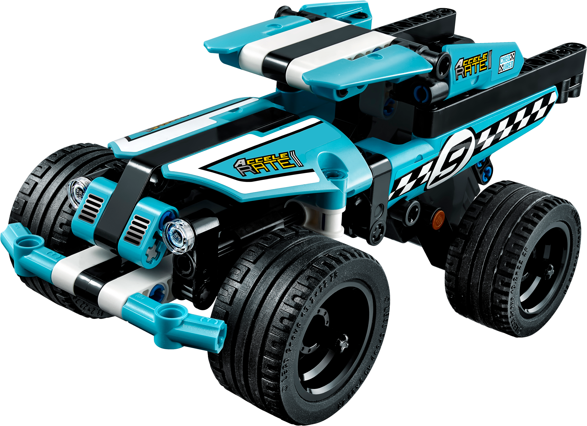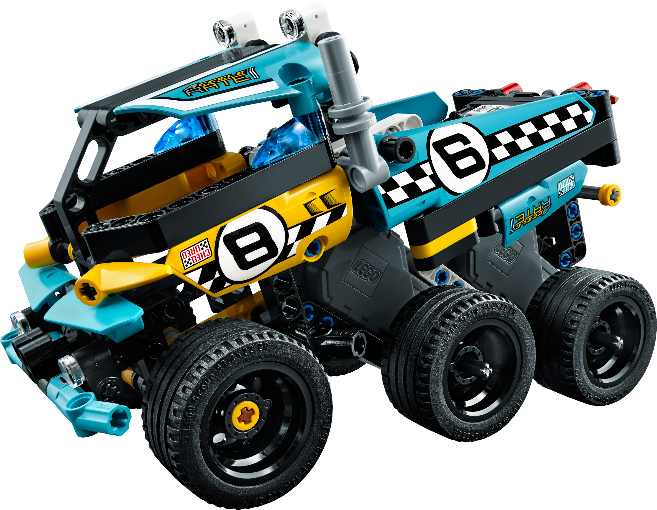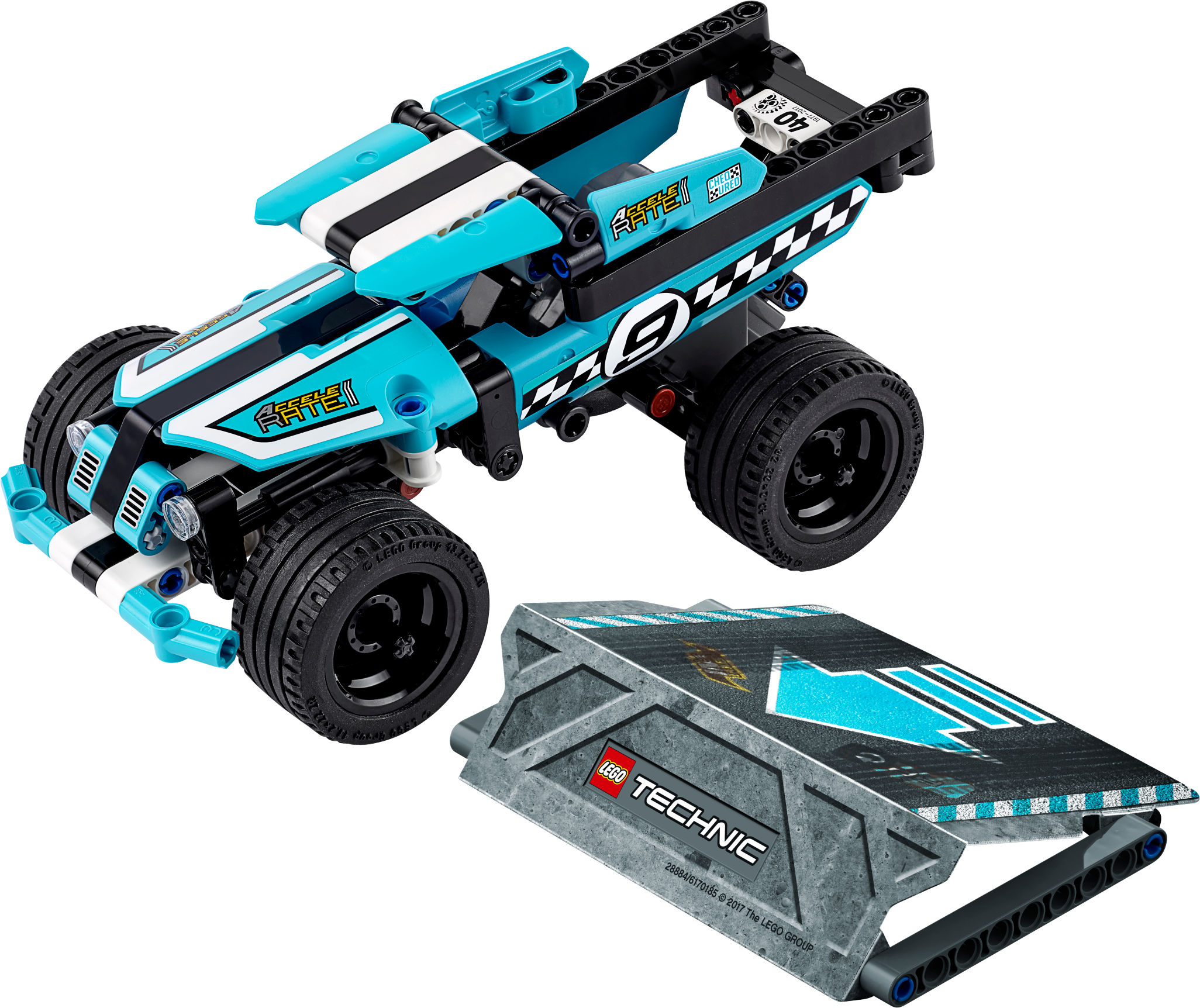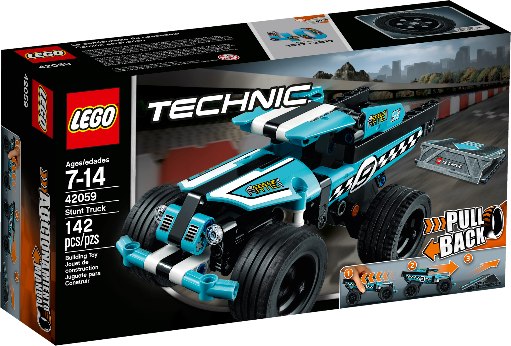 Perform amazing stunts with this high-speed LEGO® Technic Stunt Truck model, featuring a blue, black and white color scheme with checkered racing stickers, sturdy front bumper and wide blue rims with low profile tires. This Stunt Truck is also equipped with a pull-back motor, and comes with a buildable stunt ramp. Combine with the 42058 Stunt Bike pull-back model for extended play possibilities or to create the Power Racer combi model. Features a powerful pull-back motor, sturdy front bumper and wide blue rims with low profile tires. Includes a buildable stunt ramp. Check out the fresh blue, black and white color scheme with checkered racing stickers. Bring on the 42058 Stunt Bike and let the stunt competition begin. Activate the pull-back motor to send the high-speed Stunt Truck hurtling toward the stunt ramp. A uniquely decorated LEGO® Technic 40th Anniversary brick is included with this model. This LEGO®Technic model is designed to provide an immersive and rewarding building experience. This set offers an age-appropriate building experience for ages 7-14. Stunt Truck measures over 3” (8cm) high, 7” (18cm) long and 3” (9cm) wide. Ramp measures over 4” (12cm) wide, 3” (9cm) deep and under 1” (2cm) high. Combine with the 42058 Stunt Bike to create an awesome Power Racer combi model. Combi model Power Racer measures over 4” (11cm) high, 7” (19cm) long and 3” (9cm) wide.