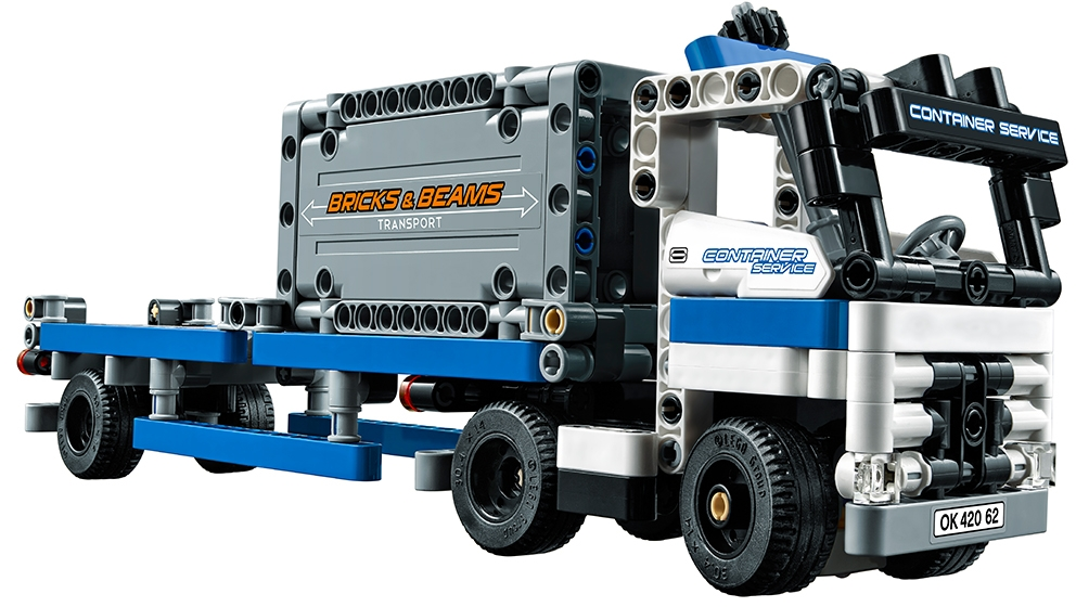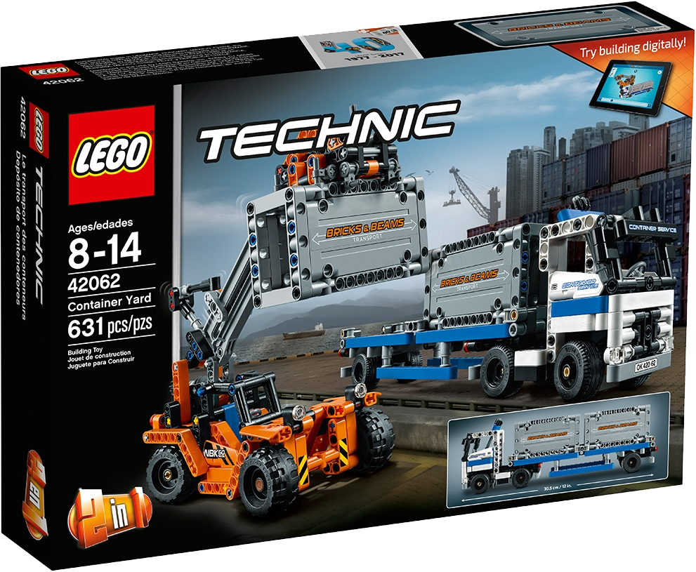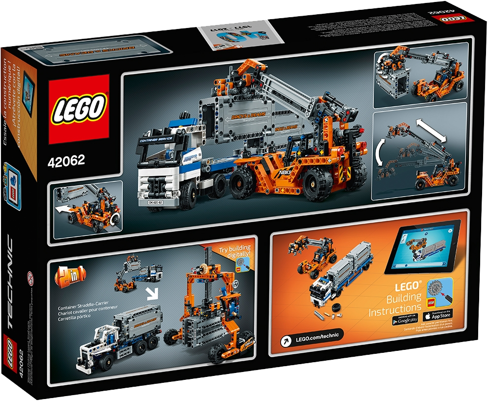 Enjoy a rewarding build-and-play experience with this robust and detailed 2-in-1 LEGO® Technic Container Yard set, featuring an articulated truck with working steering, opening doors, detachable trailer and two loadable containers, plus a container loader with working steering and extendable boom with working grabber. This set can be rebuilt to create a Container Straddle-Carrier with truck and container. Both models can be built using the free interactive, 3D digital LEGO Building Instructions app, available online.