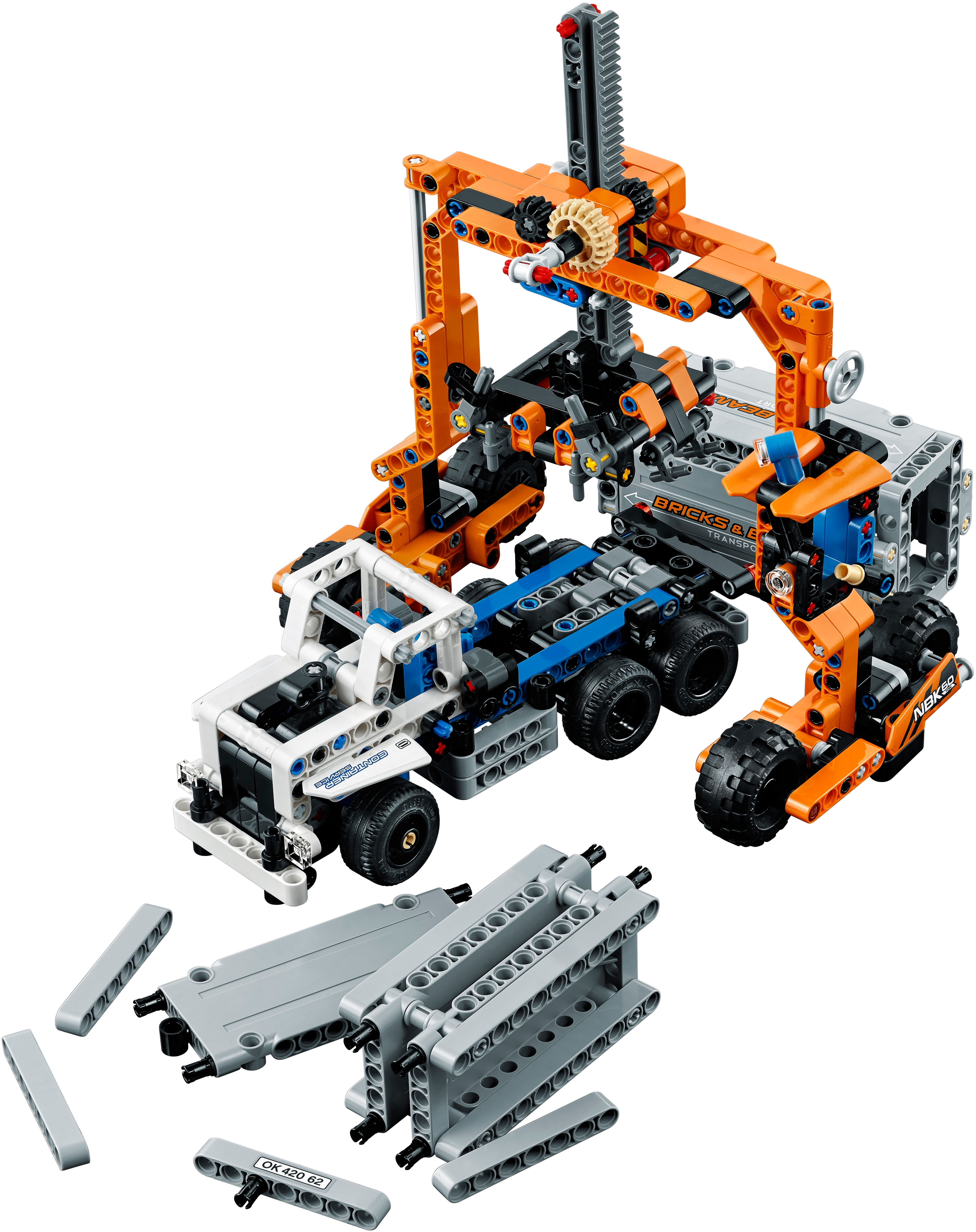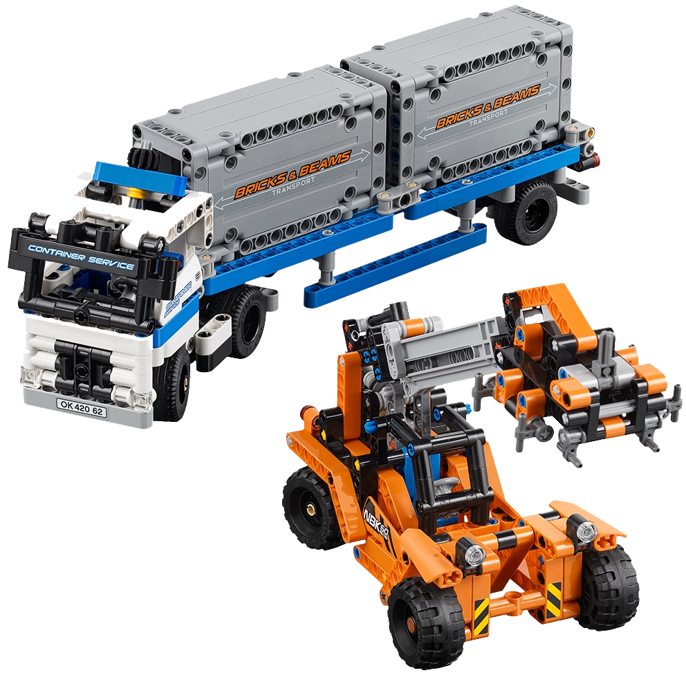 Features an articulated truck with working steering, opening doors, detachable trailer and two loadable containers, plus a container loader with working steering and an extendable boom with working grabber.