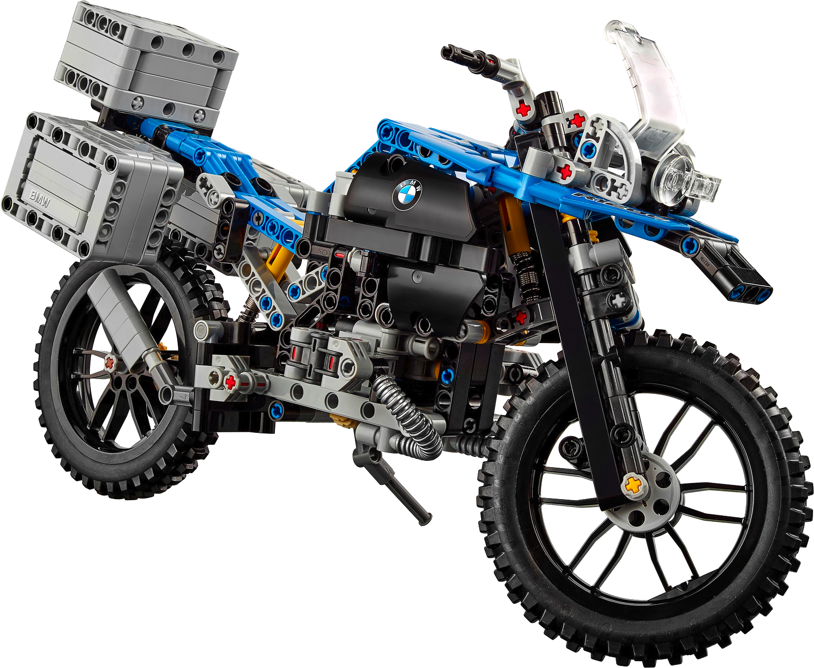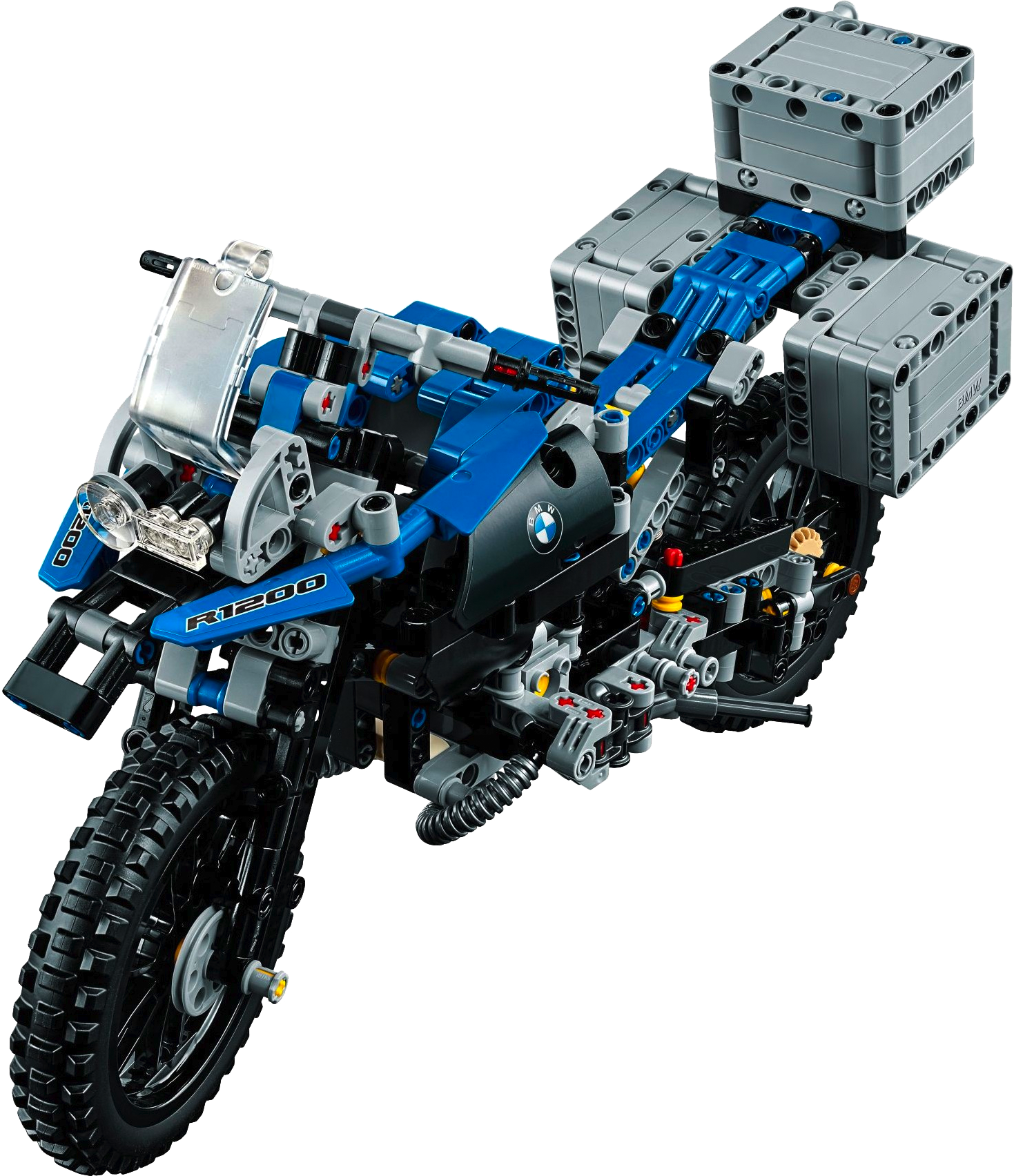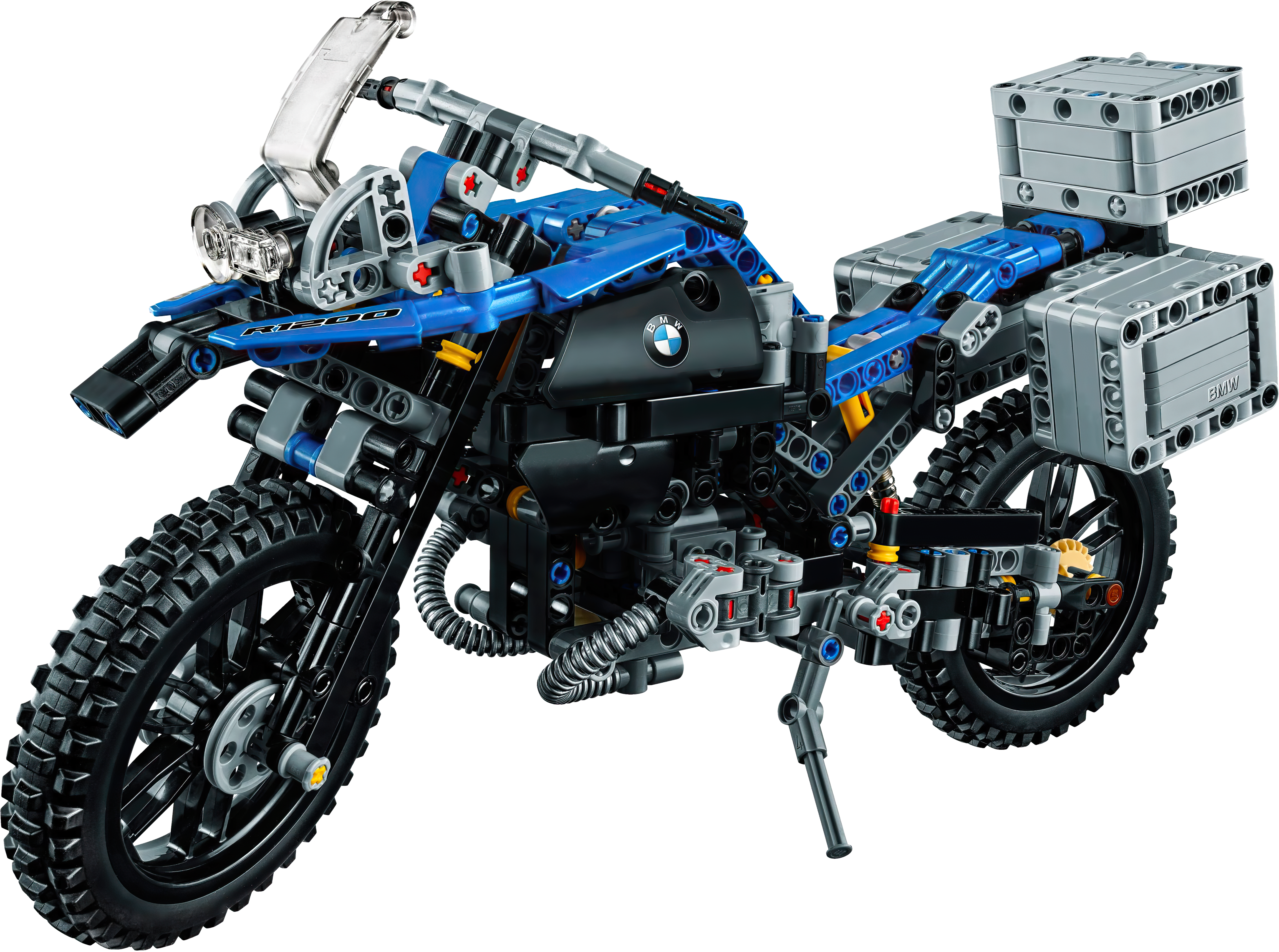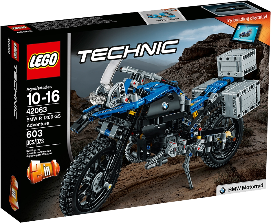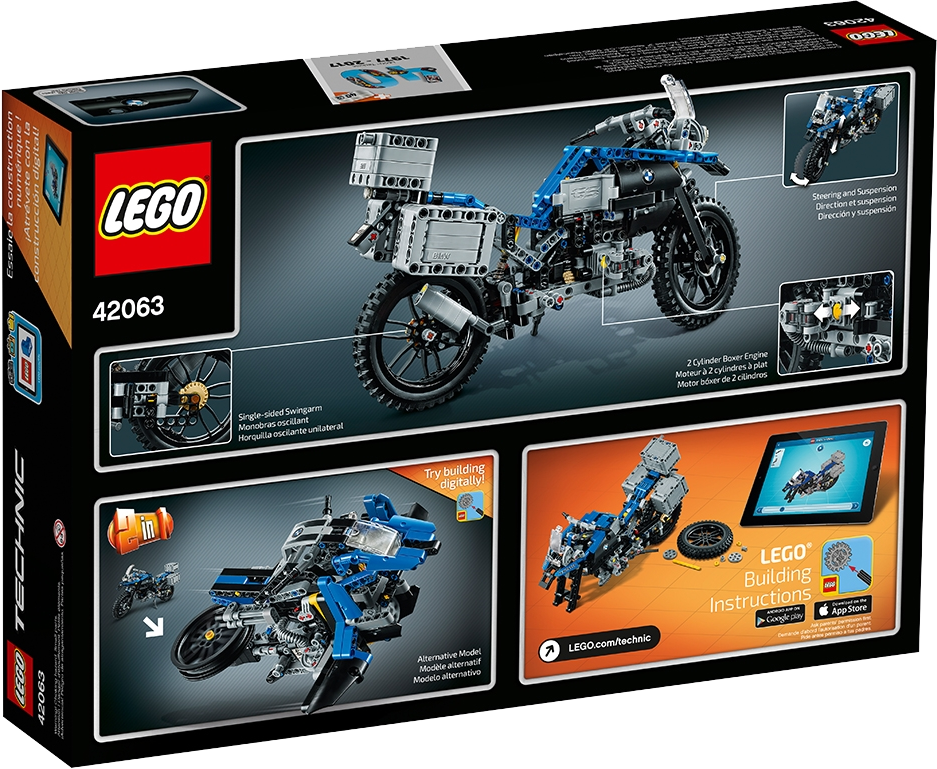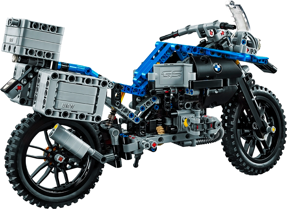 Explore the high-tech innovation of the BMW R 1200 GS Adventure with this authentic LEGO® Technic replica, featuring a blue and black color scheme, black spoke wheels with all-terrain tires, windshield and a detailed dashboard and exhaust. Functions include handlebar steering, front and rear suspension, two-cylinder boxer engine with moving pistons, visible shaft drive, opening top case and luggage panniers, and a kickstand. This 2-in-1 model has been designed to provide an immersive and rewarding building experience. It was developed in partnership with BMW and rebuilds into a unique concept model, created in collaboration with BMW designers. A free interactive, 3D digital LEGO® Building Instructions app is available online, for both models.