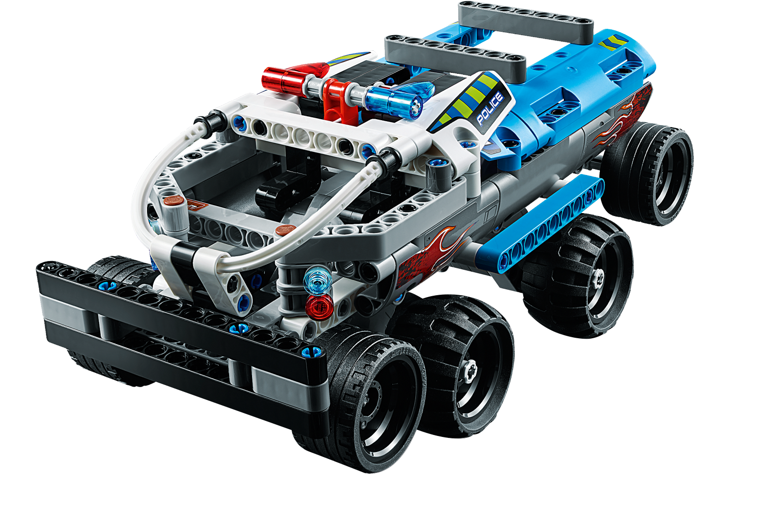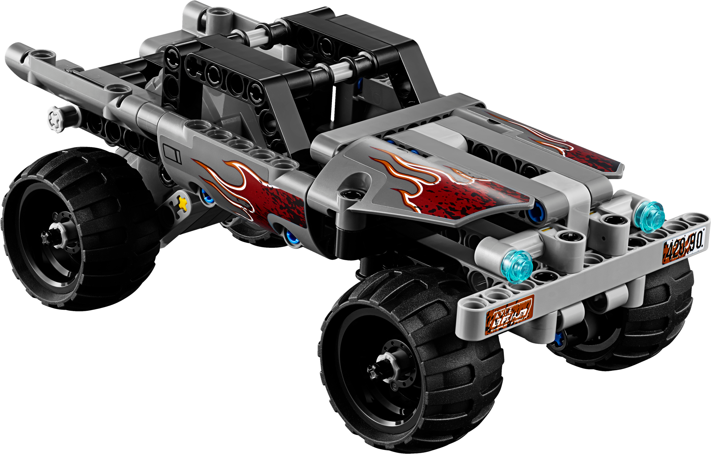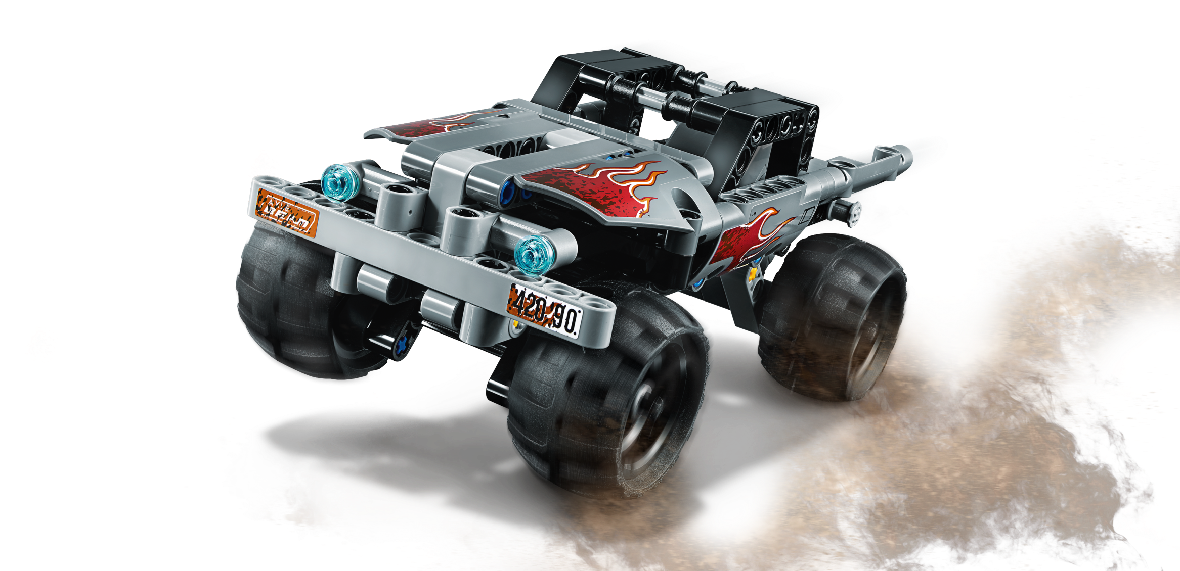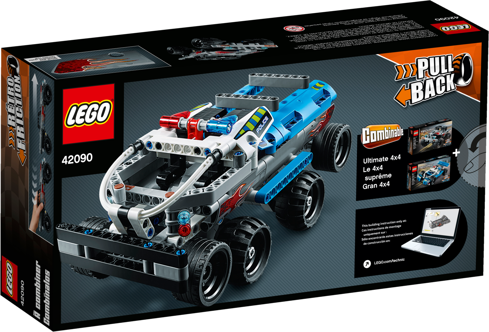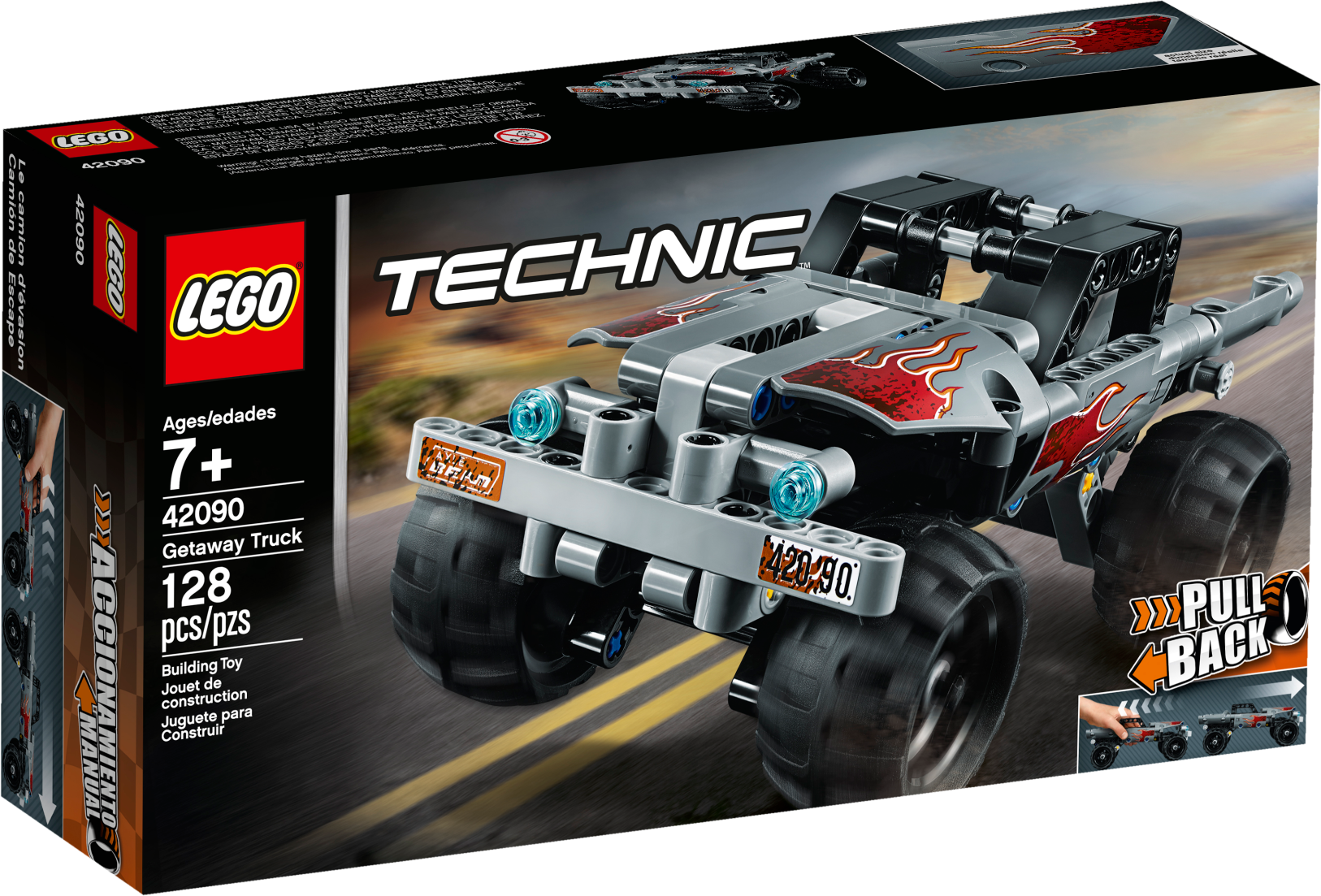 Enjoy high-speed action with the LEGO® Technic™ 42090 Getaway Truck, featuring a rugged design with extra-wide rims and huge chunky tires, 2 large side-mounted exhaust pipes, heavy-duty front bumper and a red, black and gray color scheme with flame stickers for a distinct bad-guy look! This robust model truck is also equipped with a powerful pull-back motor. Combine it with the 42091 Police Pursuit pull-back for action-packed car chases, or to create the Ultimate 4x4 combi model. Features a powerful pull-back motor, extra-wide rims, huge chunky tires, 2 large side-mounted exhaust pipes and a heavy-duty front bumper. Check out the red, black and gray color scheme with flame stickers for a distinct bad-guy look! Bring on the 42091 Police Pursuit pull-back and let the chase begin! Activate the pull-back motor to launch the super-rugged Getaway Truck. This play vehicle will help budding LEGO® Technic™ builders develop their motor and creative skills. Combine with the 42091 Police Pursuit pull-back to create the awesome Ultimate 4x4 combi model! Getaway Truck measures over 2” (7cm) high, 7” (18cm) long and 3” (10cm) wide. Ultimate 4x4 combi model measures over 3” (10cm) high, 9” (23cm) long and 3” (10cm) wide.