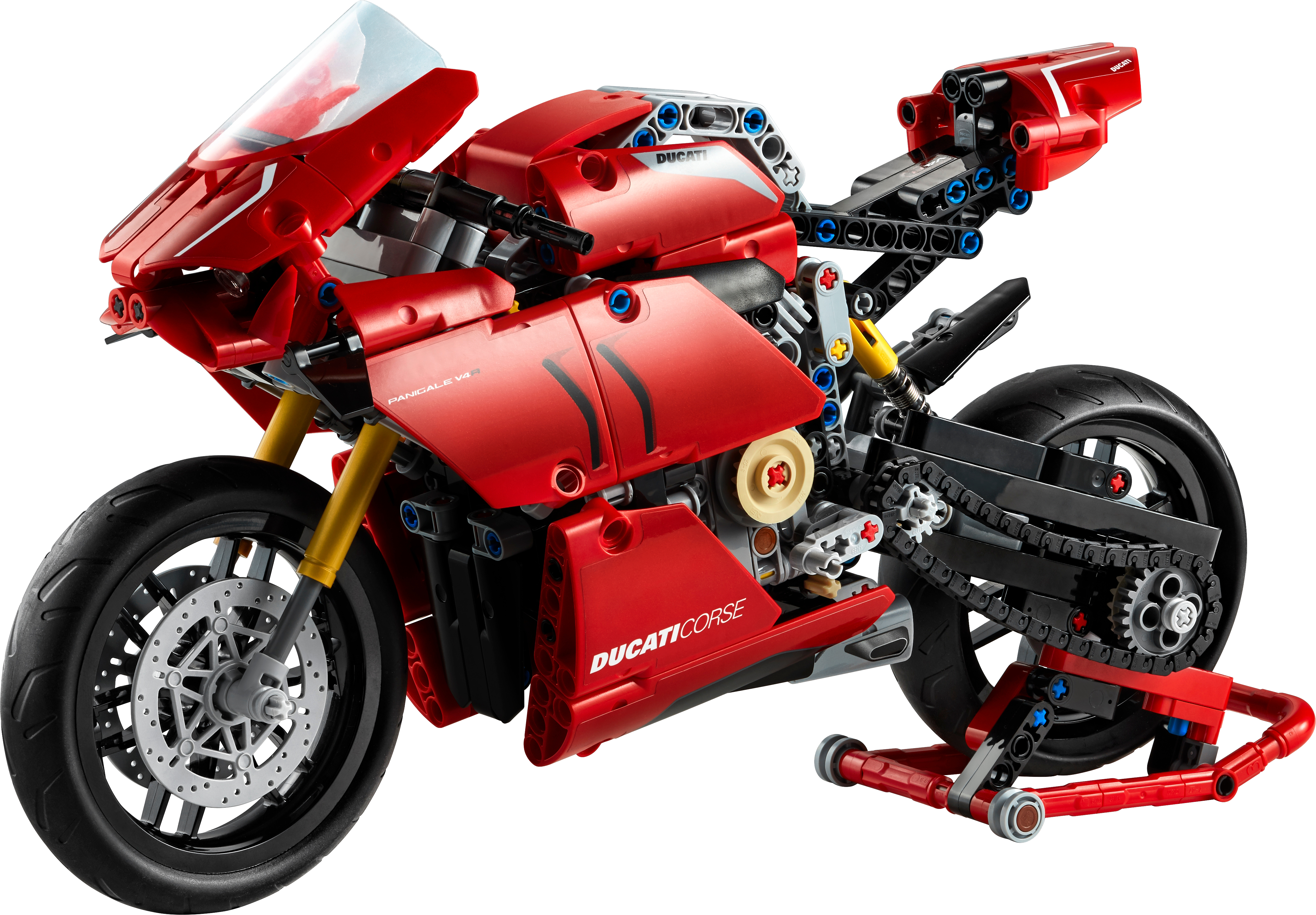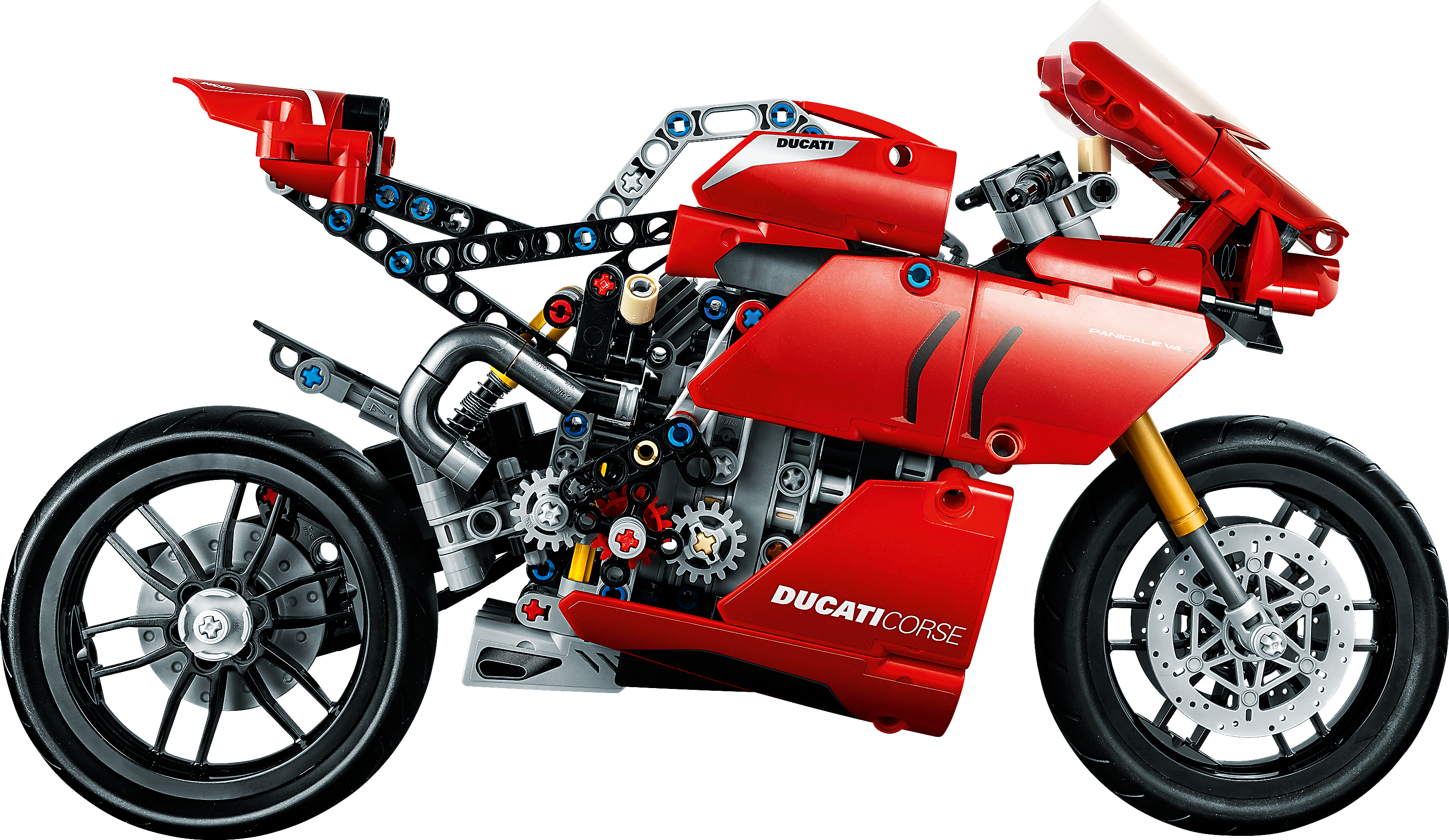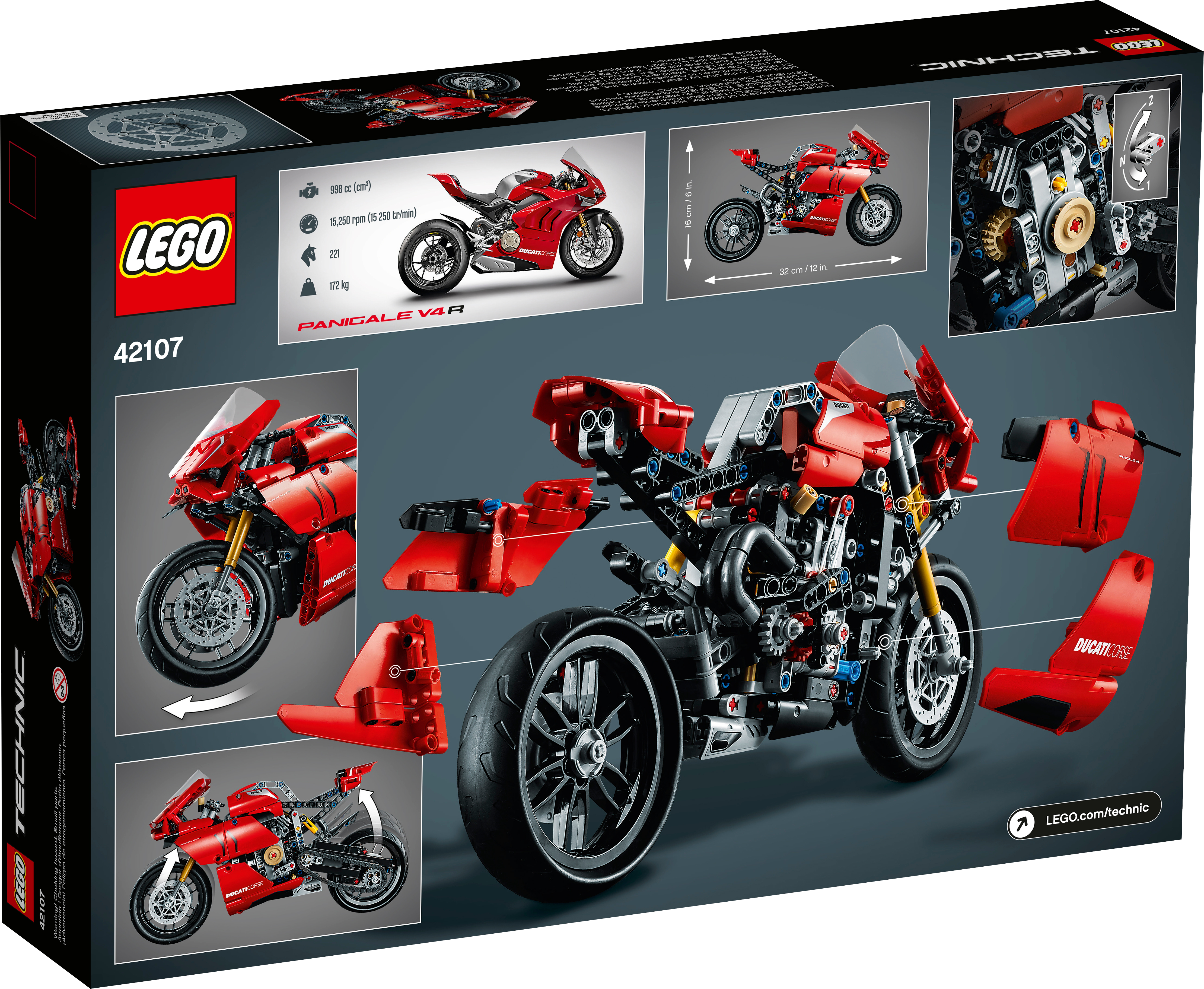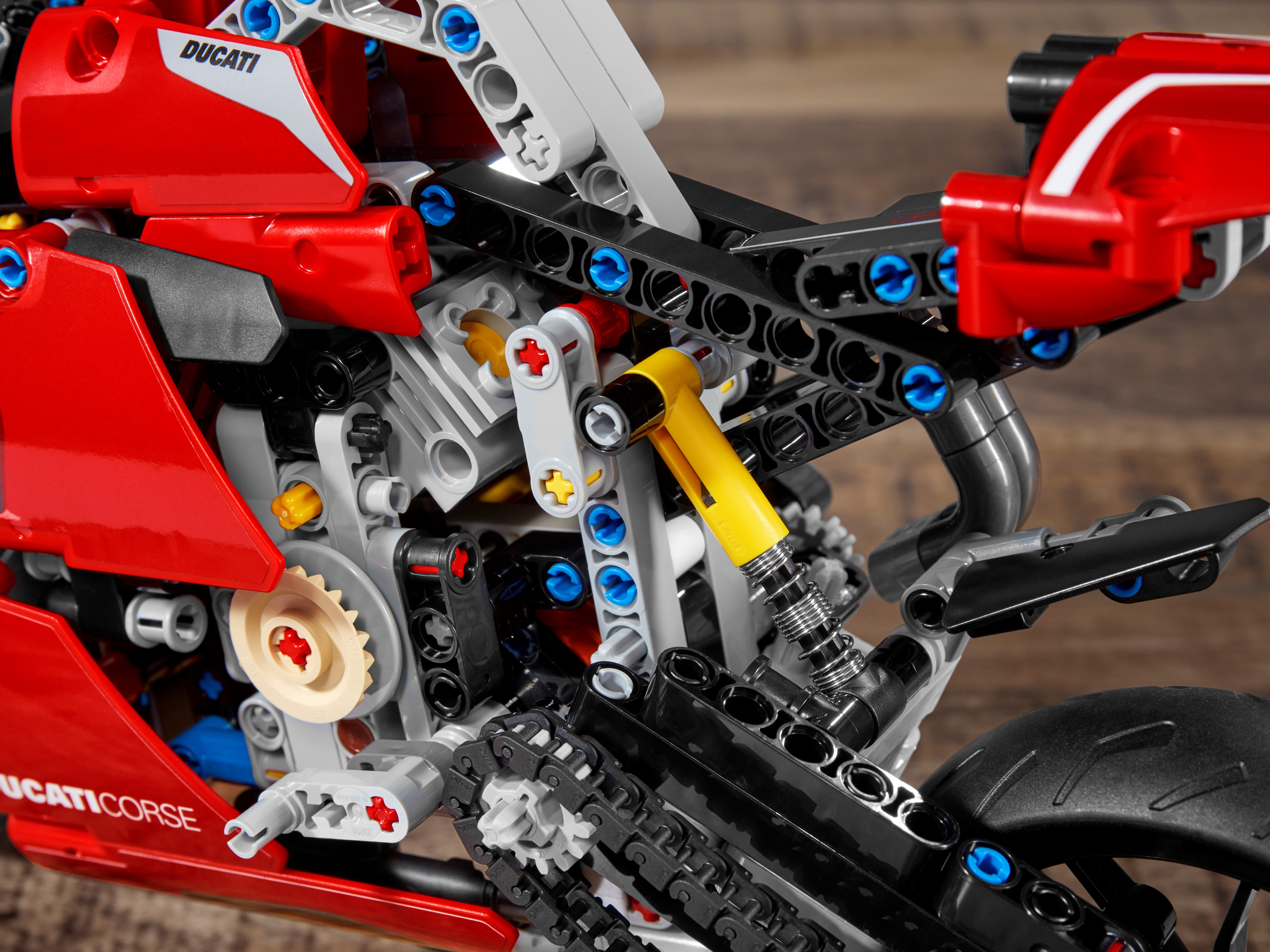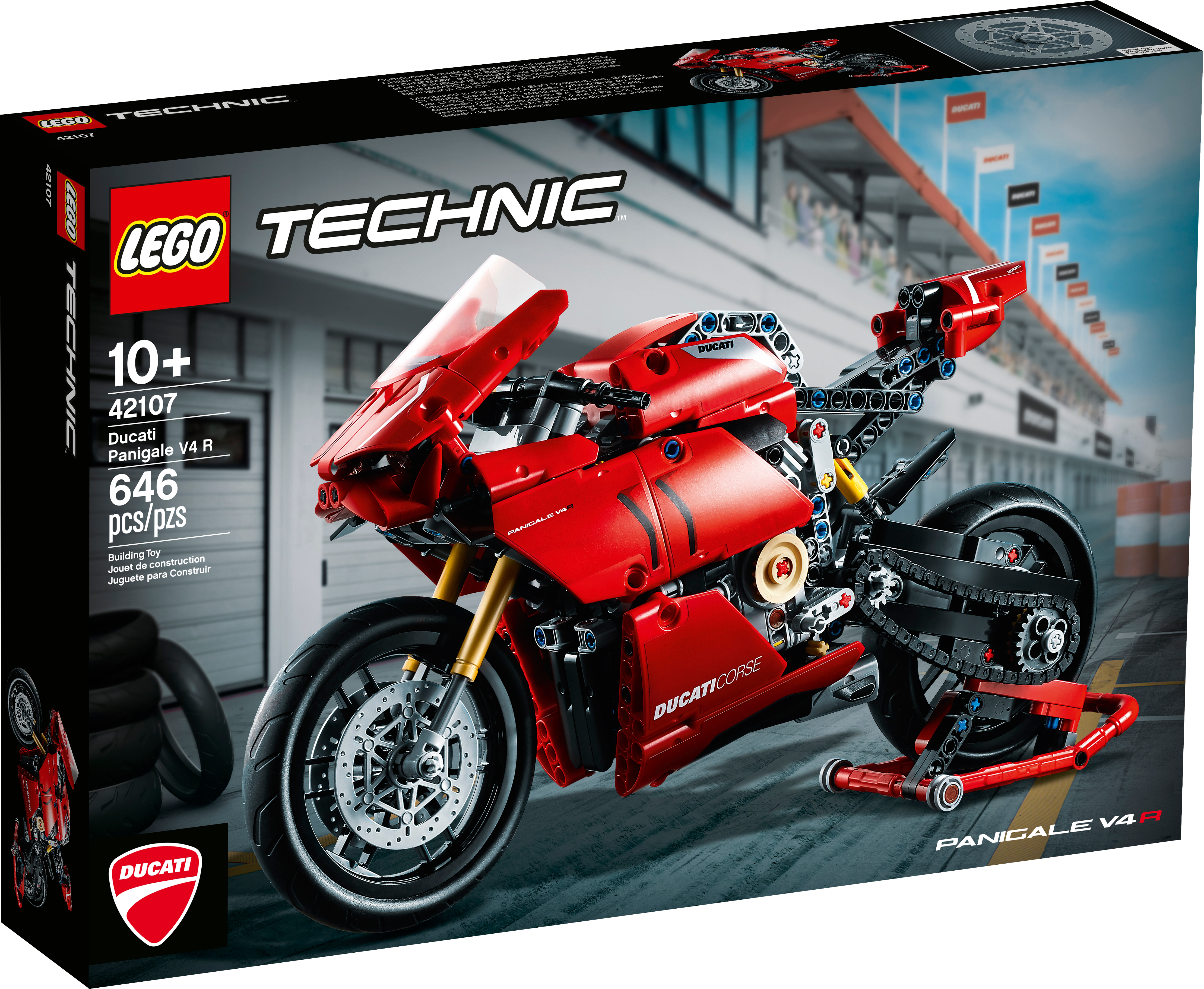 Style, sophistication, performance. With breathtaking looks, this LEGO® Technic™ 42107 Ducati Panigale V4 R captures the spirit and design of the original. It’s the first model motorcycle in LEGO Technic history to include a gearbox for exploring different speeds and techniques. Other amazing features include steering, front and rear suspension for realistic movement, plus front and rear disc brakes.Amazing details capture the spirit of DucatiDucati fans will appreciate the attention-to-detail in this amazing motorcycle replica. A kickstand, exhaust pipe, windshield and dashboard add the little details that make this model toy so true to the full-size version. And of course, the classic red color scheme is sure to quicken the pulse of any Ducati fan.Build and learn with LEGO Technic model toysAs part of the LEGO Technic universe, this motorcycle model kit provides an immersive and rewarding building experience. With realistic features, it introduces builders to the world of engineering, as they discover how gear mechanisms work.A representation of the famous Ducati Panigale V4 R to build, explore and display. LEGO® Technic™ fans and motorcycle enthusiasts will love this stunning building challenge.Build your own Ducati Panigale V4 R to gain a unique insight into the features and functions that make up this iconic motorcycle. Also includes a 2-speed gear-box – a first for LEGO® Technic™ motorcycles.Recreate the thrill of owning a Ducati Panigale V4 R, with front and rear suspension for realistic model movement. The classic red color scheme brings the motorcycle to life, with true Italian flair.Looking for the best gifts for motorbike fans? This is a great choice. It’s also a super challenge for LEGO® Technic™ fans aged 10+ who will get a thrill from seeing how a motorcycle works.This eye-catching model (42107) looks stunning on display. Its dimensions have been designed to give a true representation of the real-life model. Measures over 12” (32cm) long, 6” (16cm) high and 3” (8cm) wide.No batteries are needed for this Ducati motorbike toy. Passion, imagination and a desire to discover something new are all you need.It’s easy to get started with this amazing LEGO® set. Just open the box and you’ll find easy-to-follow instructions so building the Ducati toy motorcycle can begin straightaway.LEGO® Technic™ engineering toys are designed to provide an immersive and rewarding building experience, featuring realistic movement and mechanisms to help kids and adults explore the world of engineering.Quality is important. So, it’s good to know LEGO® building kits meet the highest industry standards ensuring they connect easily every time – it’s been that way since 1958.LEGO® Technic™ plastic model toys are put through their paces. Each one is thoroughly tested to make sure every building toy meets the highest global safety and quality standards.