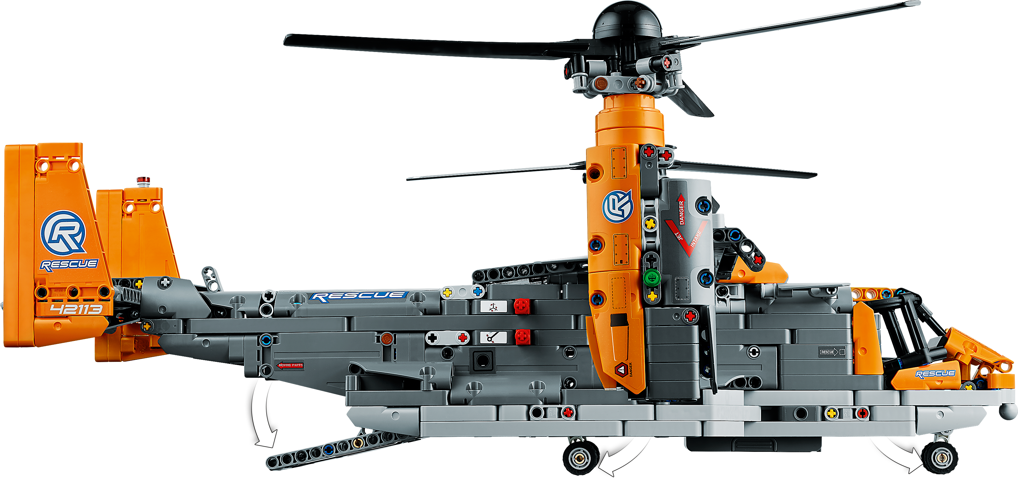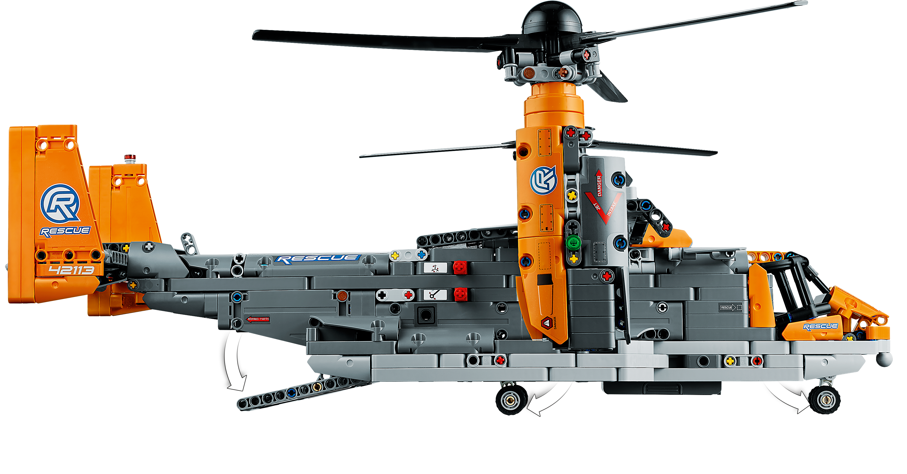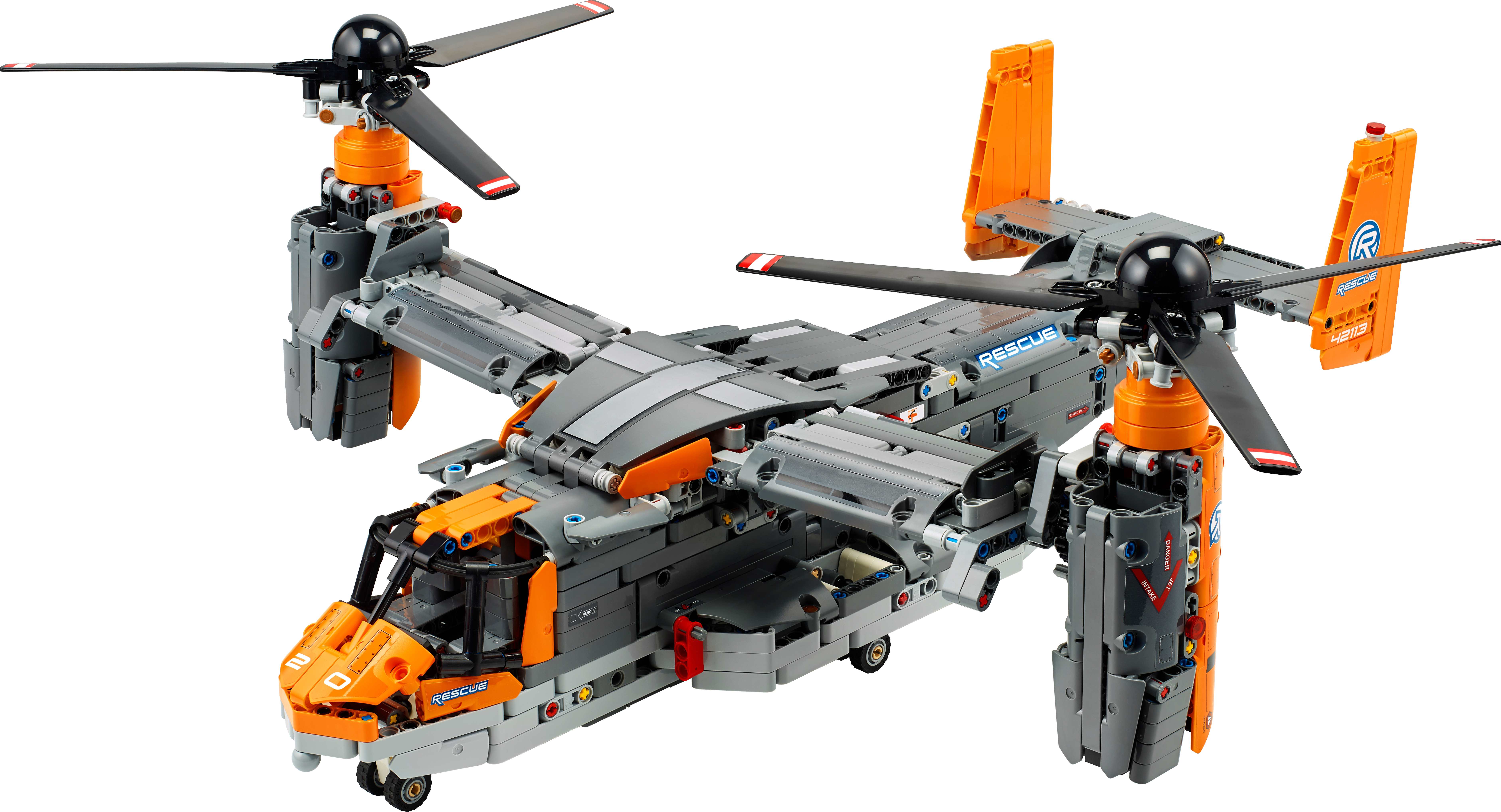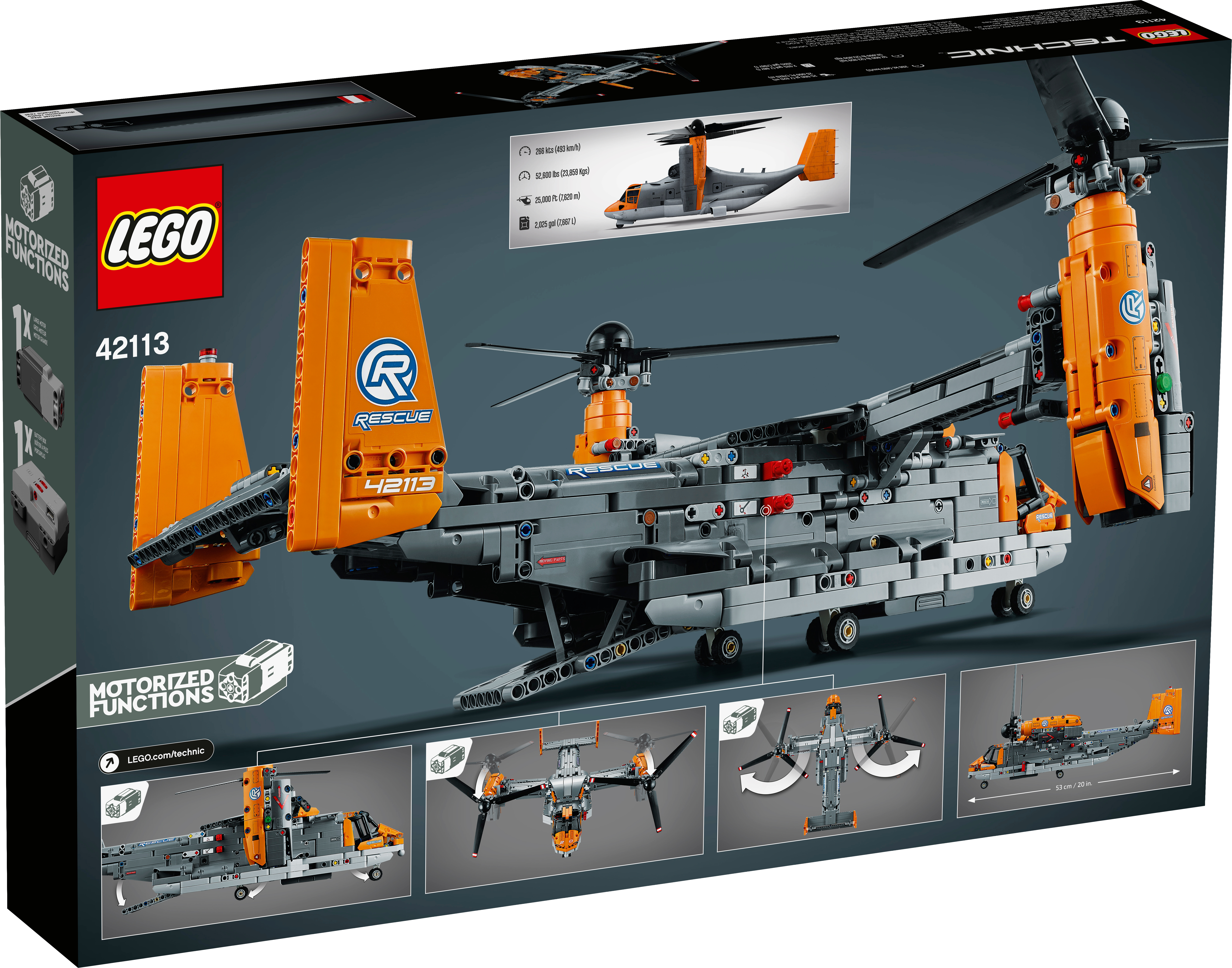 Packed with realistic details for imaginative play Kids will love exploring this feature-packed aircraft. Power up your build with the included battery box and large motor to bring the toy aircraft model to life. Control the retractable landing gear and rotate the nacelles to switch from vertical take-off mode to flight mode. Authentic details include a gearbox with four different functions, plus an opening cargo bay door and spinning propellers.