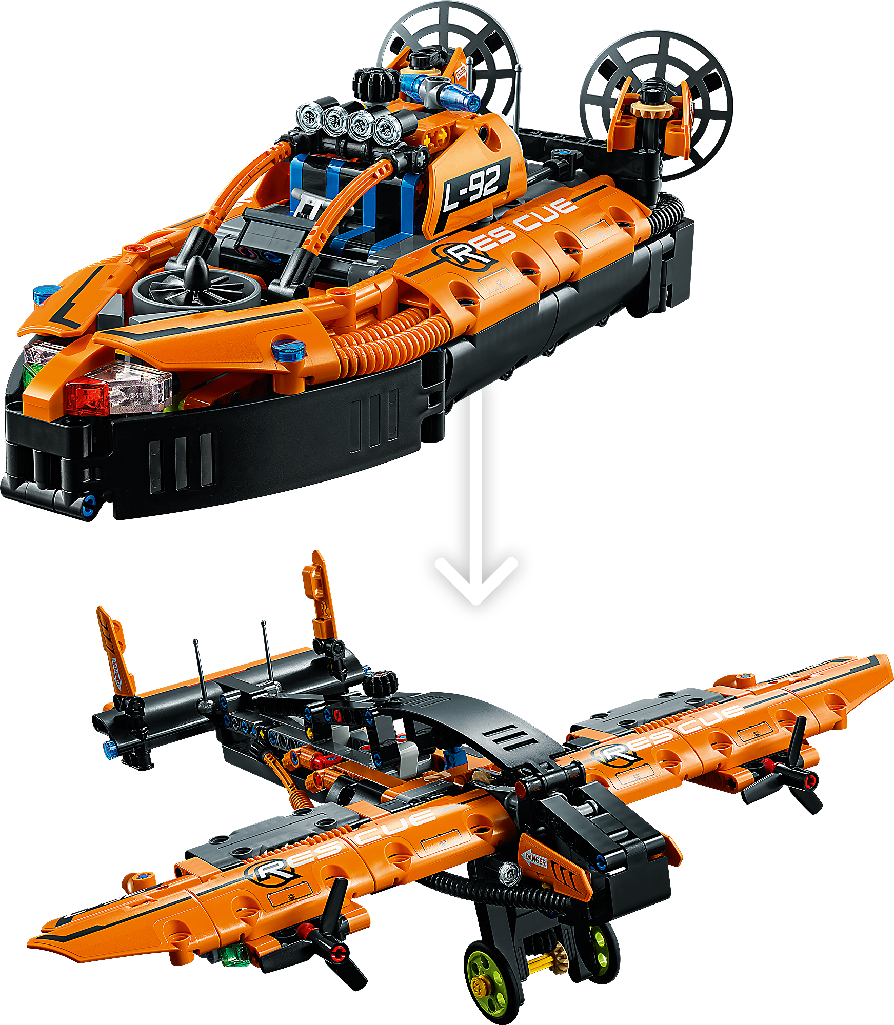 The 2-in-1 design means more role-play fun for young heroes. Rebuild the model hovercraft to create a Twin-Engine Aircraft with moving rudders and ailerons.