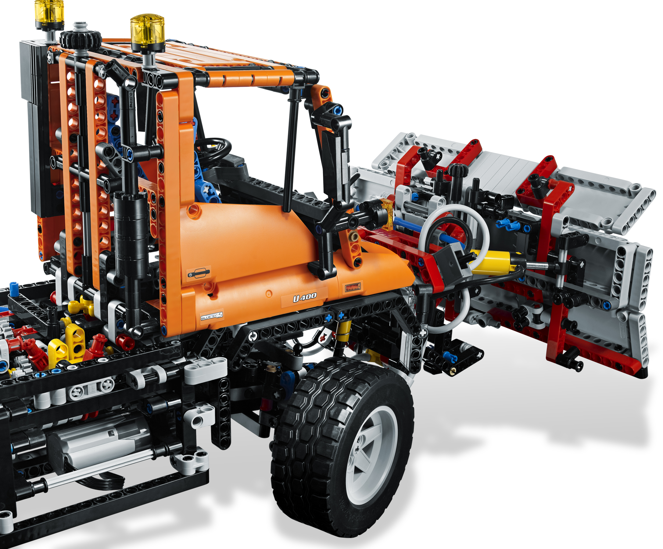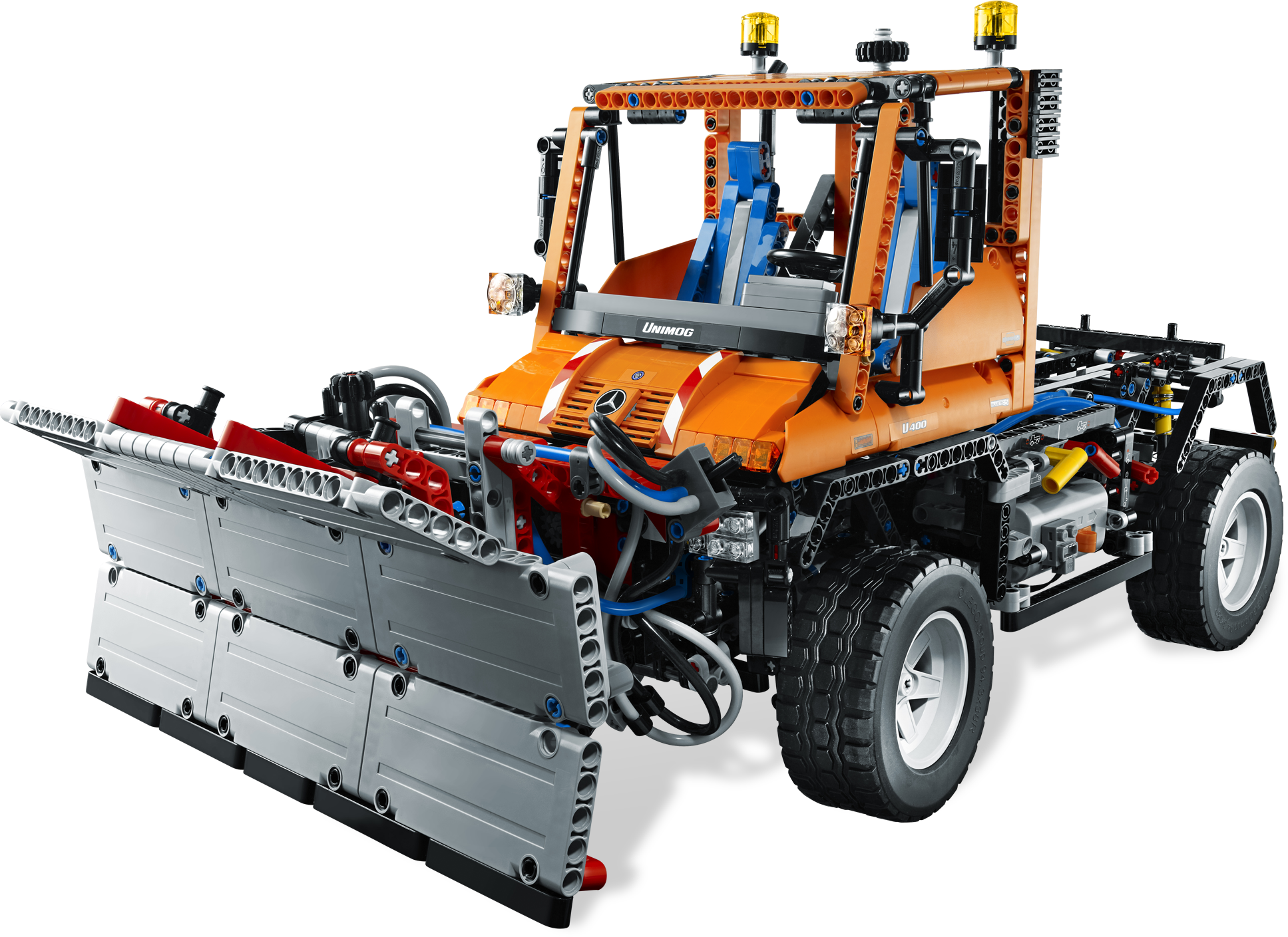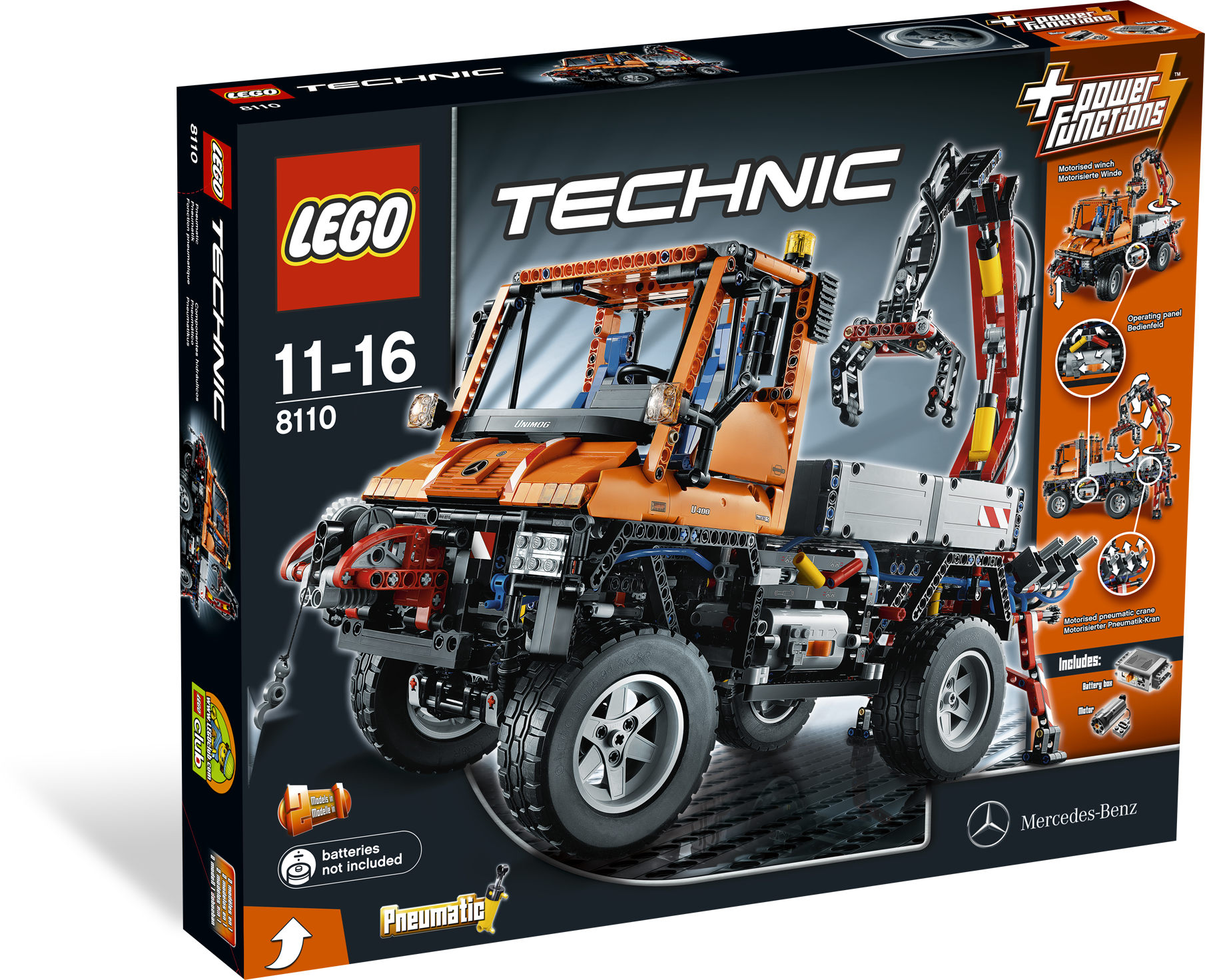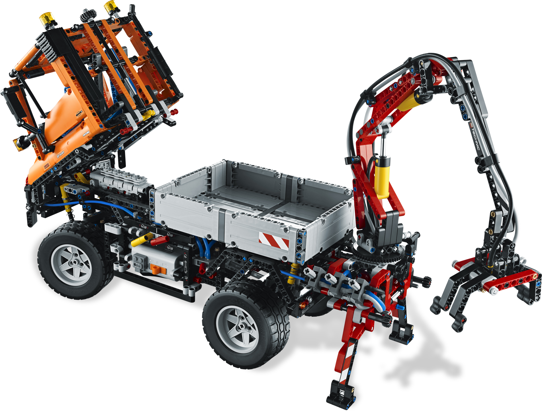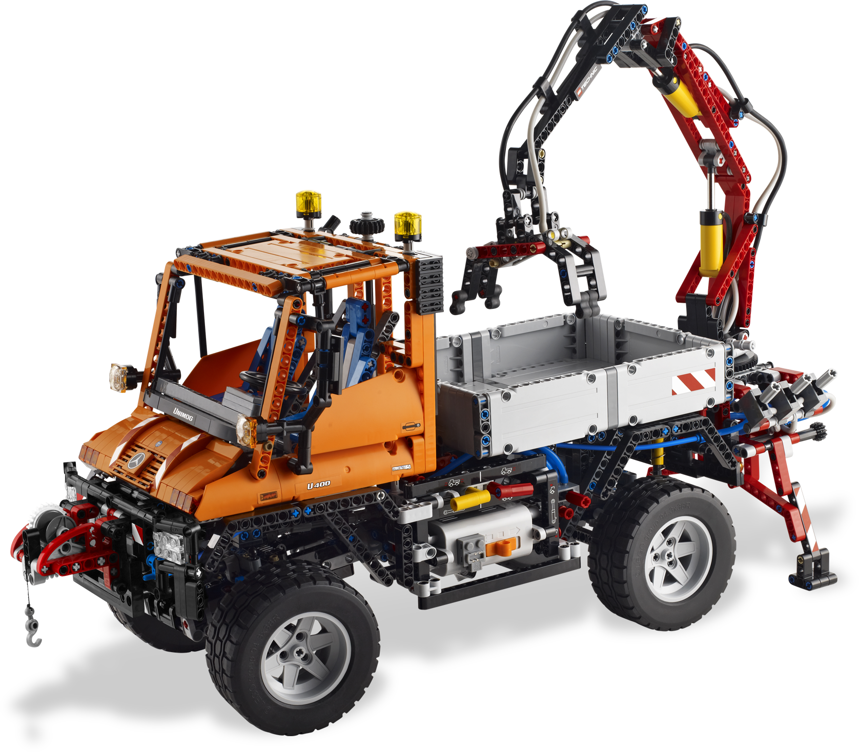 No job is too big for the multi-purpose Mercedes-Benz Unimog U 400! Featuring a pneumatically powered, articulated crane with working grabber and a recovery winch on the front – this mechanical monster is driven by LEGO® Power Functions. The high-tech design features working steering, 4-wheel drive and suspension, a gear block for extreme ground clearance and a detailed engine with moving pistons. Rebuild the crane and winch into a huge snow plow.